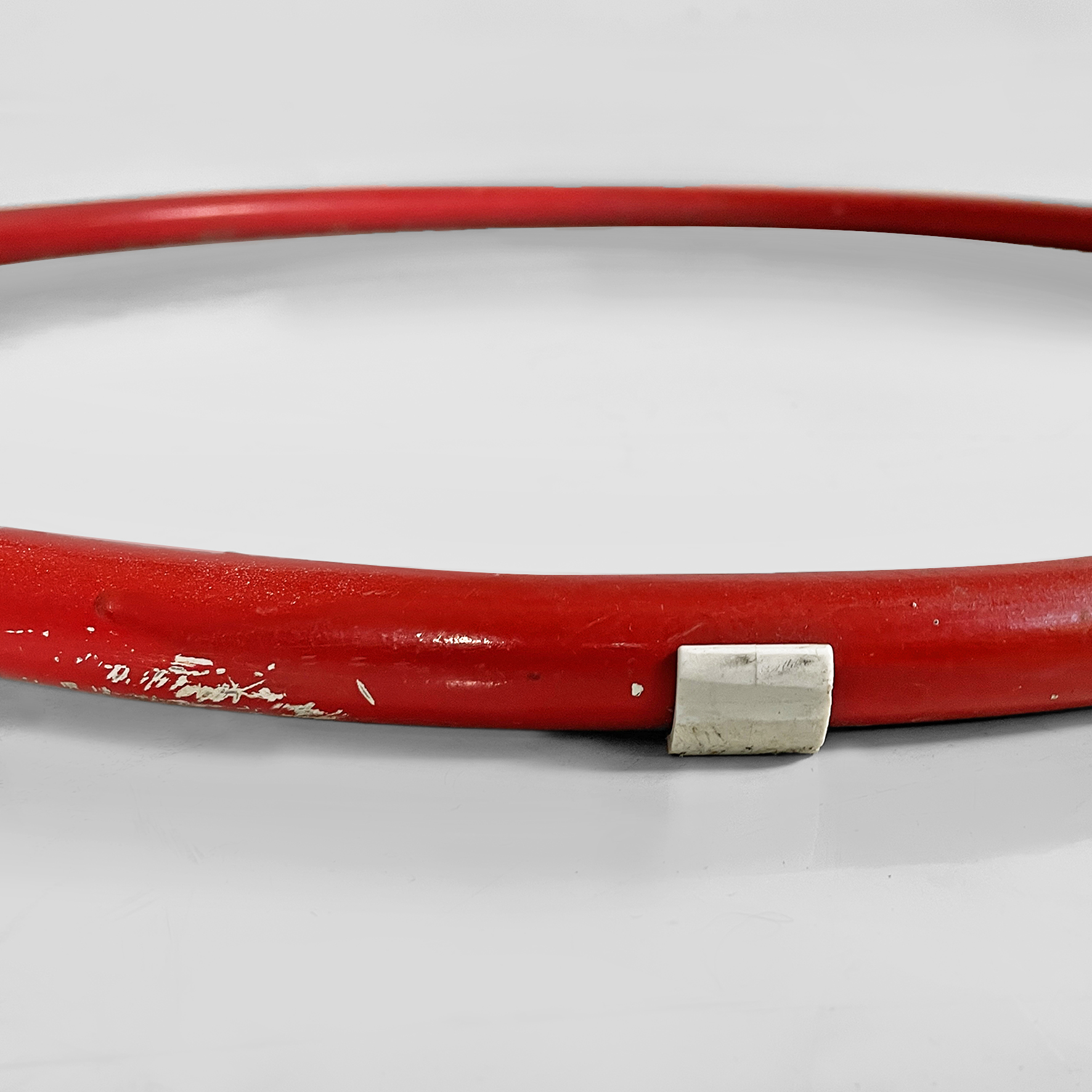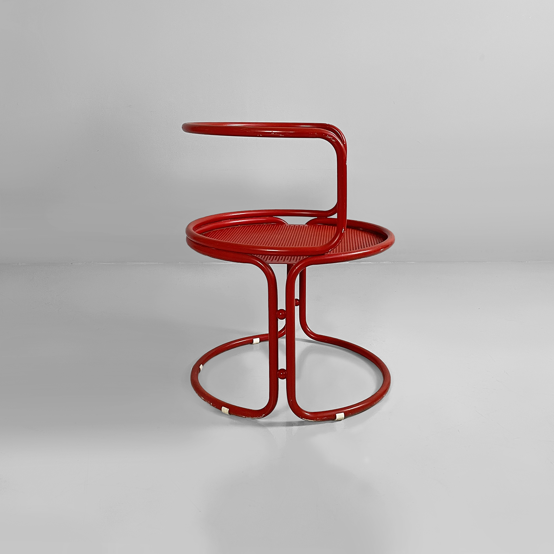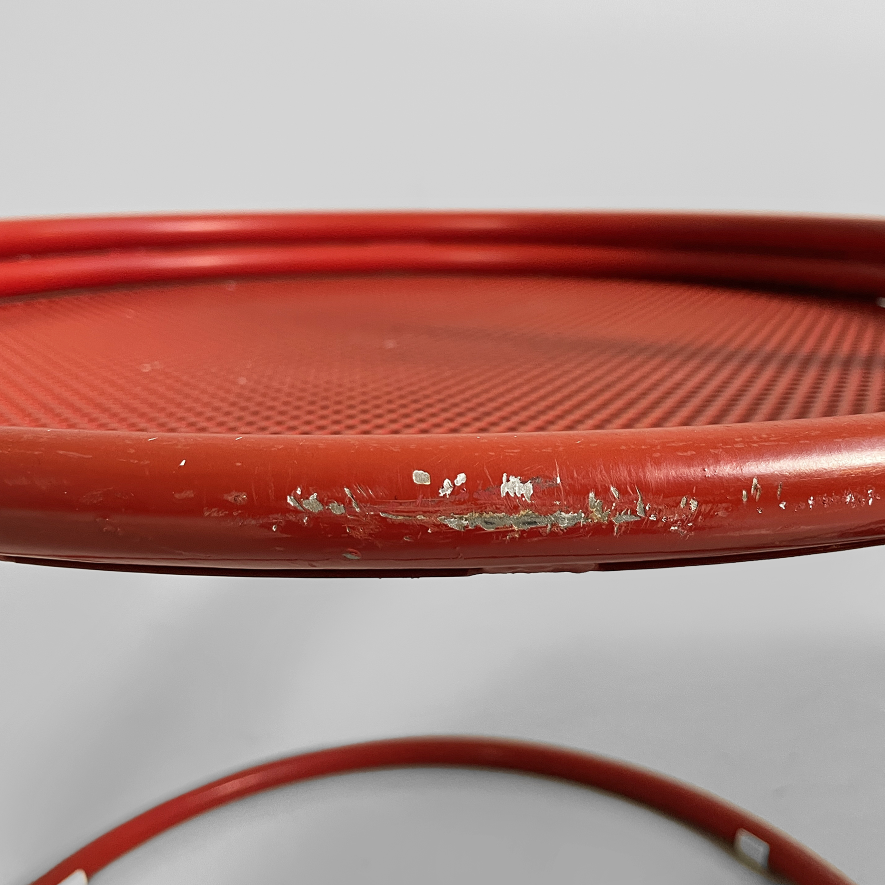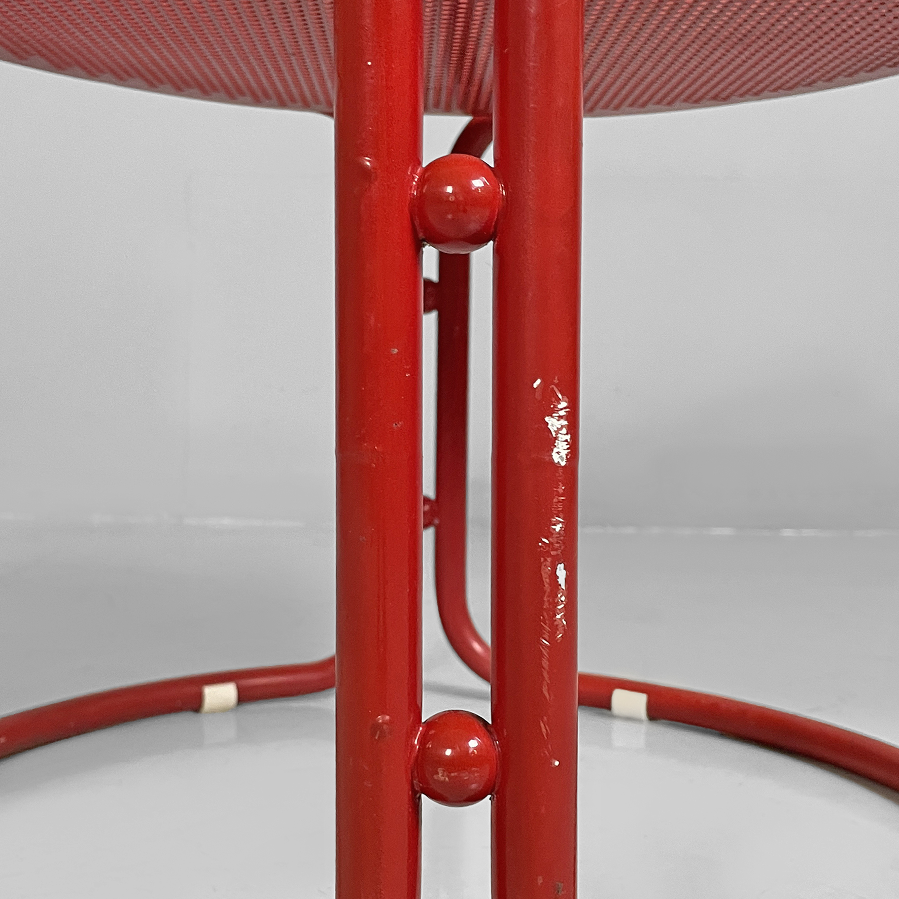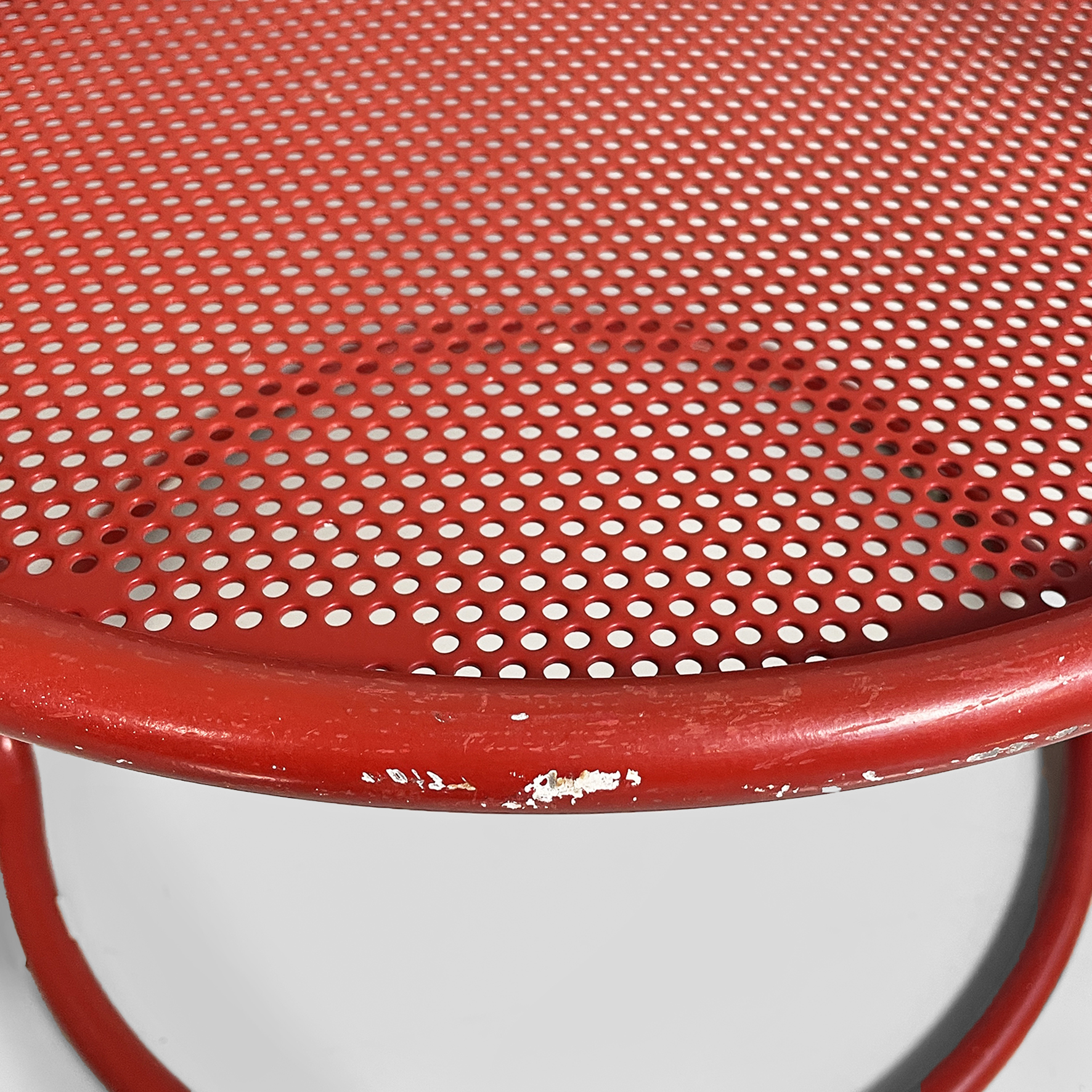 Coppia di sedie interamente in metallo verniciato rosso. La seduta tonda è in lamiera traforata. La struttura, i braccioli, lo schienale e le zampe sono in tubolare di metallo. Adatte ad uso esterno come in giardino.
