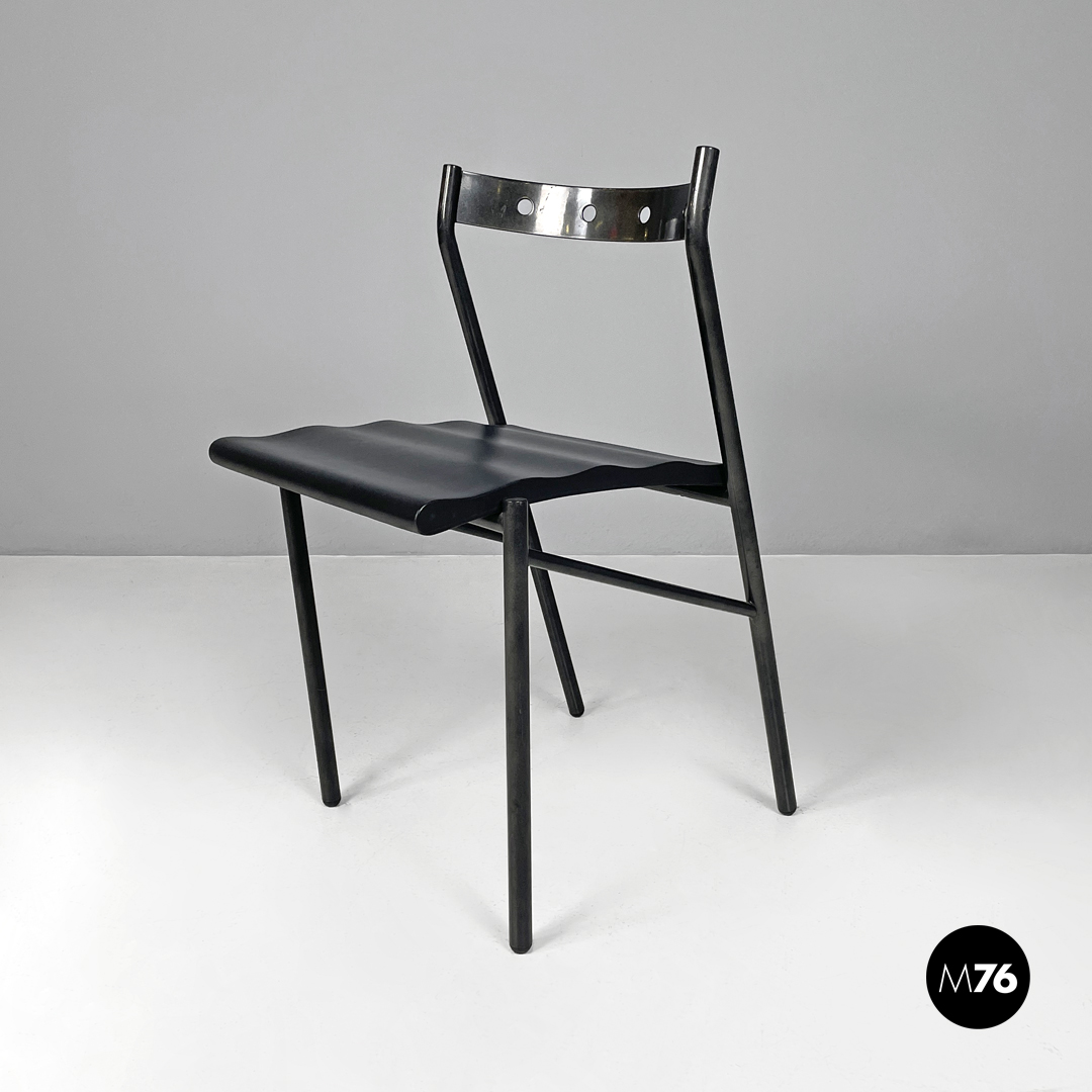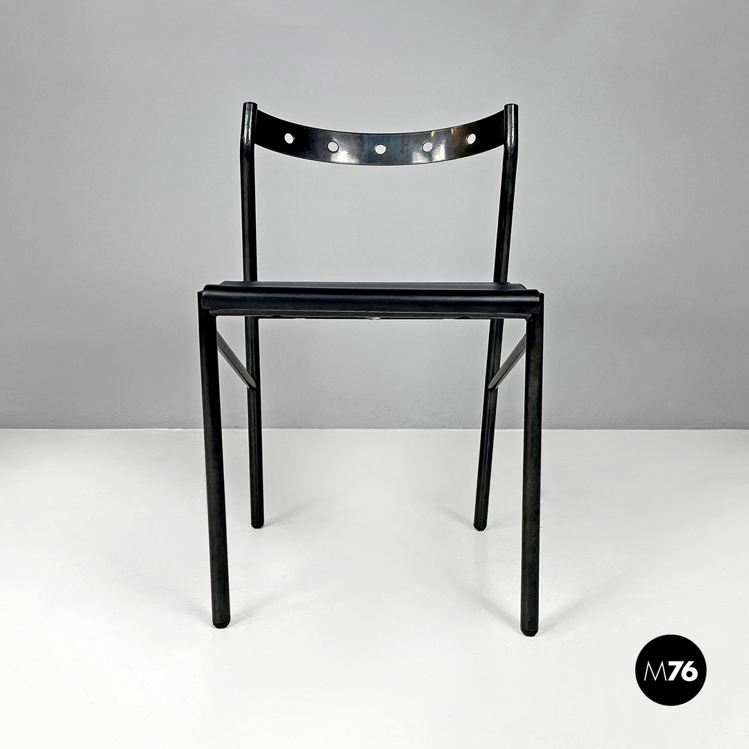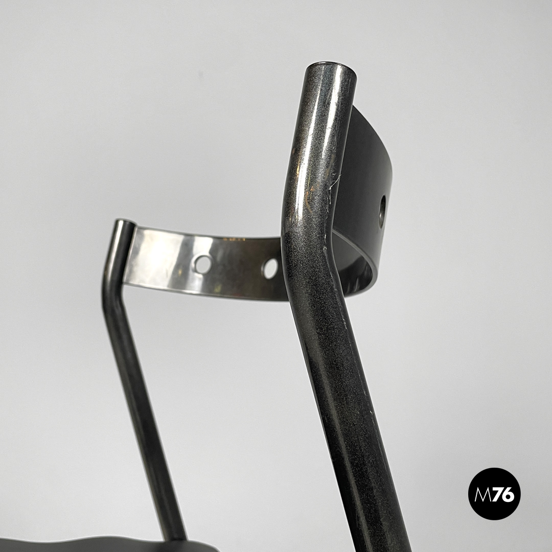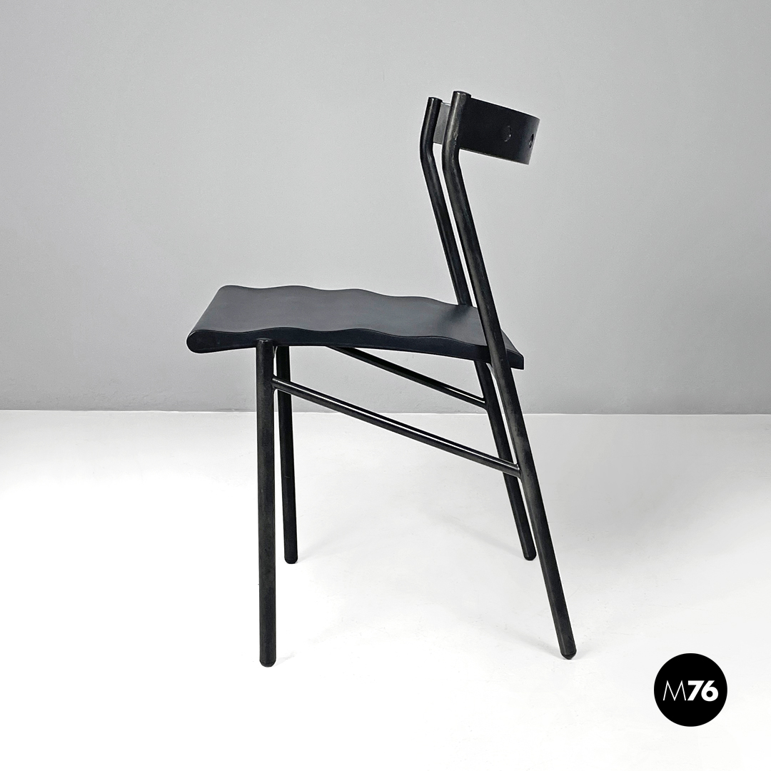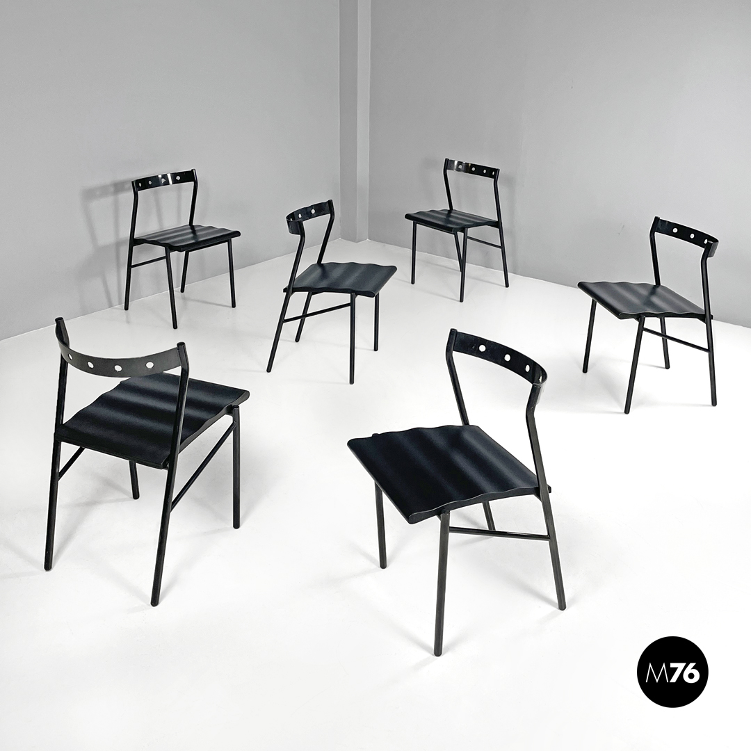Set di sei sedie con seduta rettangolare. La sedia si sviluppa “in avanti” seguendo una linea diagonale. La seduta è in gomma nera ed è sagomata con linee curve,