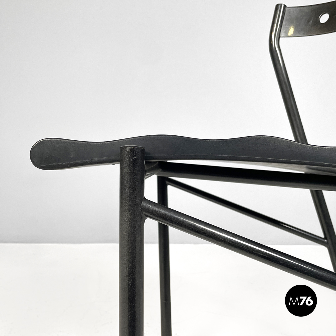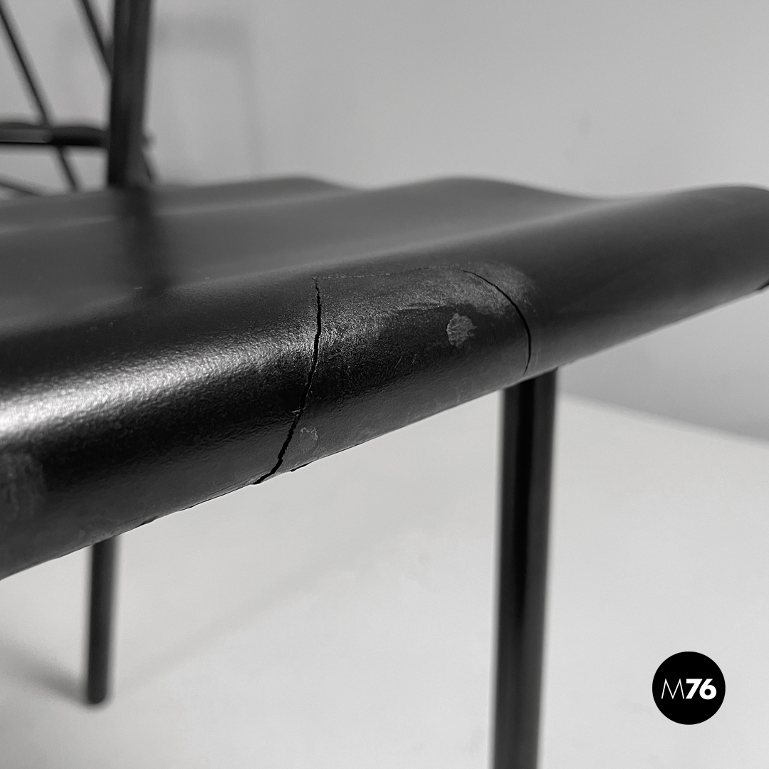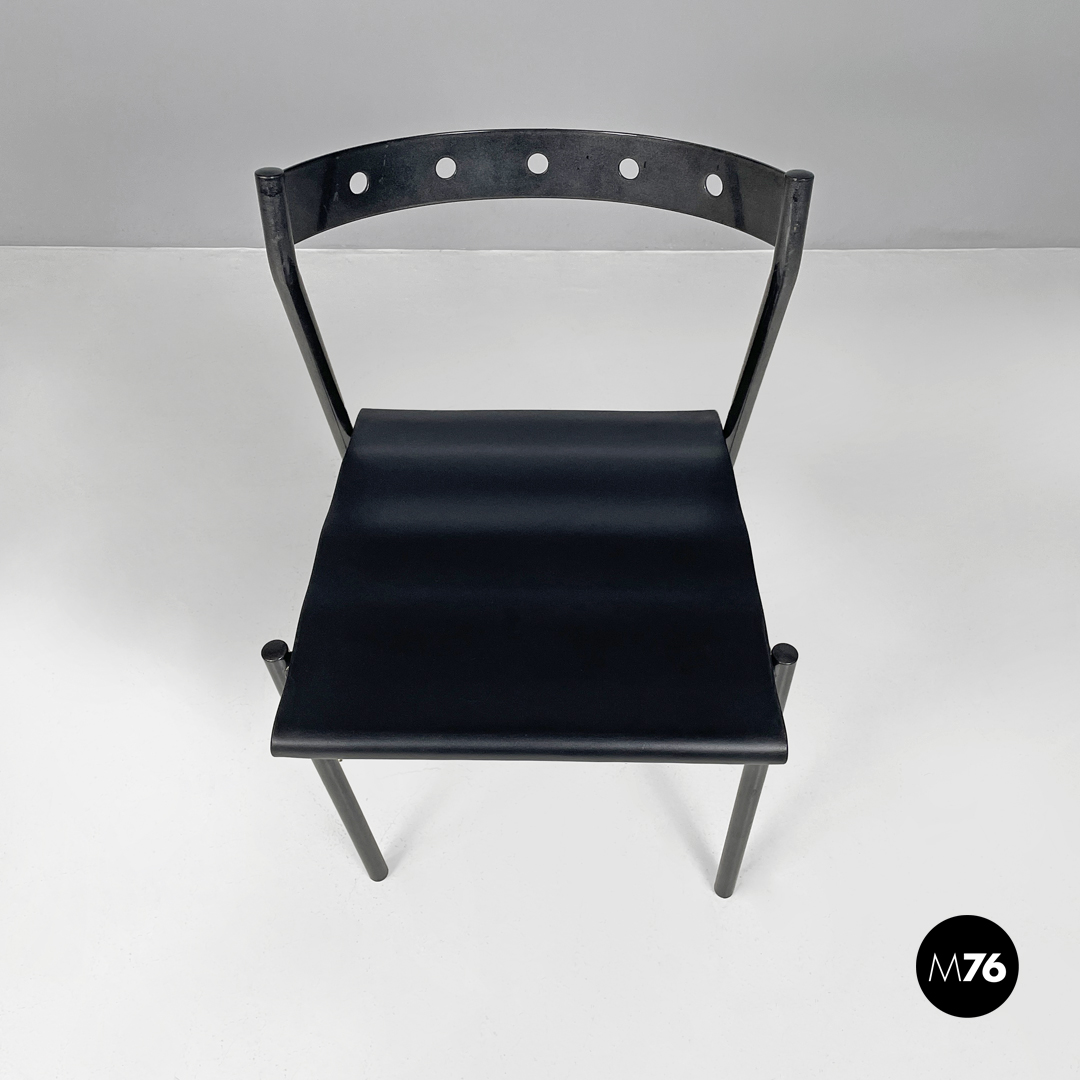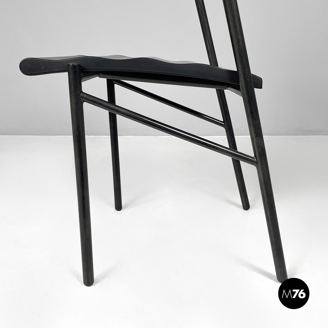 Set di sei sedie con seduta rettangolare. La sedia si sviluppa “in avanti” seguendo una linea diagonale. La seduta è in gomma nera ed è sagomata con linee curve,