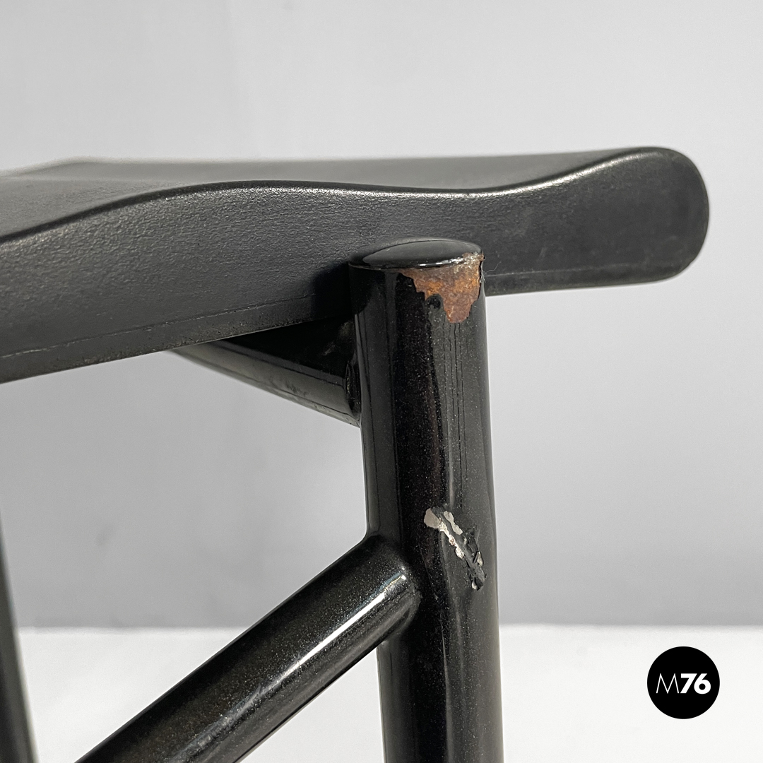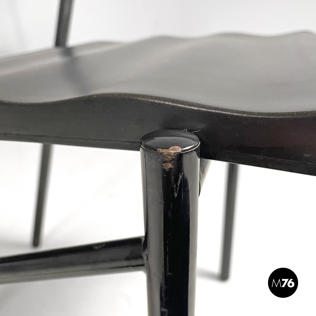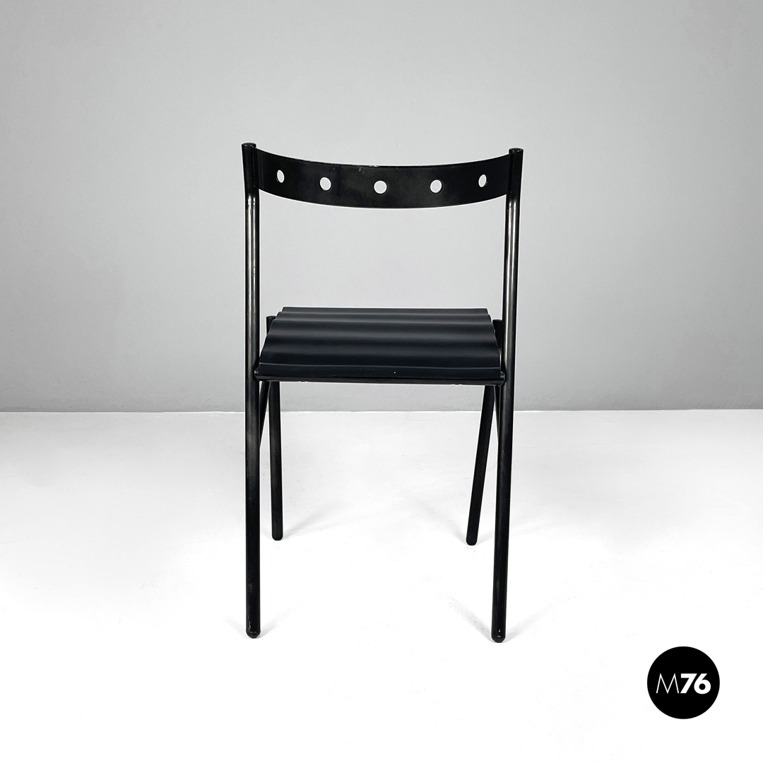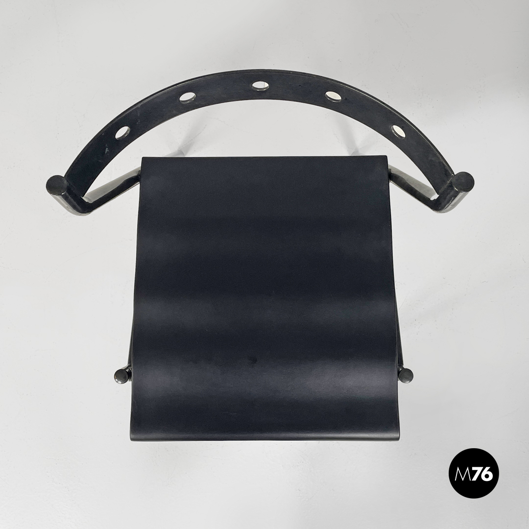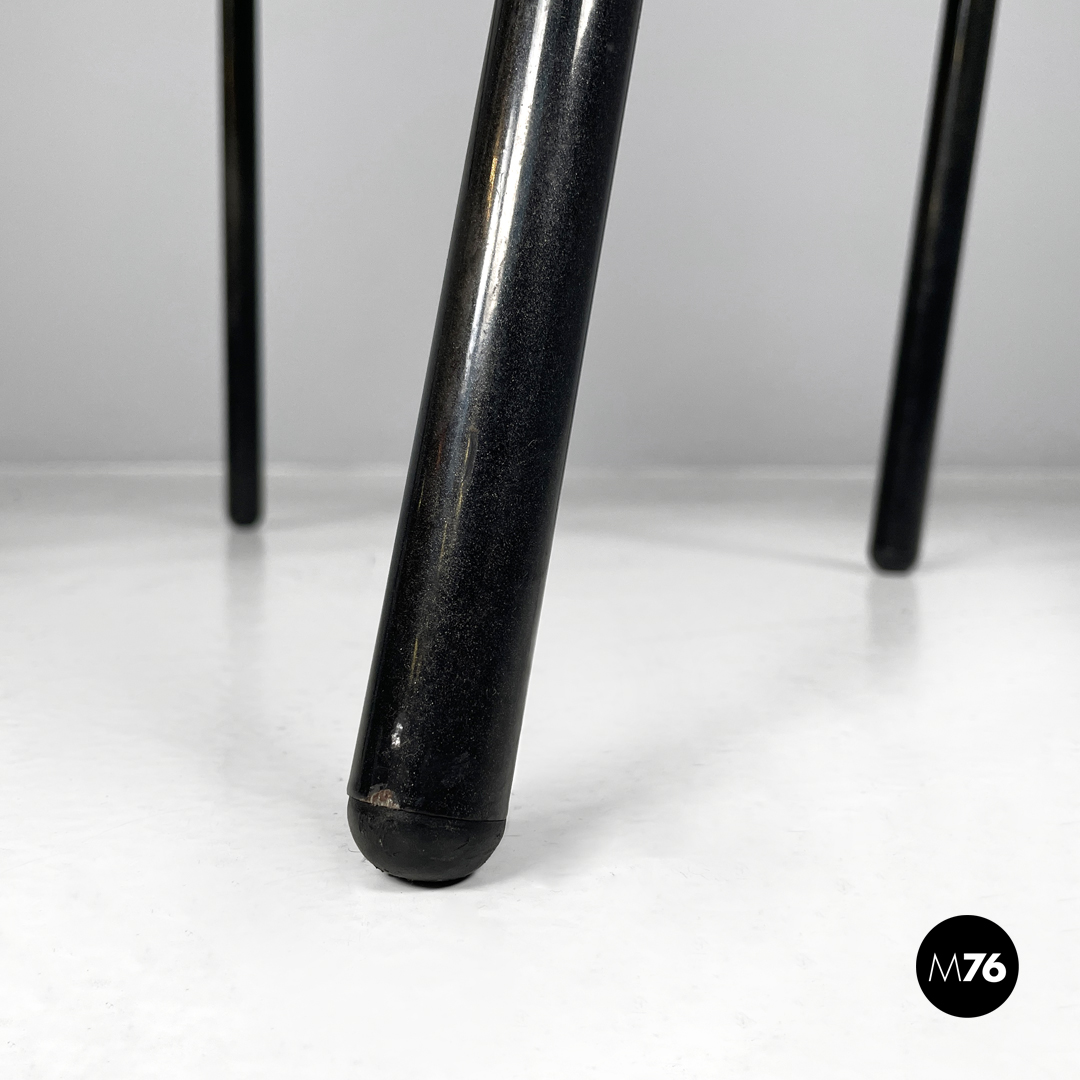 Set di sei sedie con seduta rettangolare. La sedia si sviluppa “in avanti” seguendo una linea diagonale. La seduta è in gomma nera ed è sagomata con linee curve,