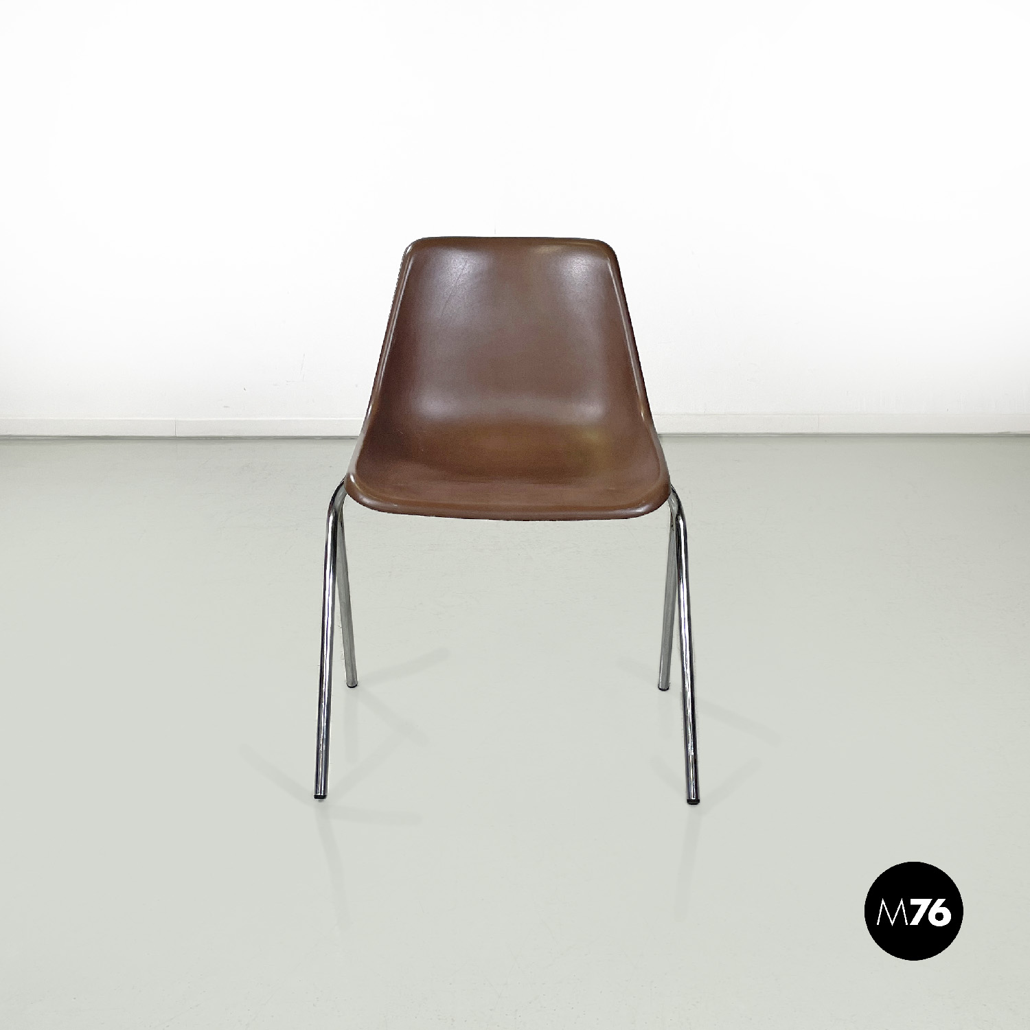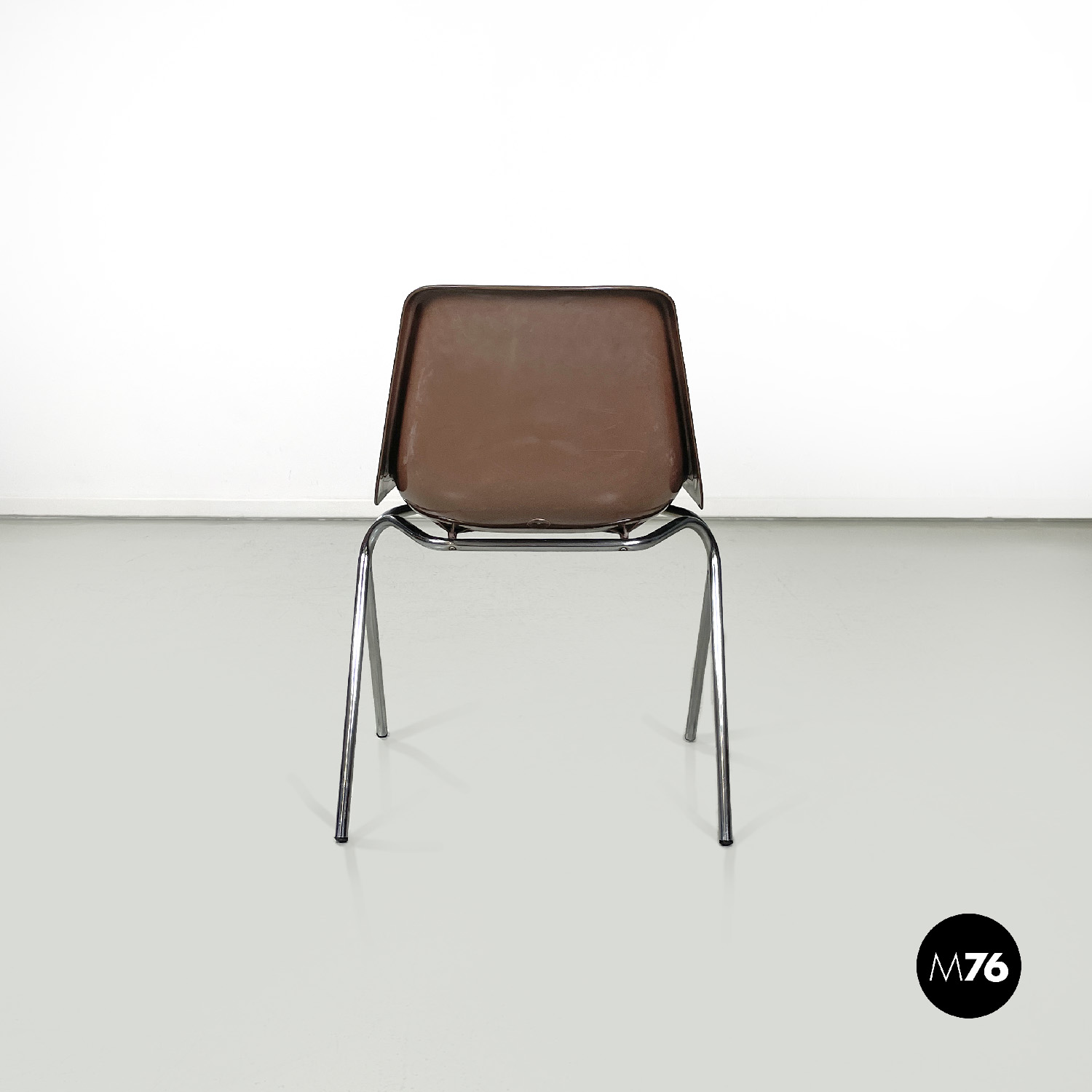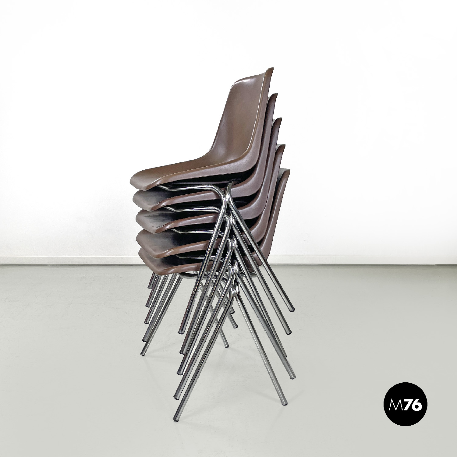 Set di cinque sedie con seduta e schienale composti da un’unica struttura in plastica marrone, sagomata e curvata sulla seduta e sul perimetro. Le gambe sono in tondino di metallo cromato color argento, terminano con piedini in plastica nera. Le sedie sono impilabili.