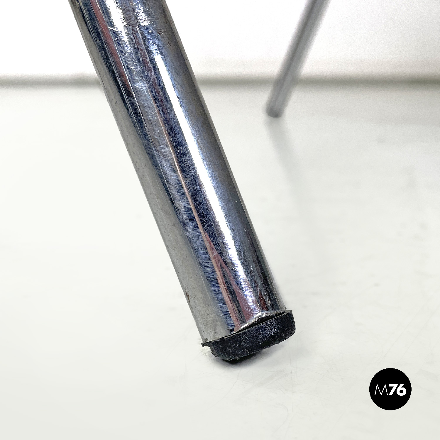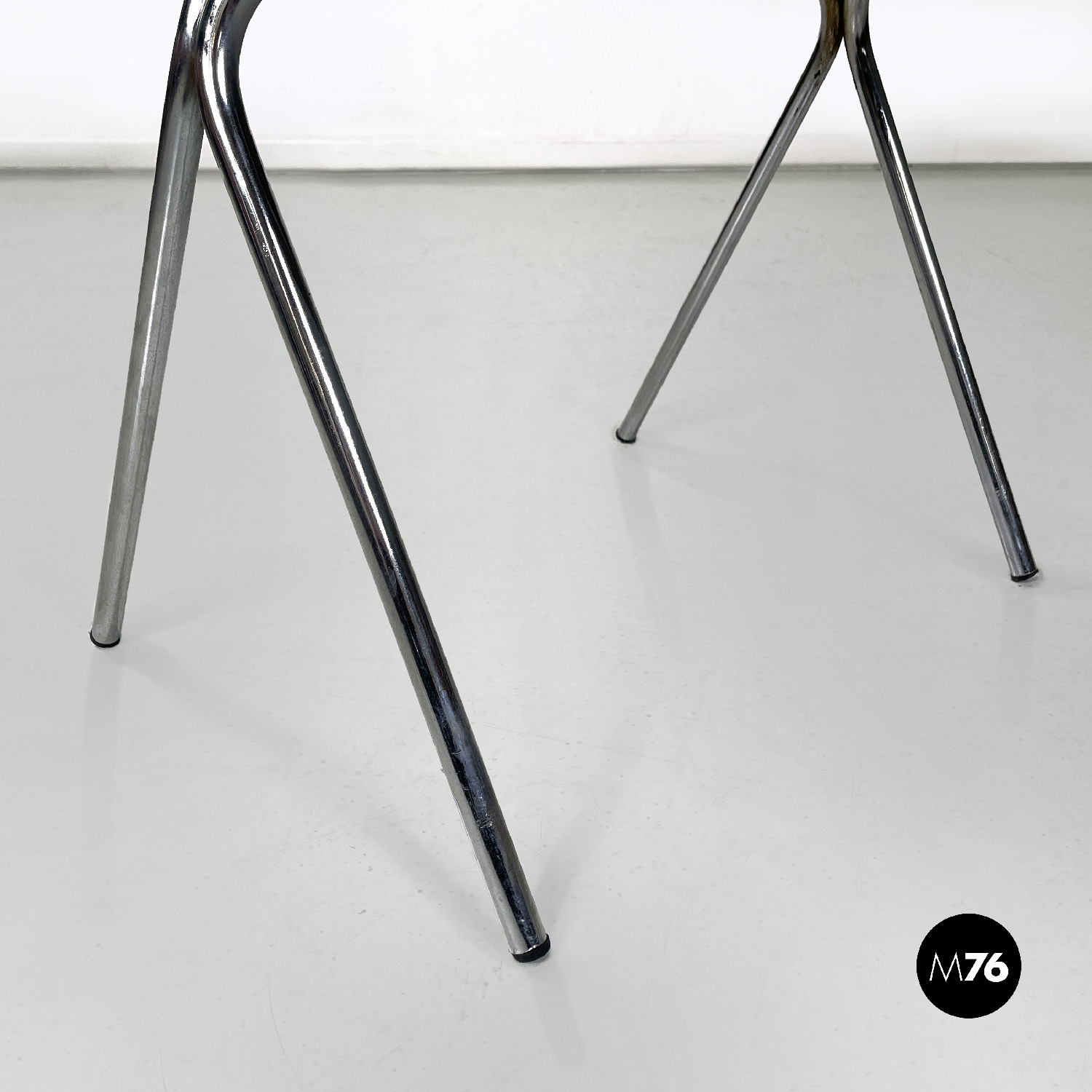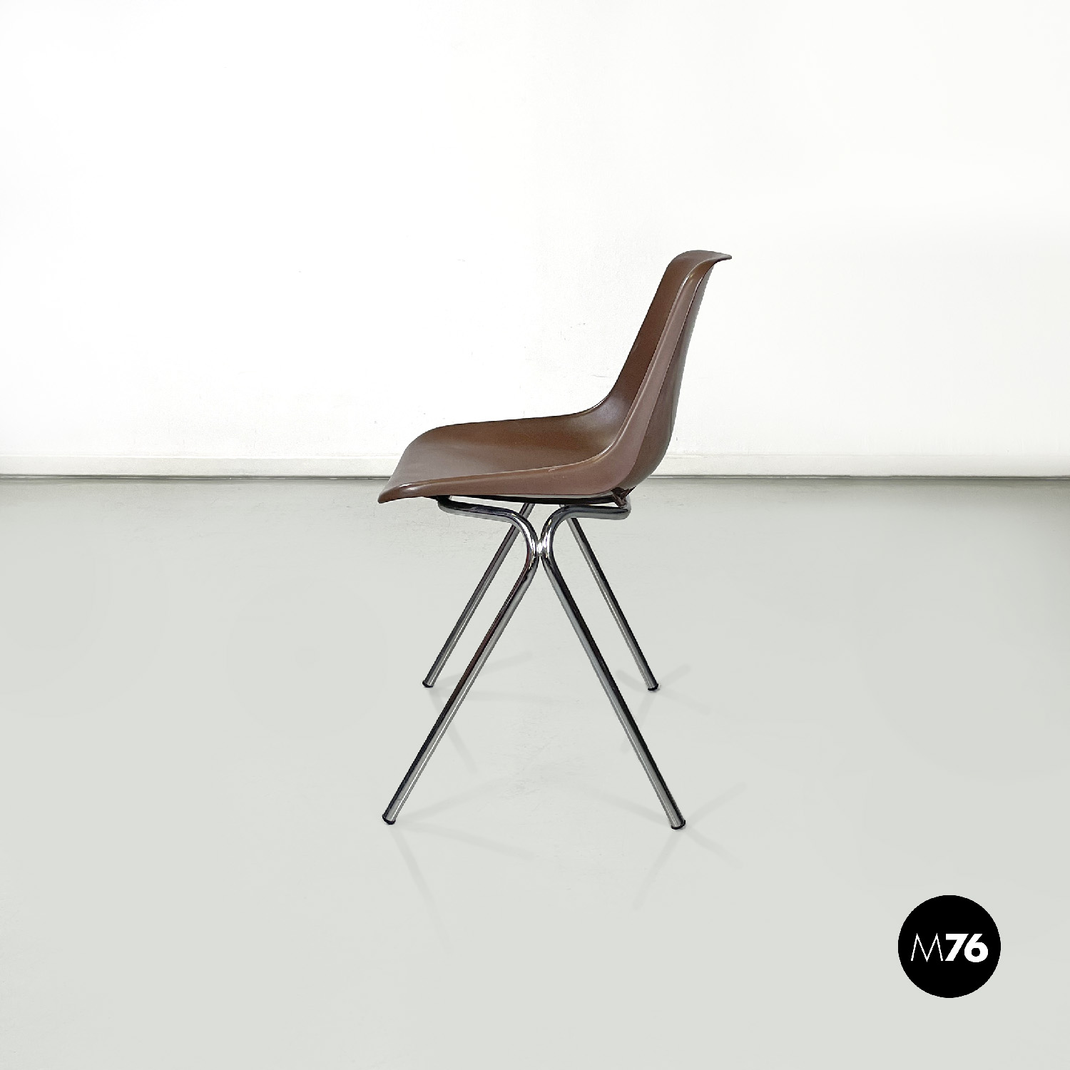 Set di cinque sedie con seduta e schienale composti da un’unica struttura in plastica marrone, sagomata e curvata sulla seduta e sul perimetro. Le gambe sono in tondino di metallo cromato color argento, terminano con piedini in plastica nera. Le sedie sono impilabili.