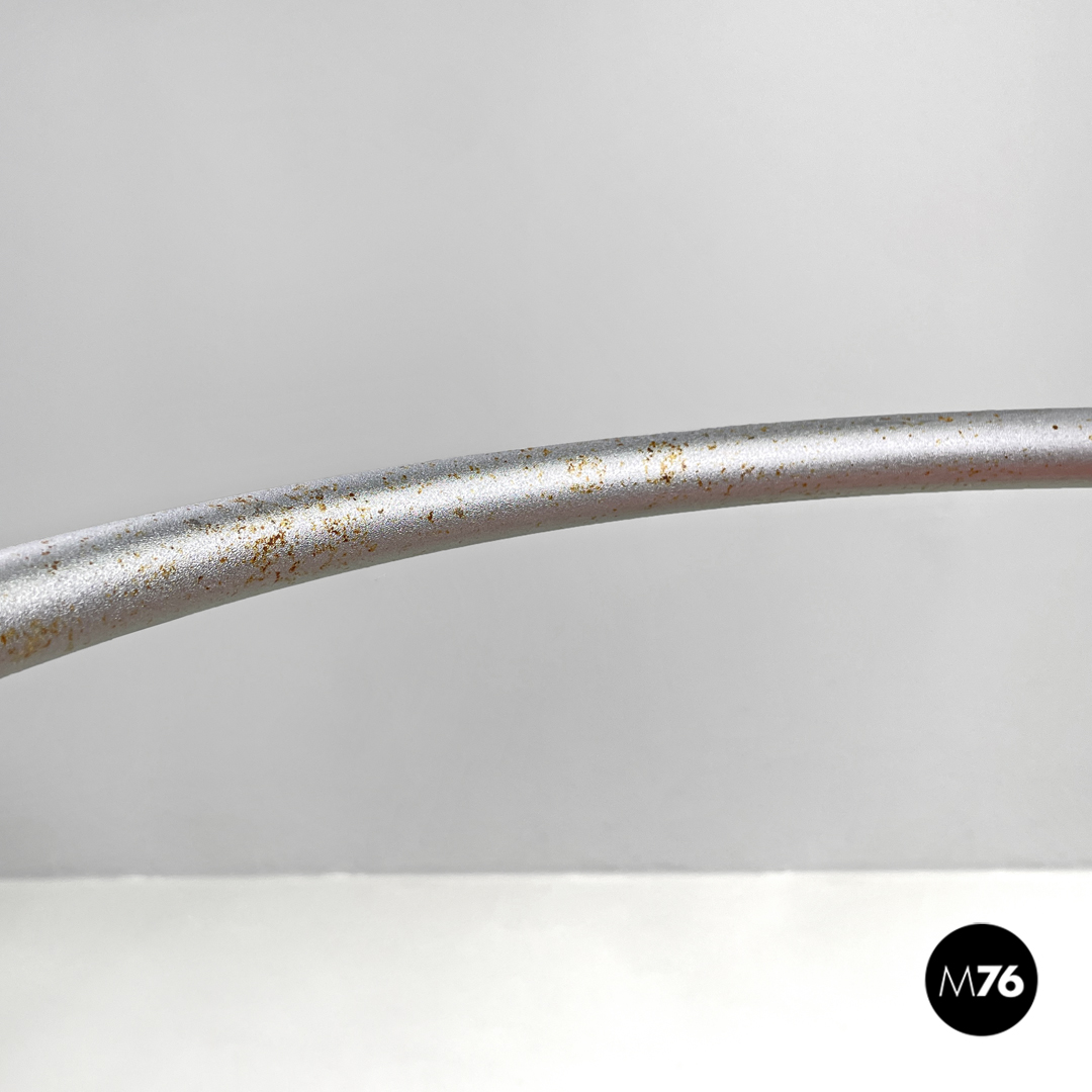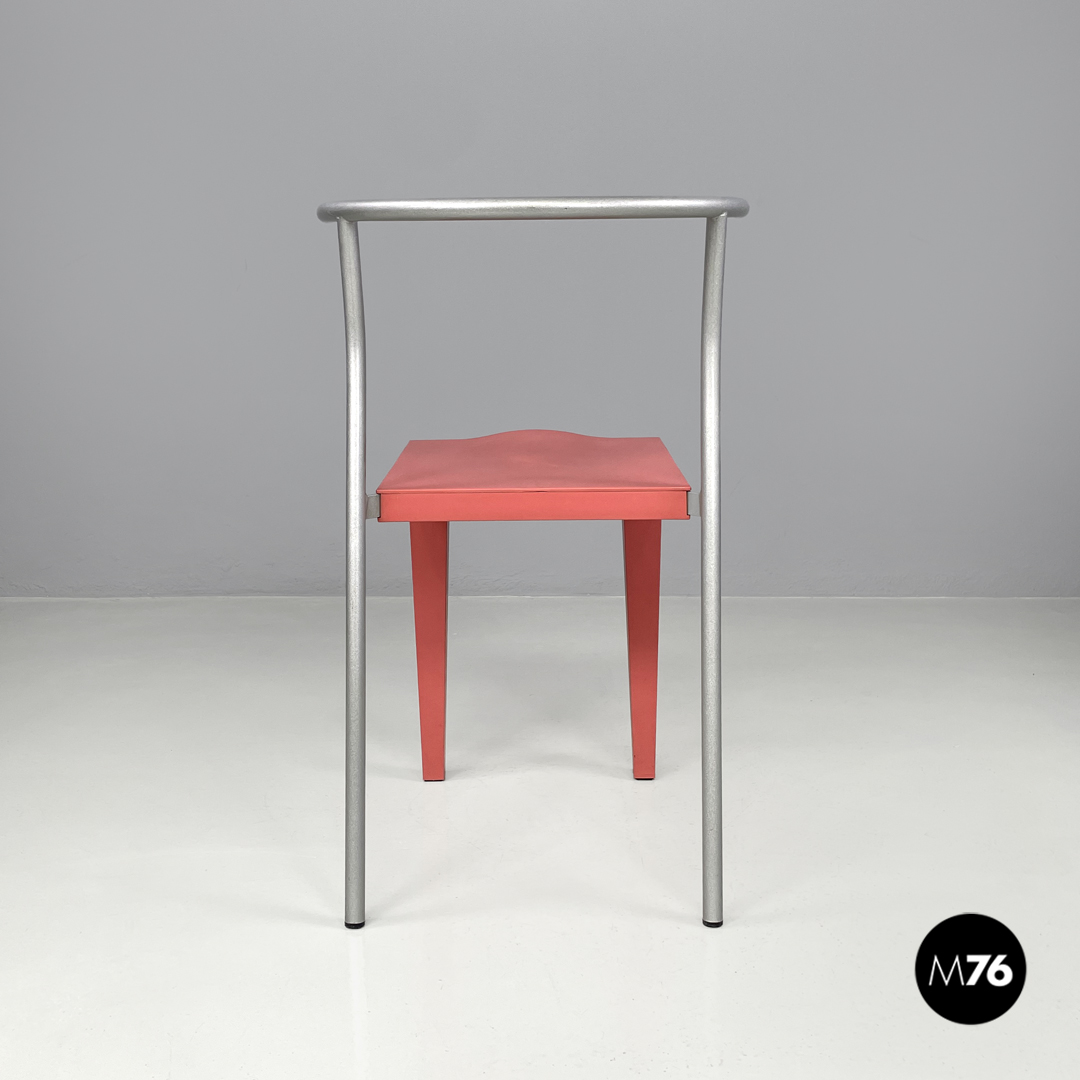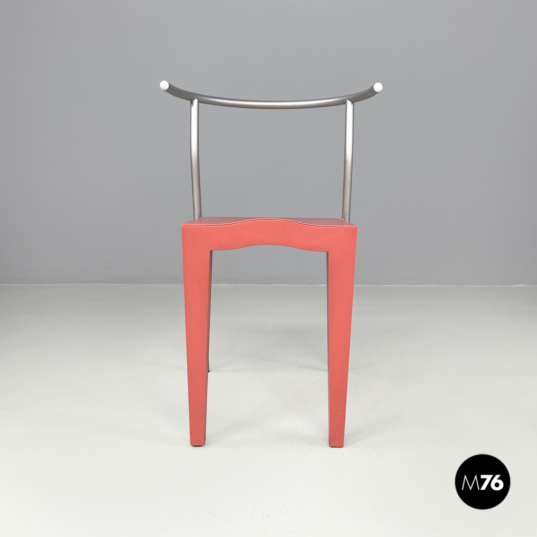 Set di quattro sedie a pozzetto modello Dr Glob imputabili. La seduta e le due gambe anteriori a sezione quadrata sono in plastica color rosa corallo chiaro, mentre lo schienale e le due game posteriori sono in tubolare di metallo verniciato color argento glitterato.