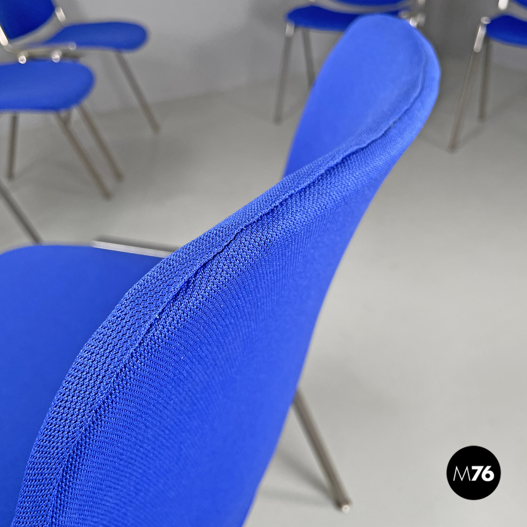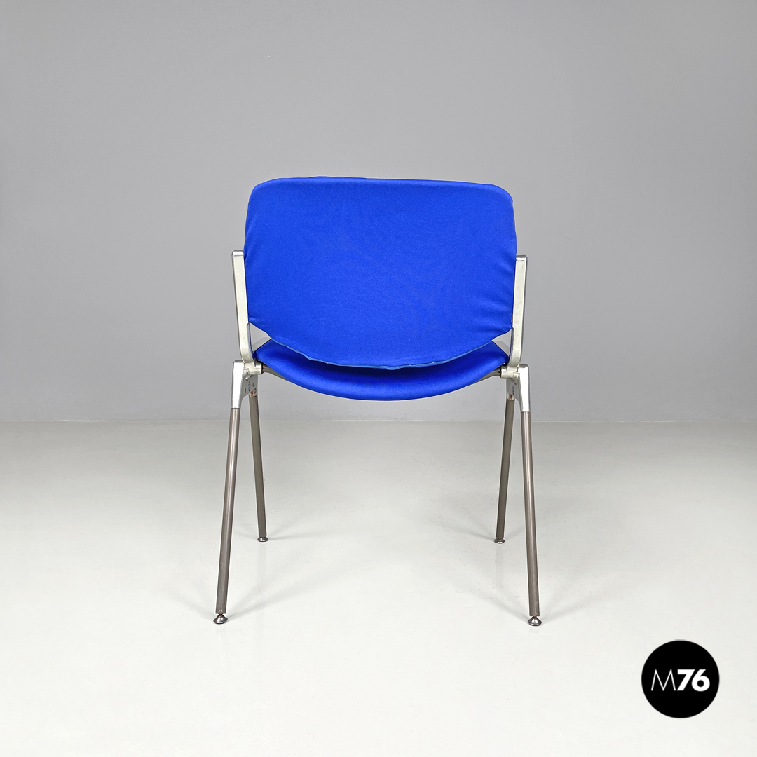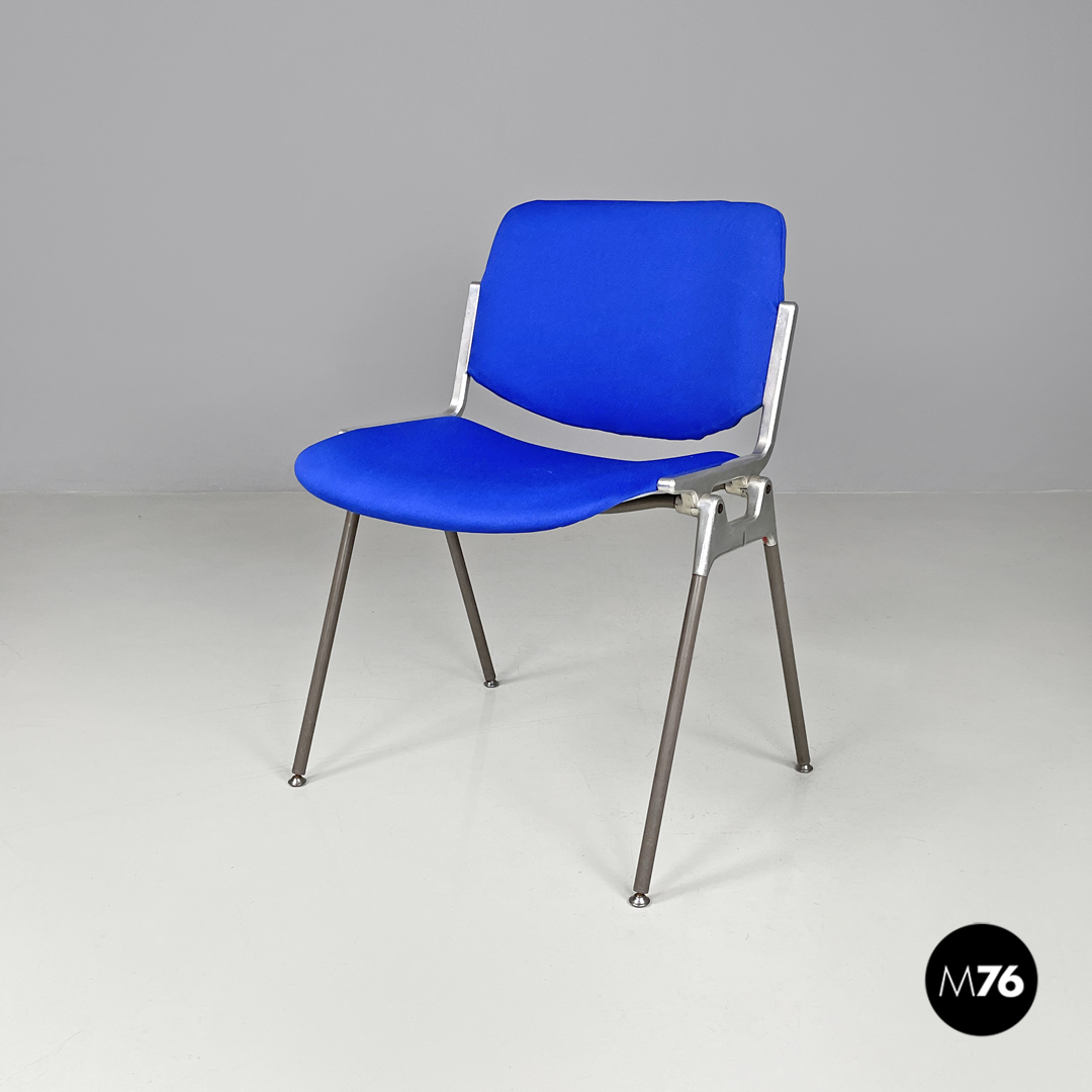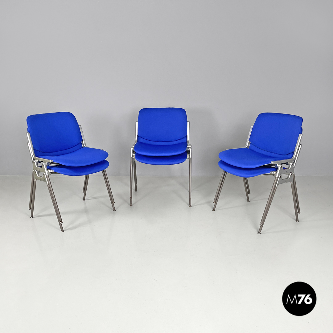 Set di sei sedie modello DSC impilabili, imbottite e rivestite in tessuto blu elettrico con seduta e schienale rettangolari con angoli arrotondati. La struttura robusta è in alluminio, con gambe a sezione tonda rivestite in plastica grigia, con piedini tondi sempre in alluminio.