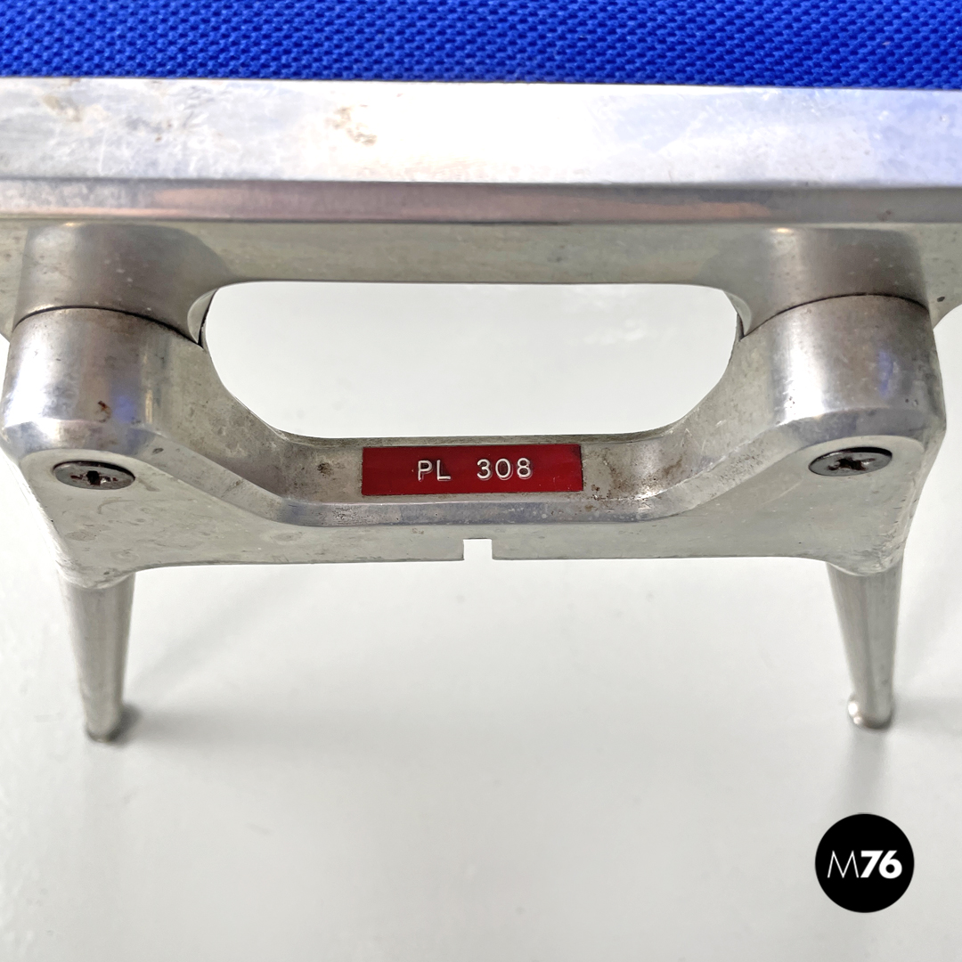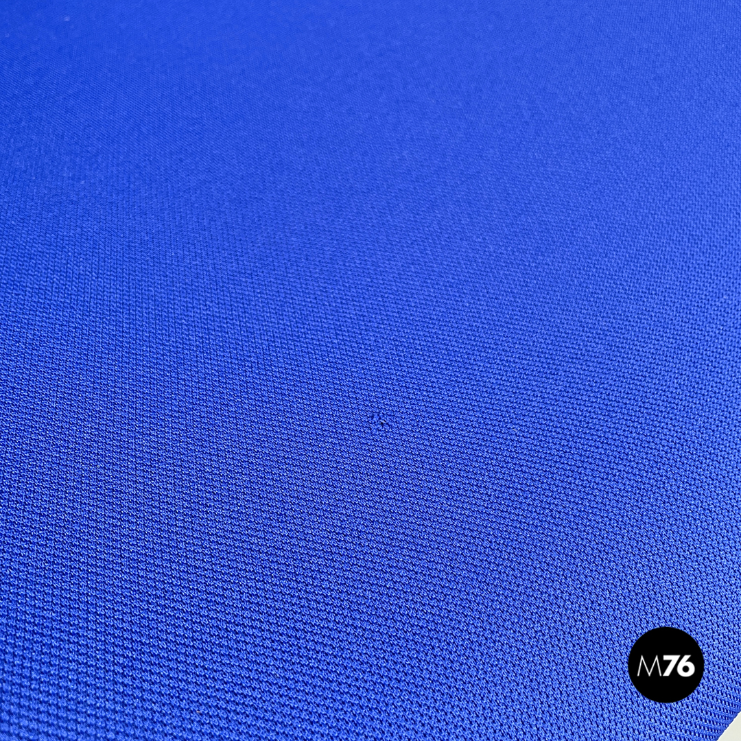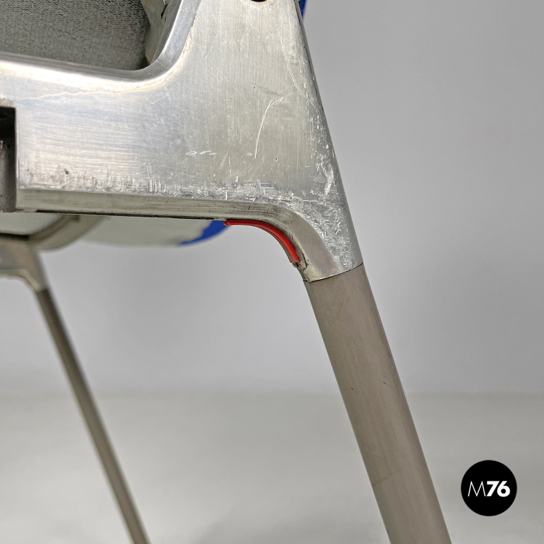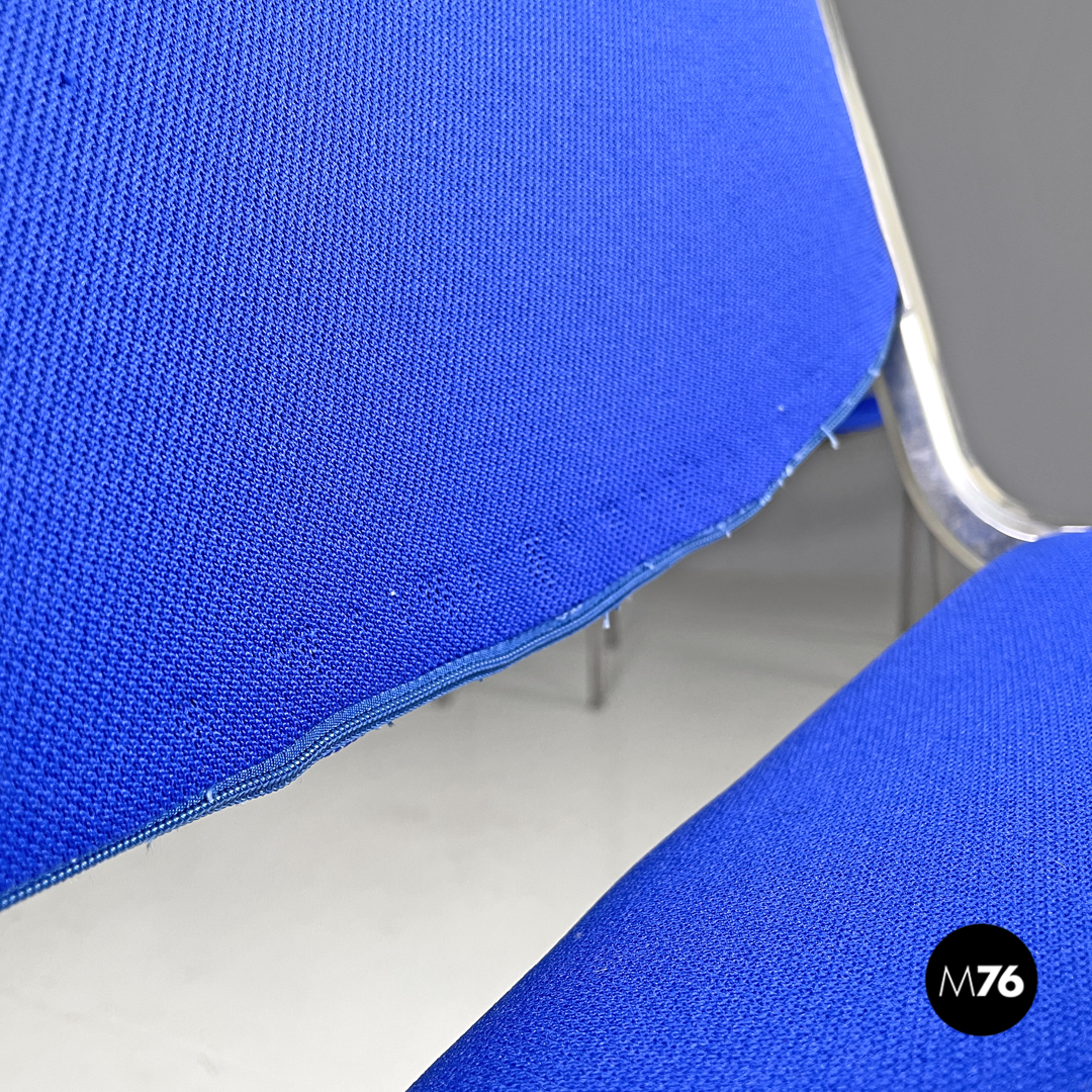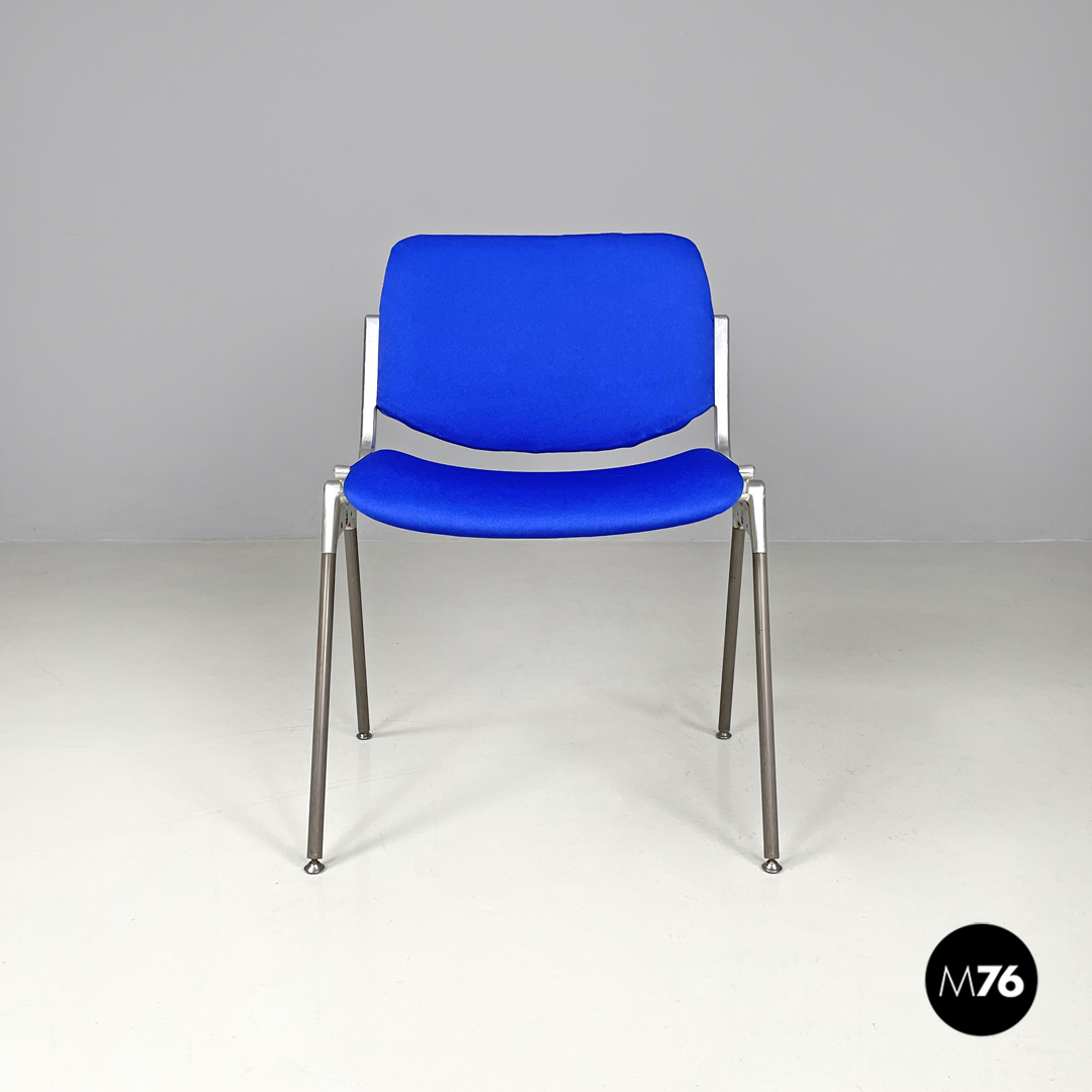 Set di sei sedie modello DSC impilabili, imbottite e rivestite in tessuto blu elettrico con seduta e schienale rettangolari con angoli arrotondati. La struttura robusta è in alluminio, con gambe a sezione tonda rivestite in plastica grigia, con piedini tondi sempre in alluminio.