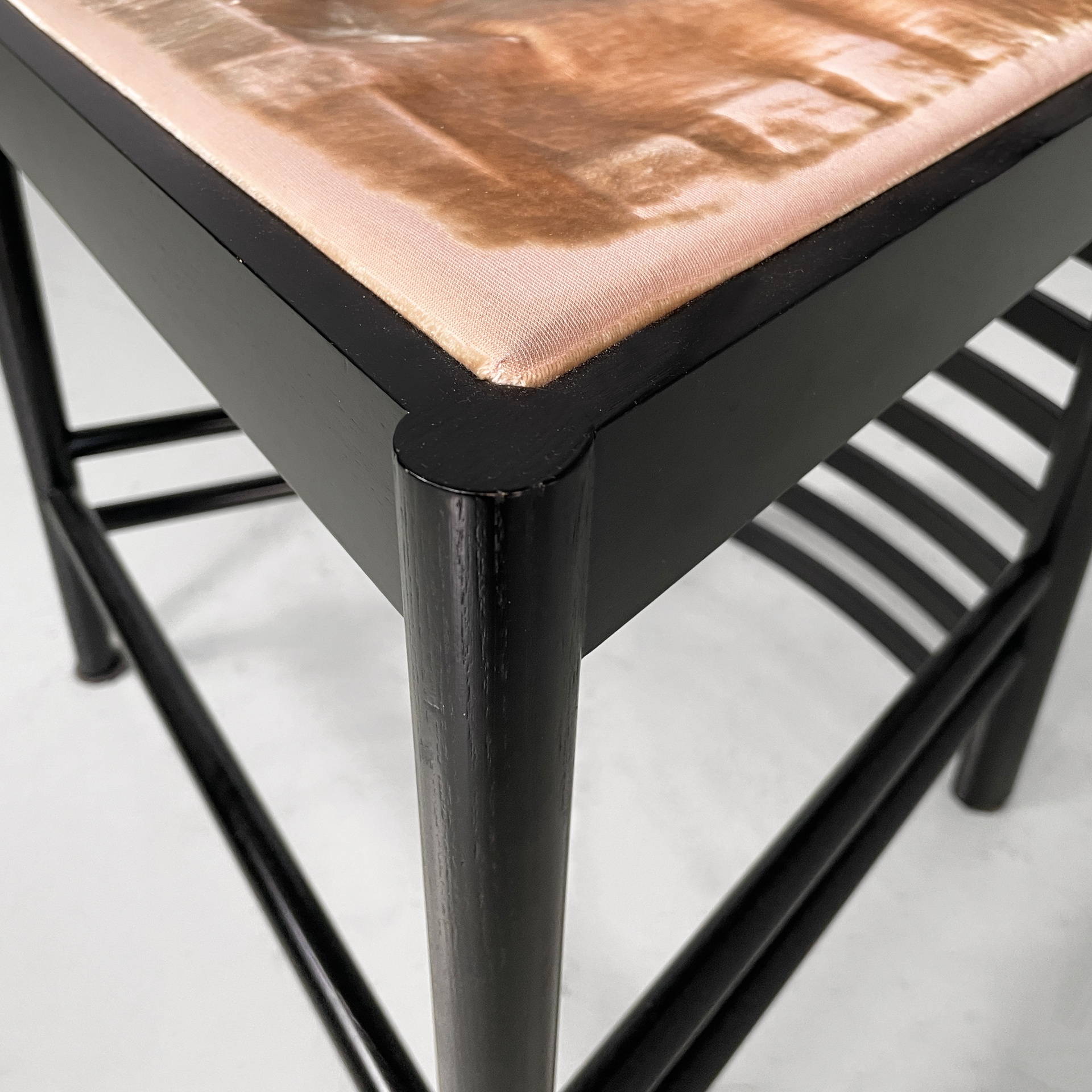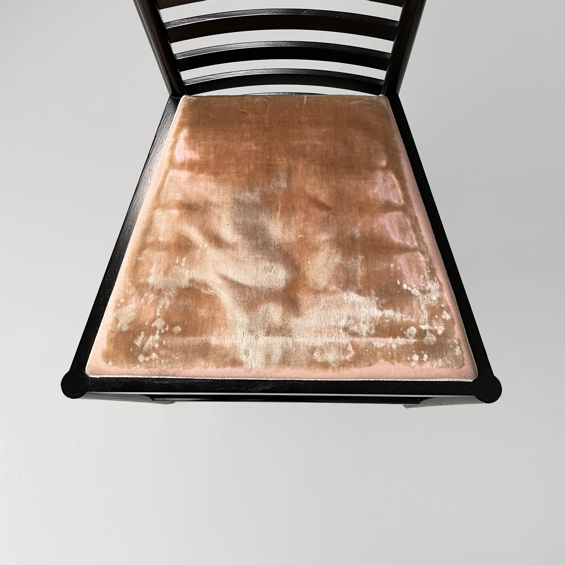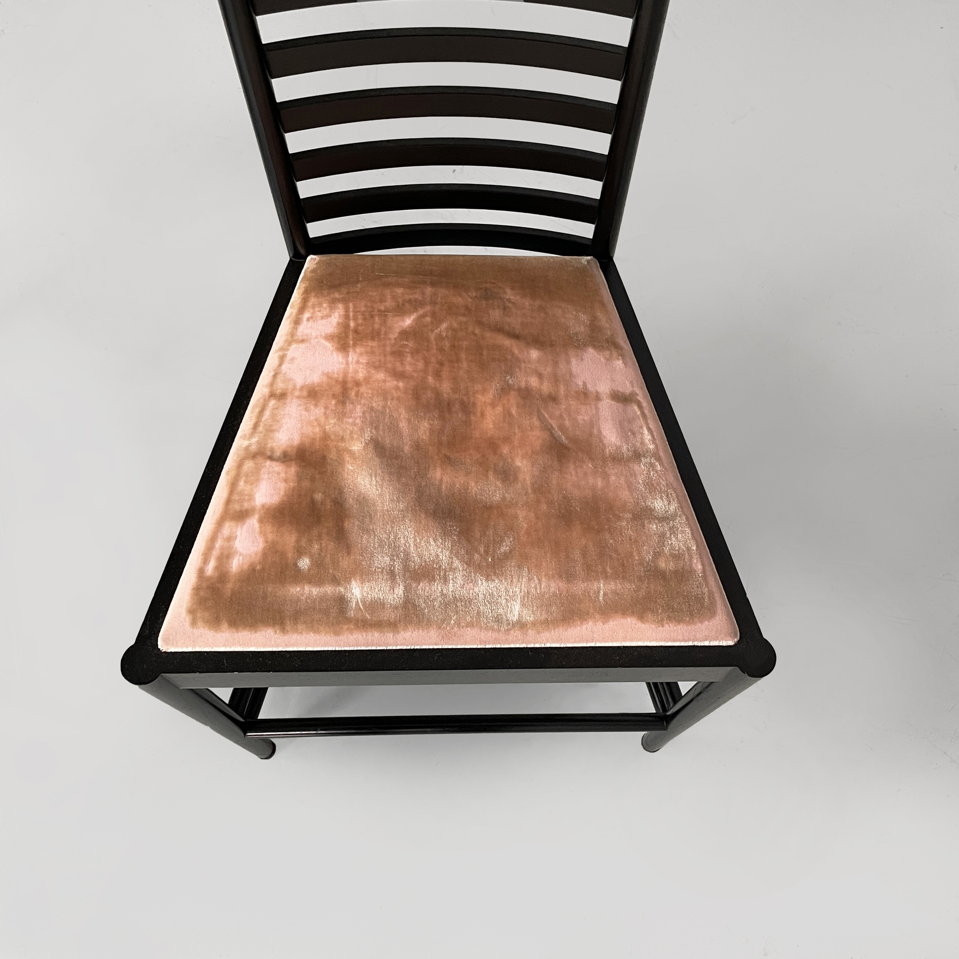 Set di otto sedie modello Hill House in legno verniciato nero e tessuto rosa. Lo schienale alto presenta una struttura a listelli orizzontali e una struttura a grata nella parte superiore. La seduta è imbottita e rivestita in tessuto rosato. Le zampe anteriori sono a sezione tonda, mentre quelle posteriori riprendono la struttura a listelli dello schienale.