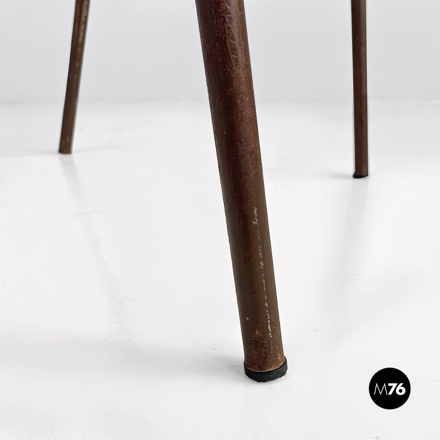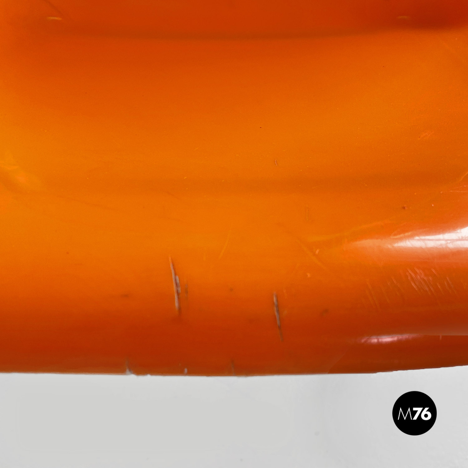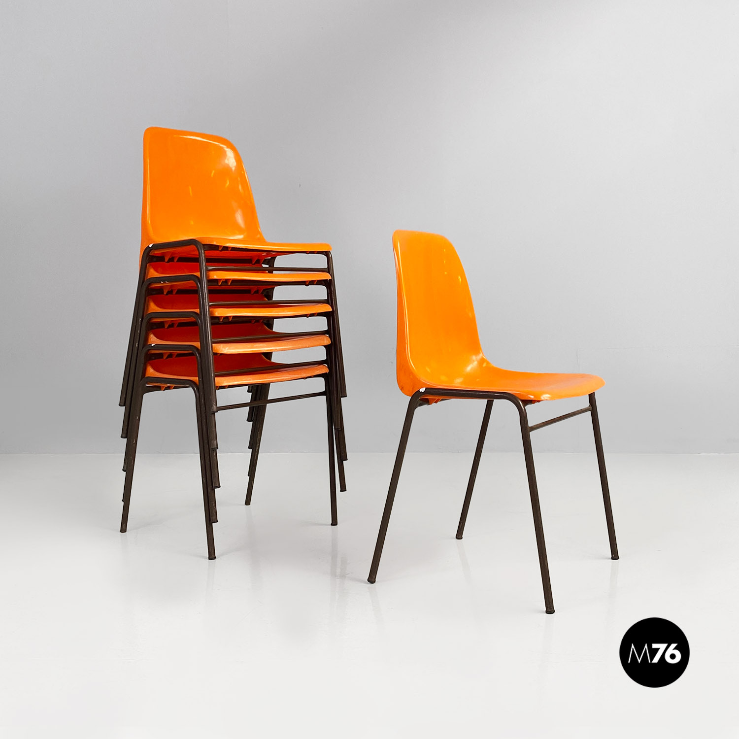 Sedie di provenienza francese, impilabili, con seduta curvata in plastica arancio e zampe in tubolare di metallo con verniciatura originale.