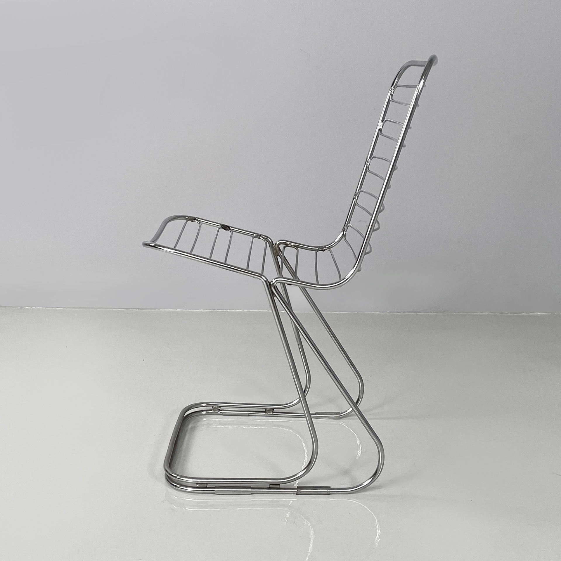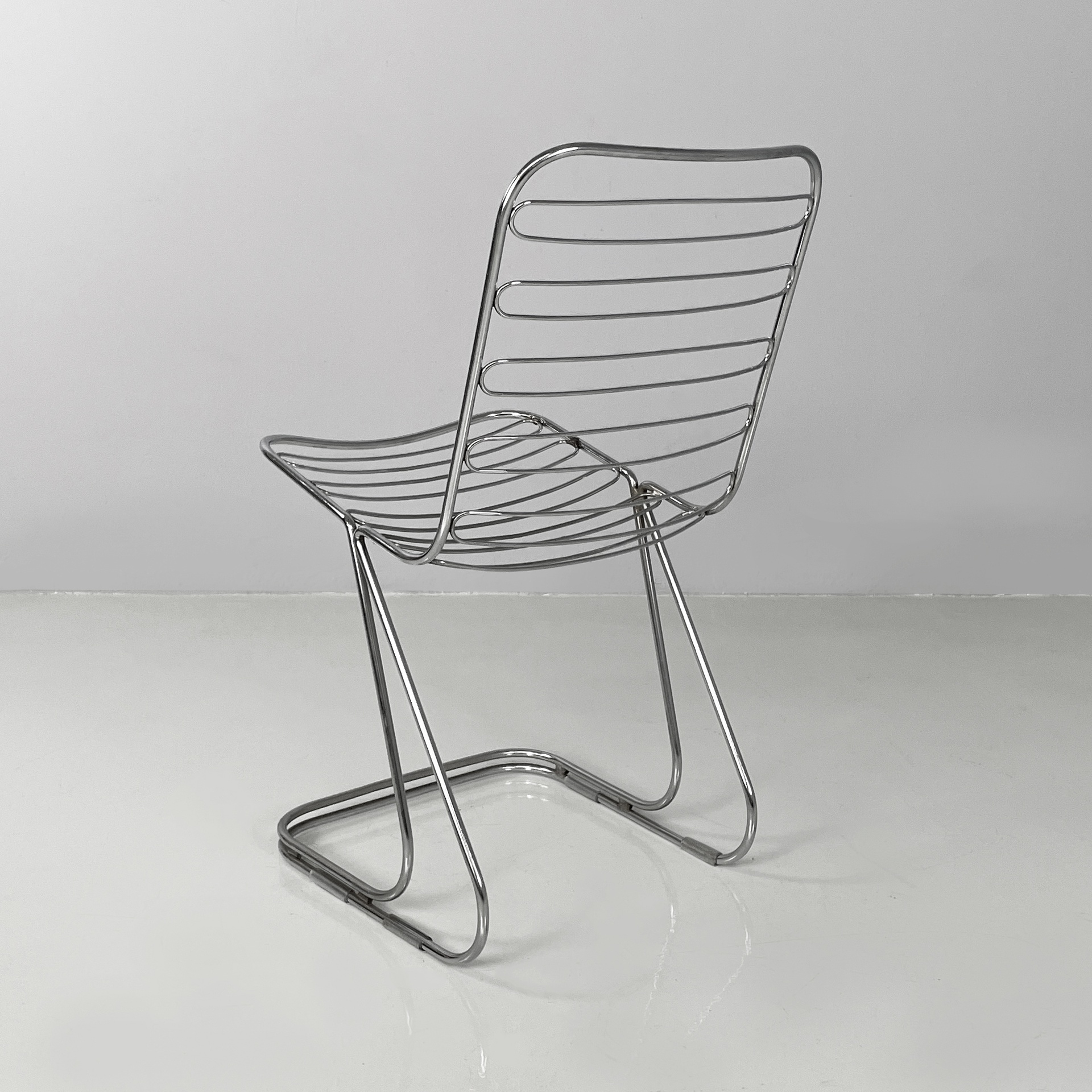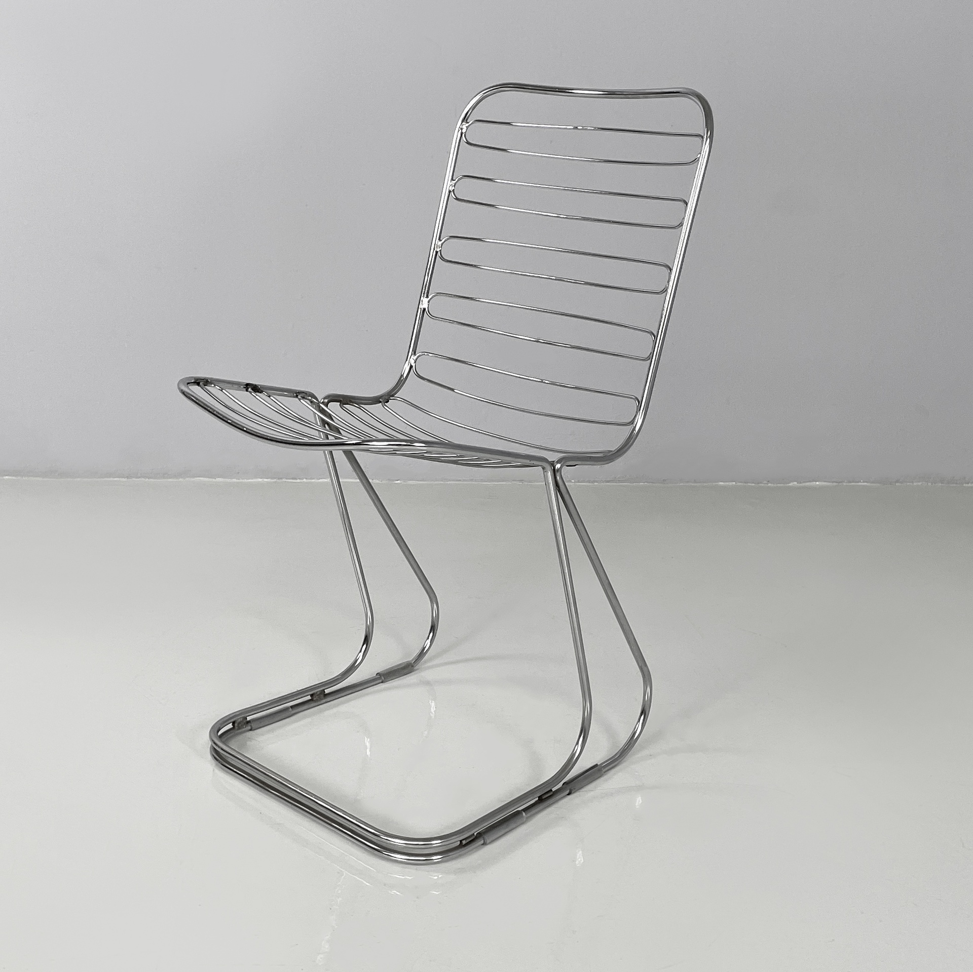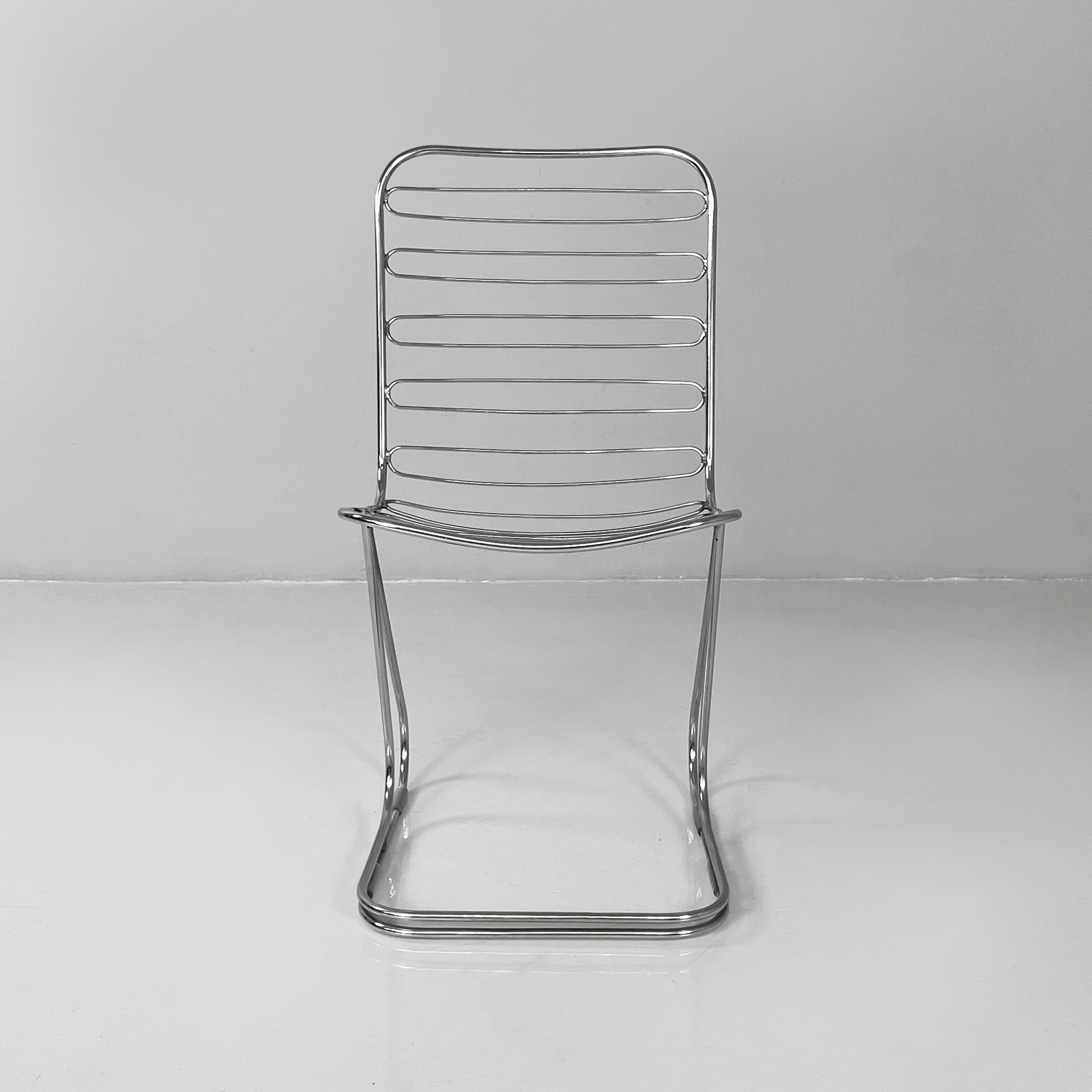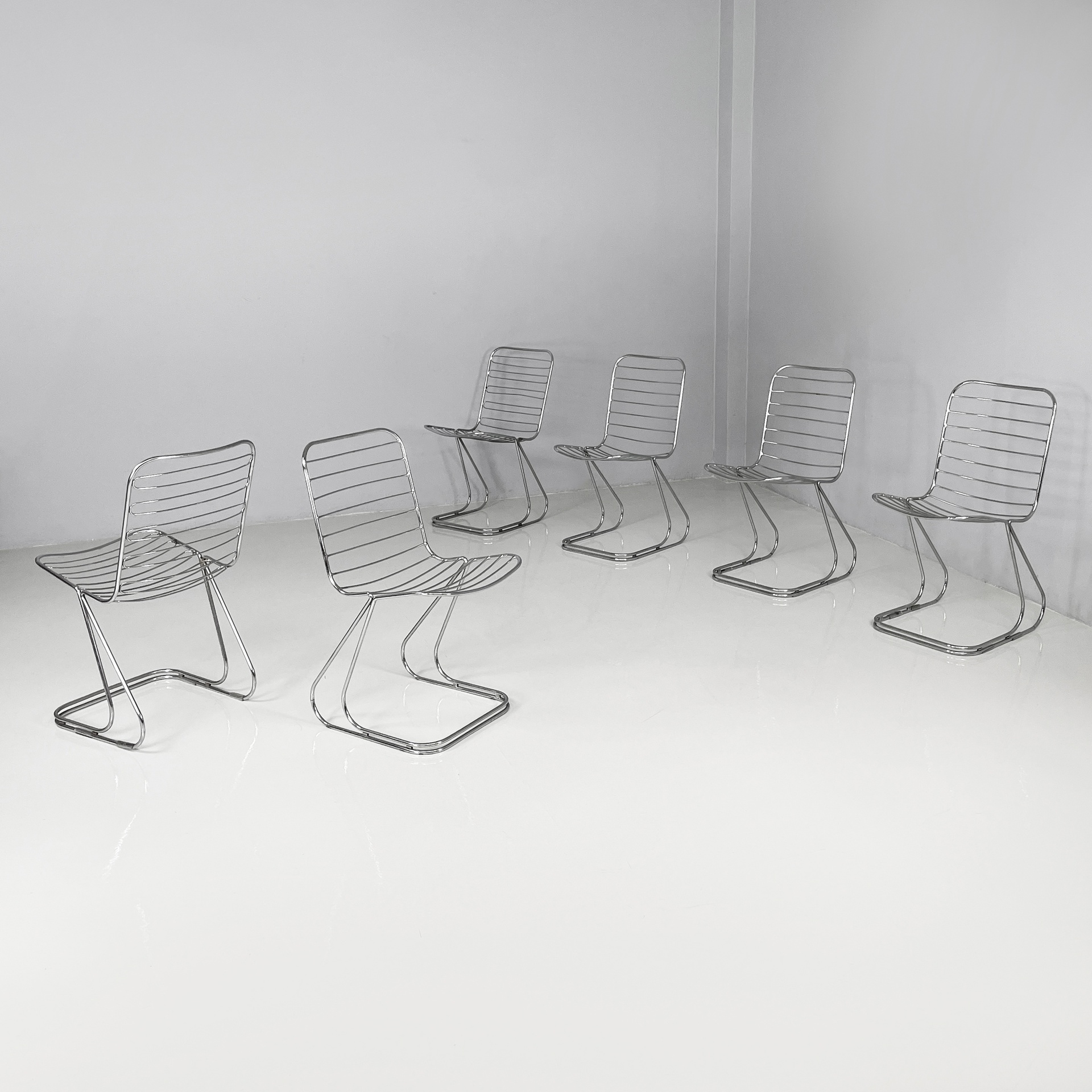 Set di sei sedie interamente in tondino di acciaio cromato. Due sedie presentano un tondino di forma ovale, mentre le altre quattro presentano tondini dritti. Lo schienale e la seduta sono leggermente ricurvi, mentre la zampa è composta da due tondini di acciaio.