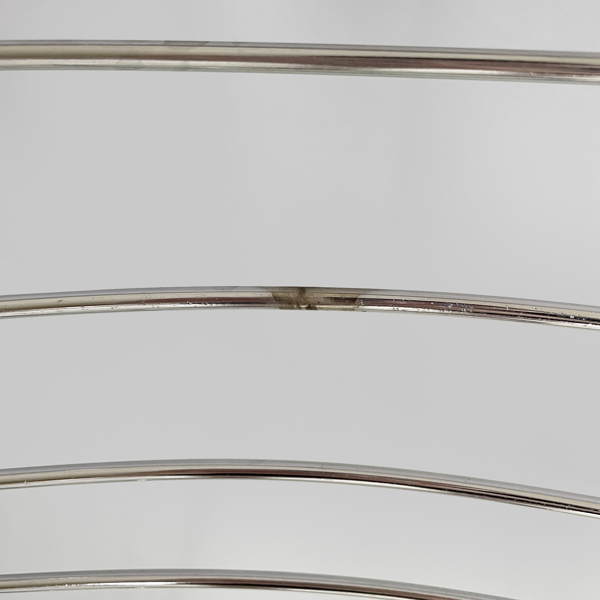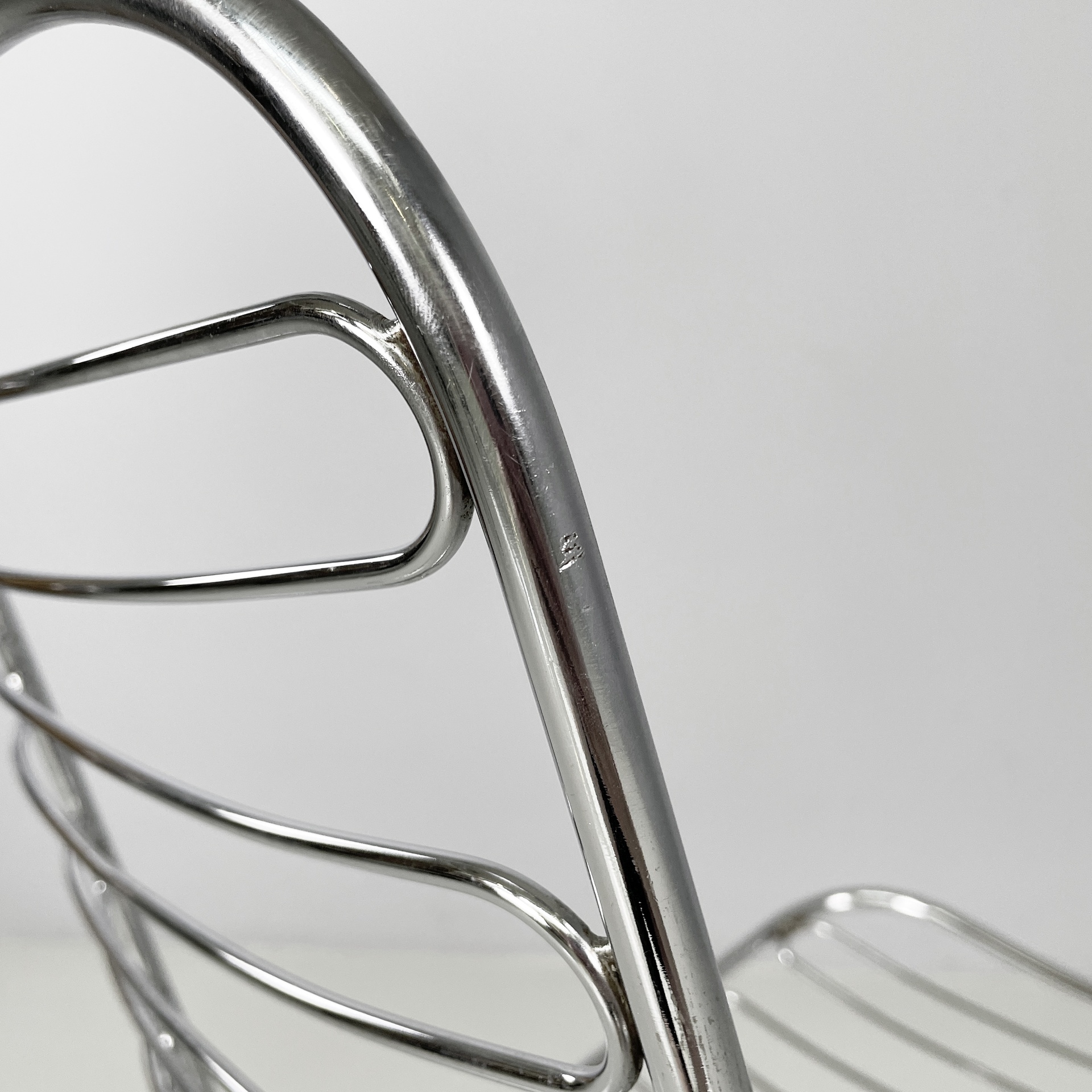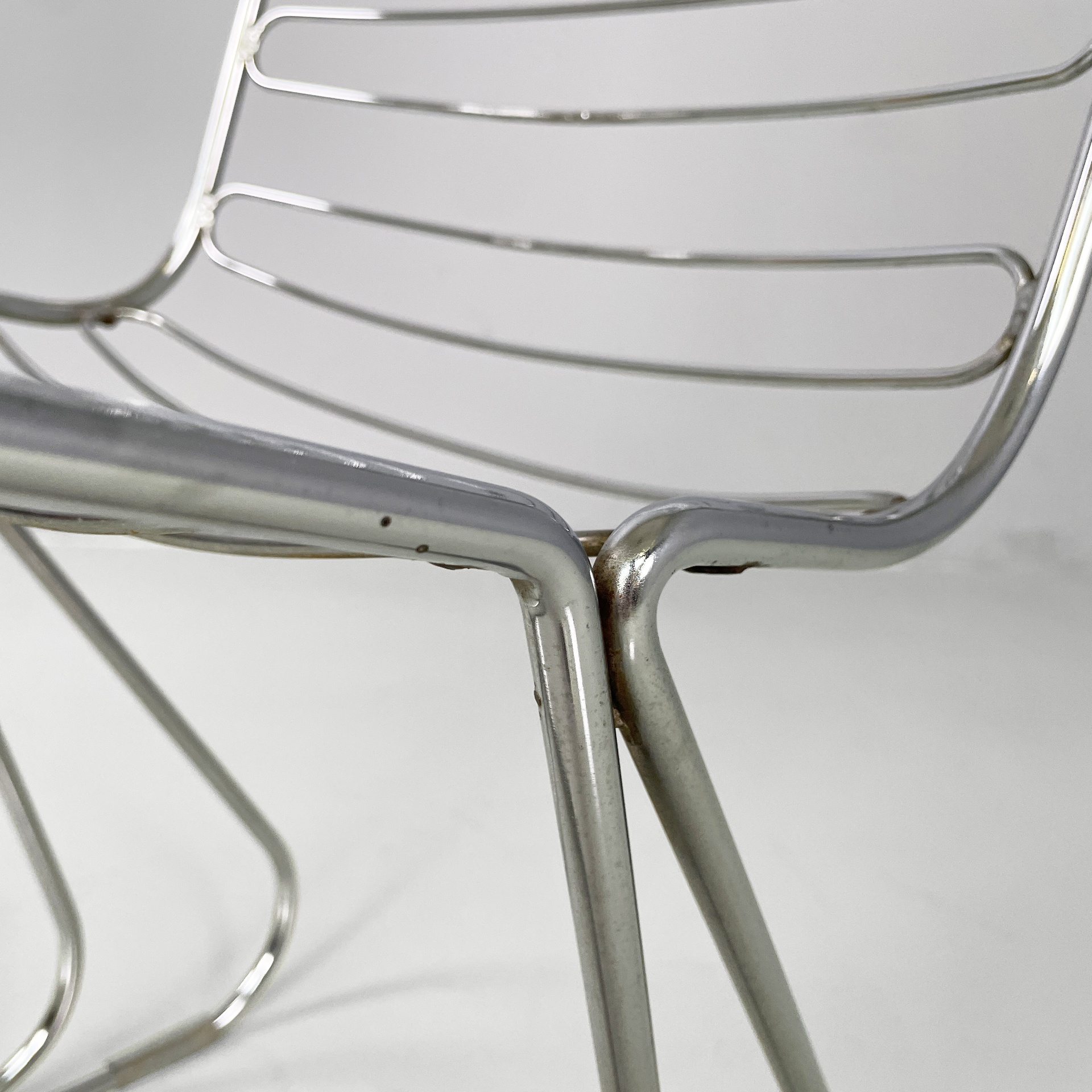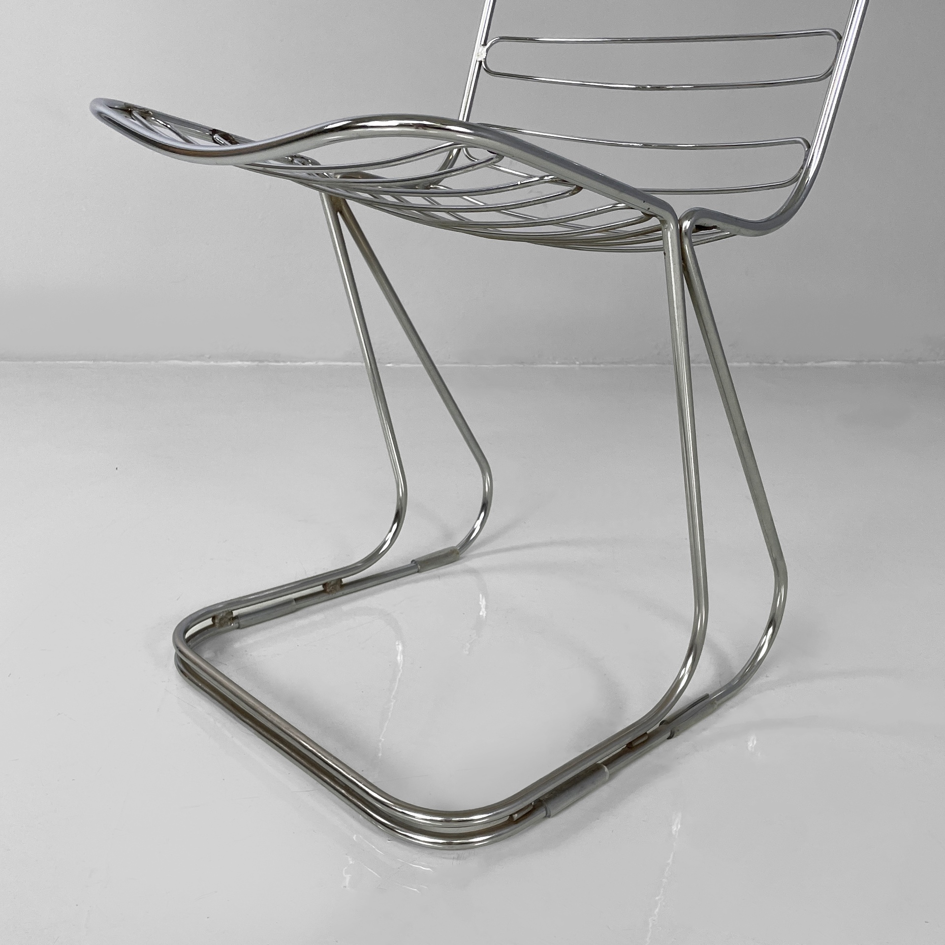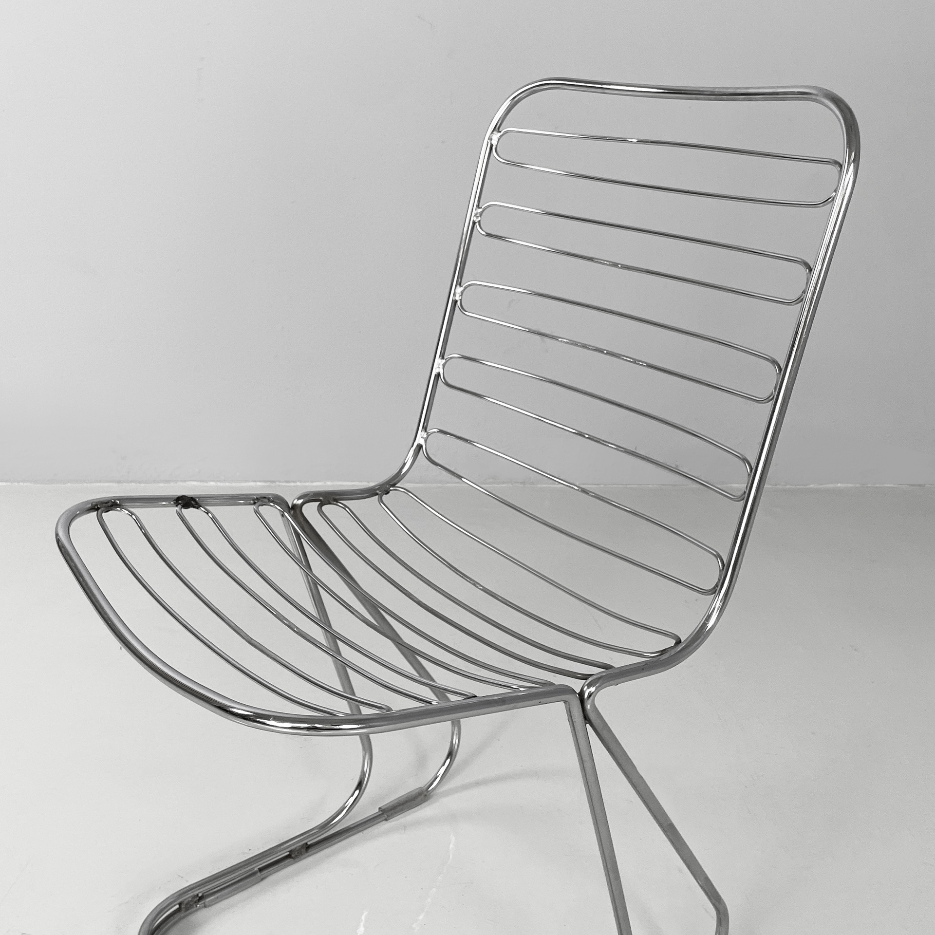 Set di sei sedie interamente in tondino di acciaio cromato. Due sedie presentano un tondino di forma ovale, mentre le altre quattro presentano tondini dritti. Lo schienale e la seduta sono leggermente ricurvi, mentre la zampa è composta da due tondini di acciaio.
