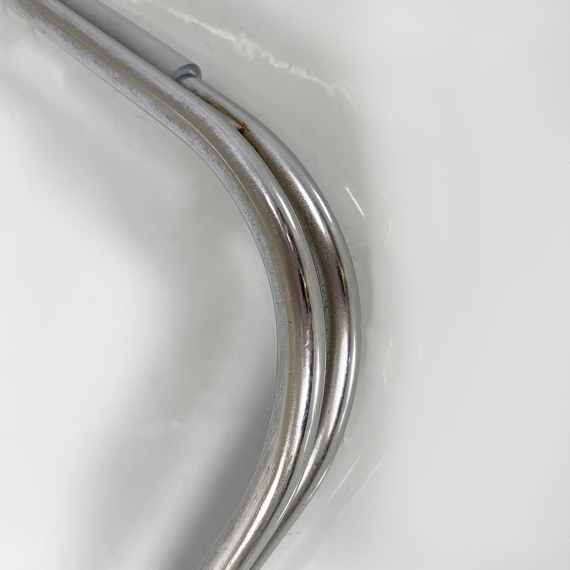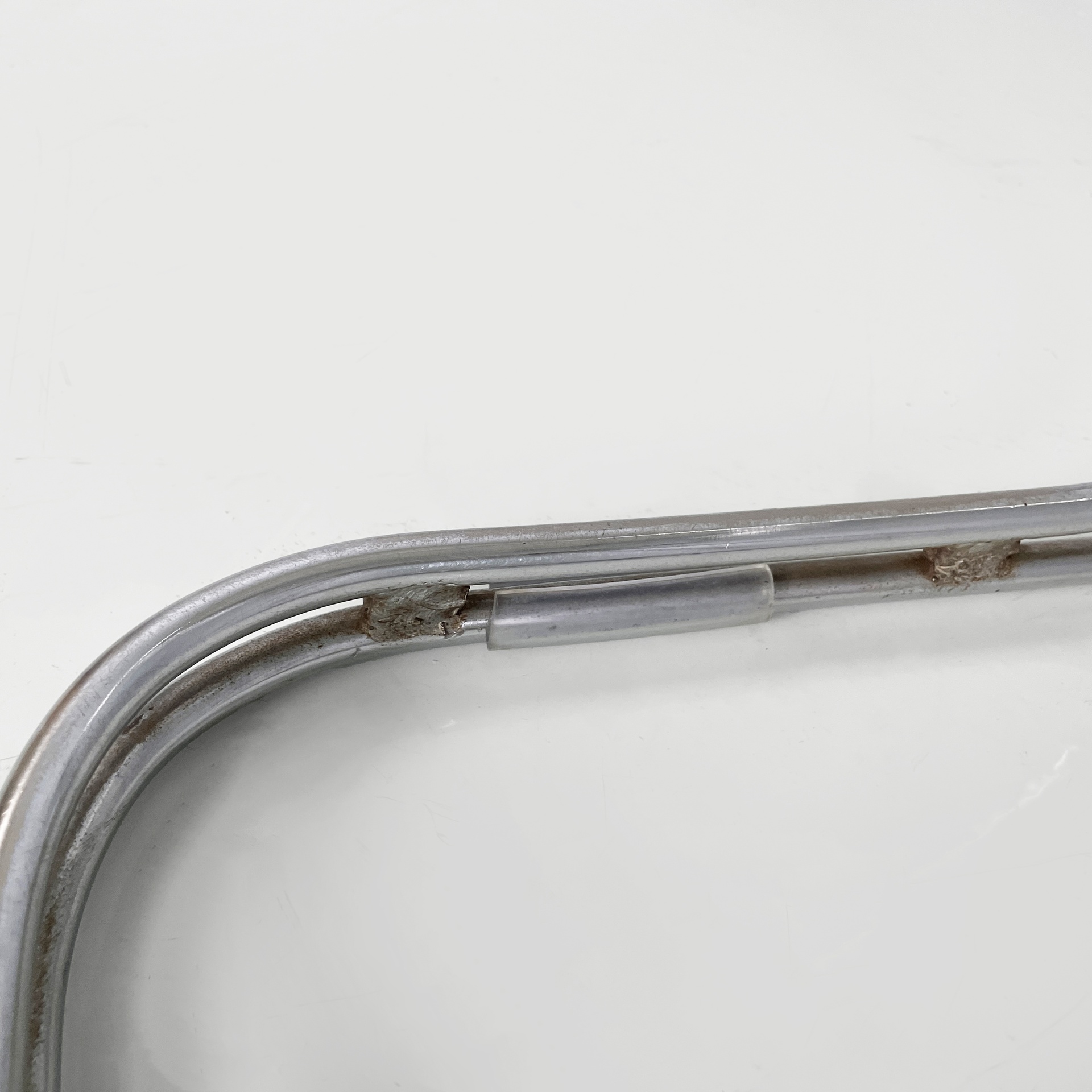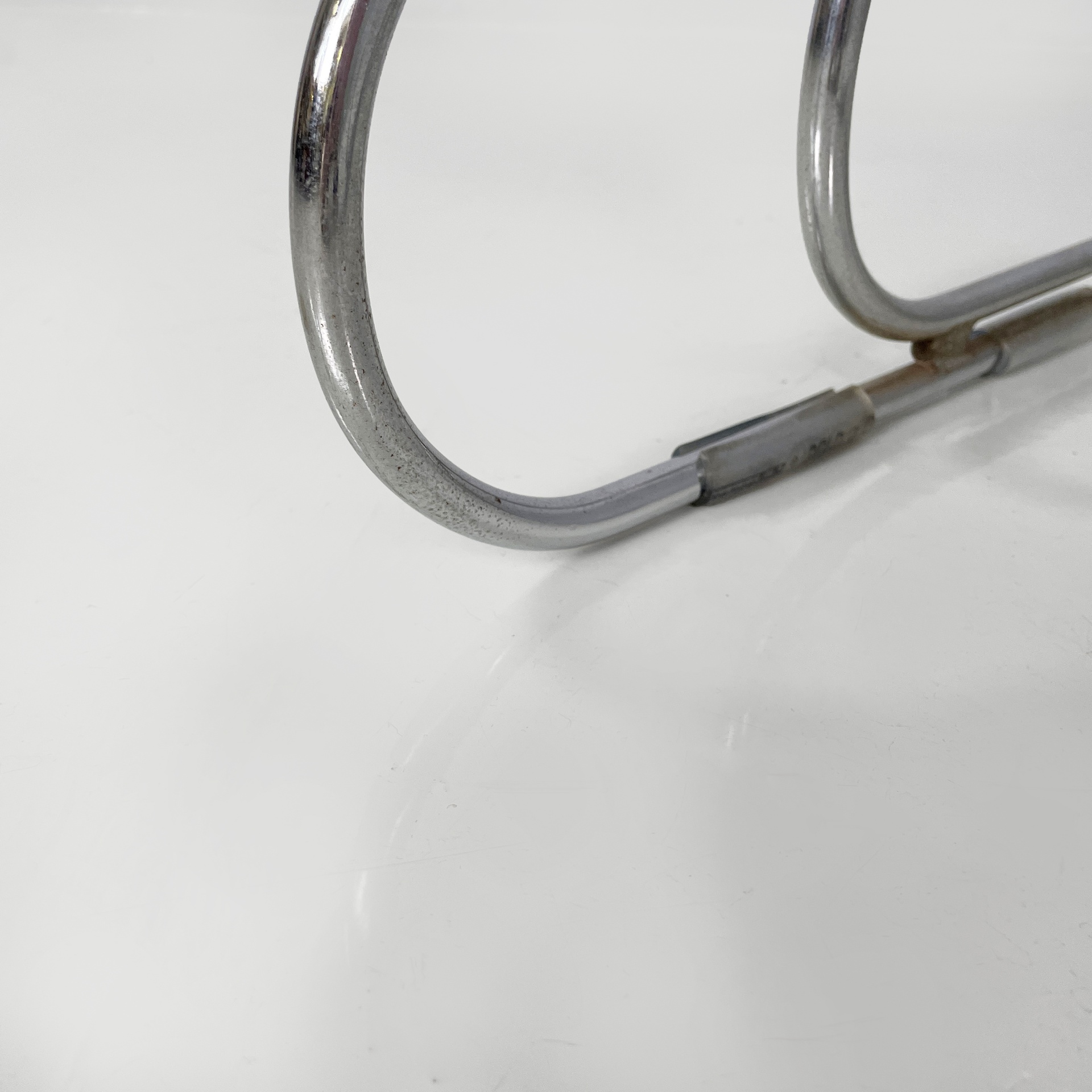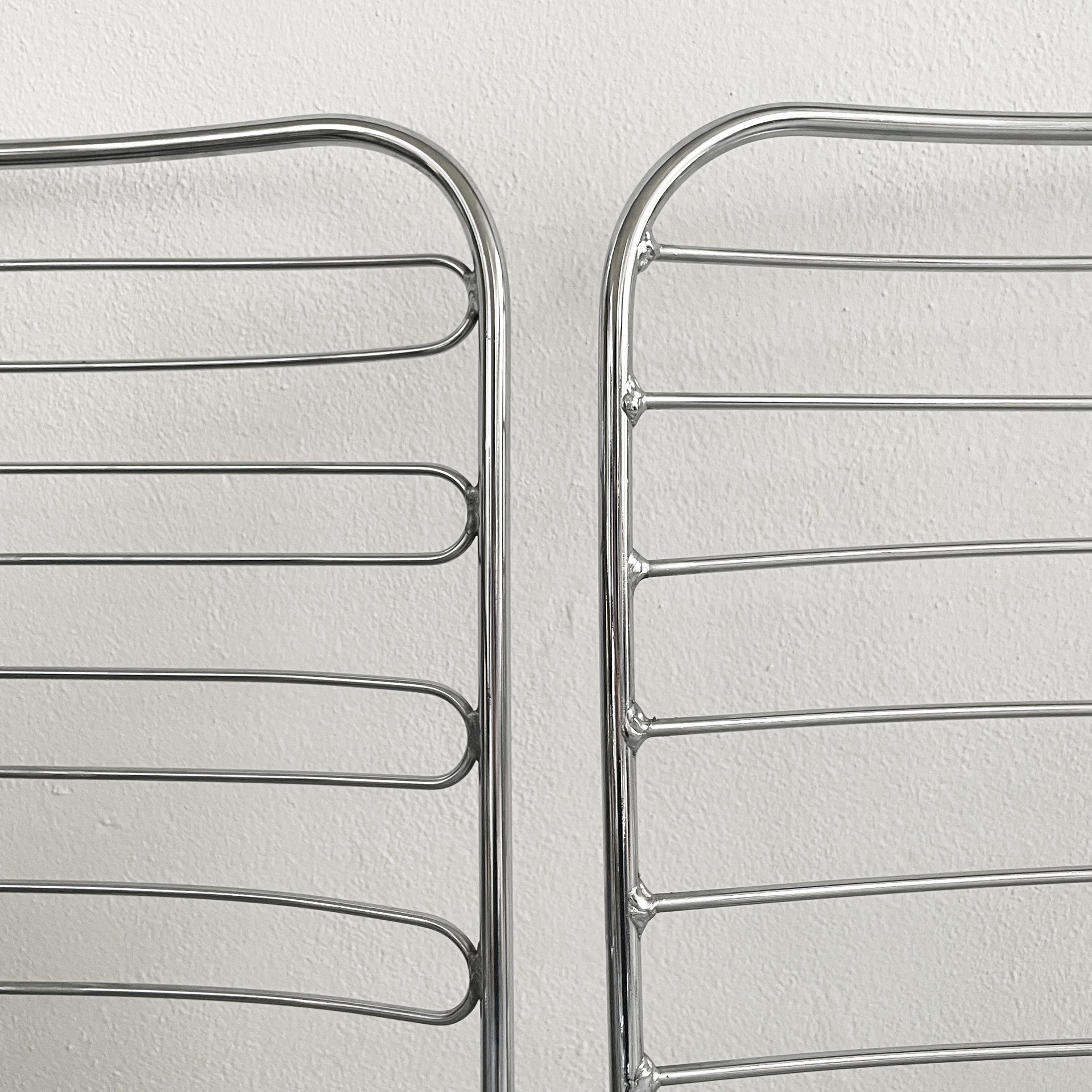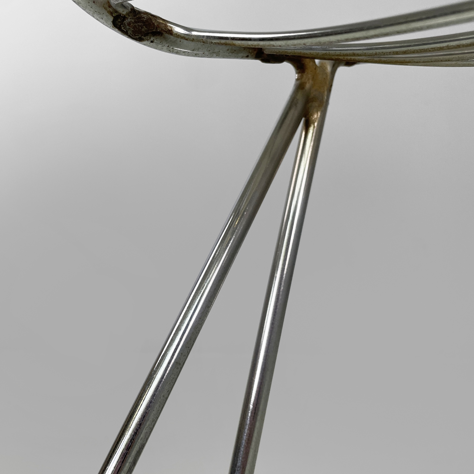 Set di sei sedie interamente in tondino di acciaio cromato. Due sedie presentano un tondino di forma ovale, mentre le altre quattro presentano tondini dritti. Lo schienale e la seduta sono leggermente ricurvi, mentre la zampa è composta da due tondini di acciaio.