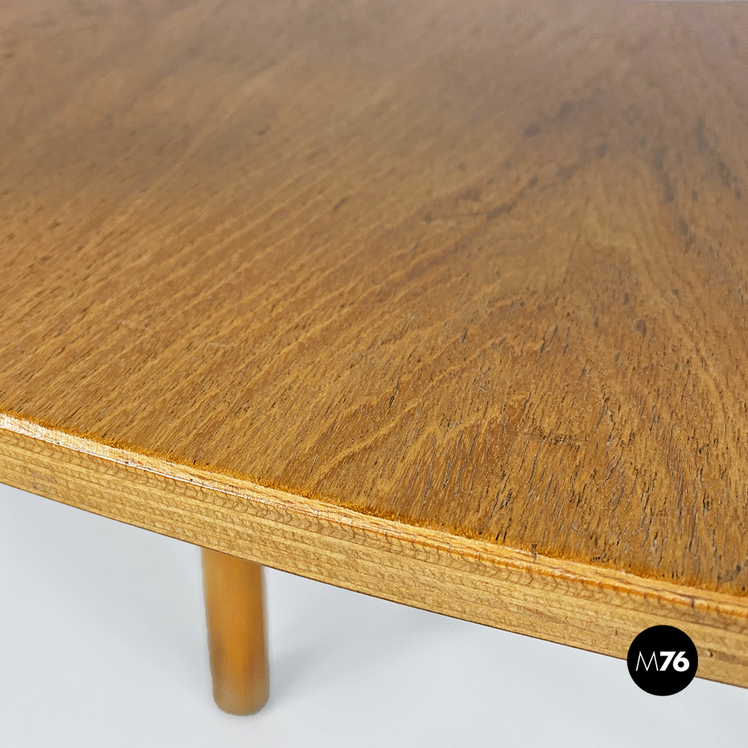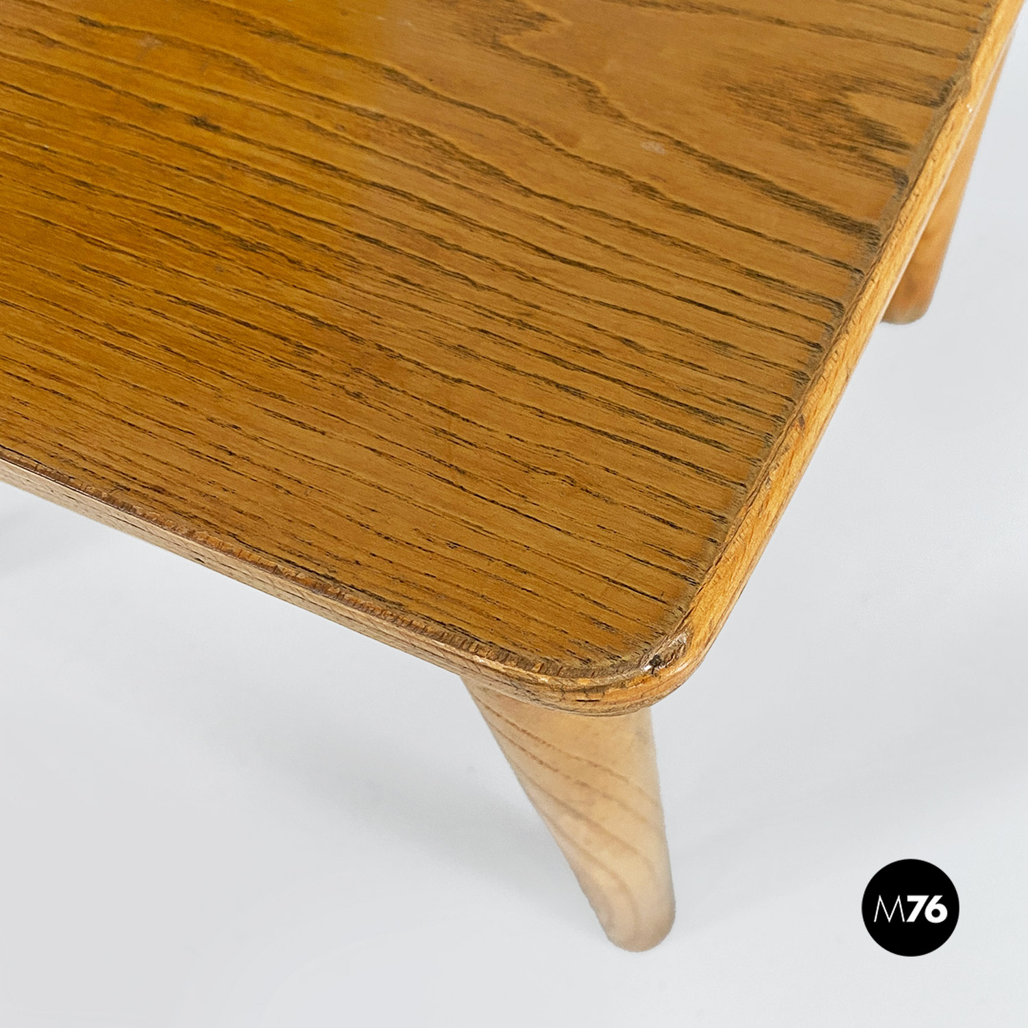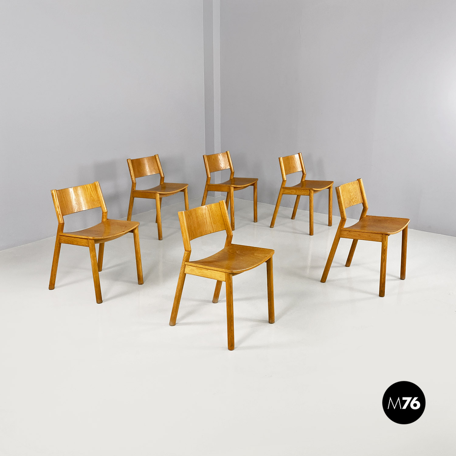 Set di sei sedie in legno massello di rovere con zampe a sezione tonda e schienale curvato e inclinato.