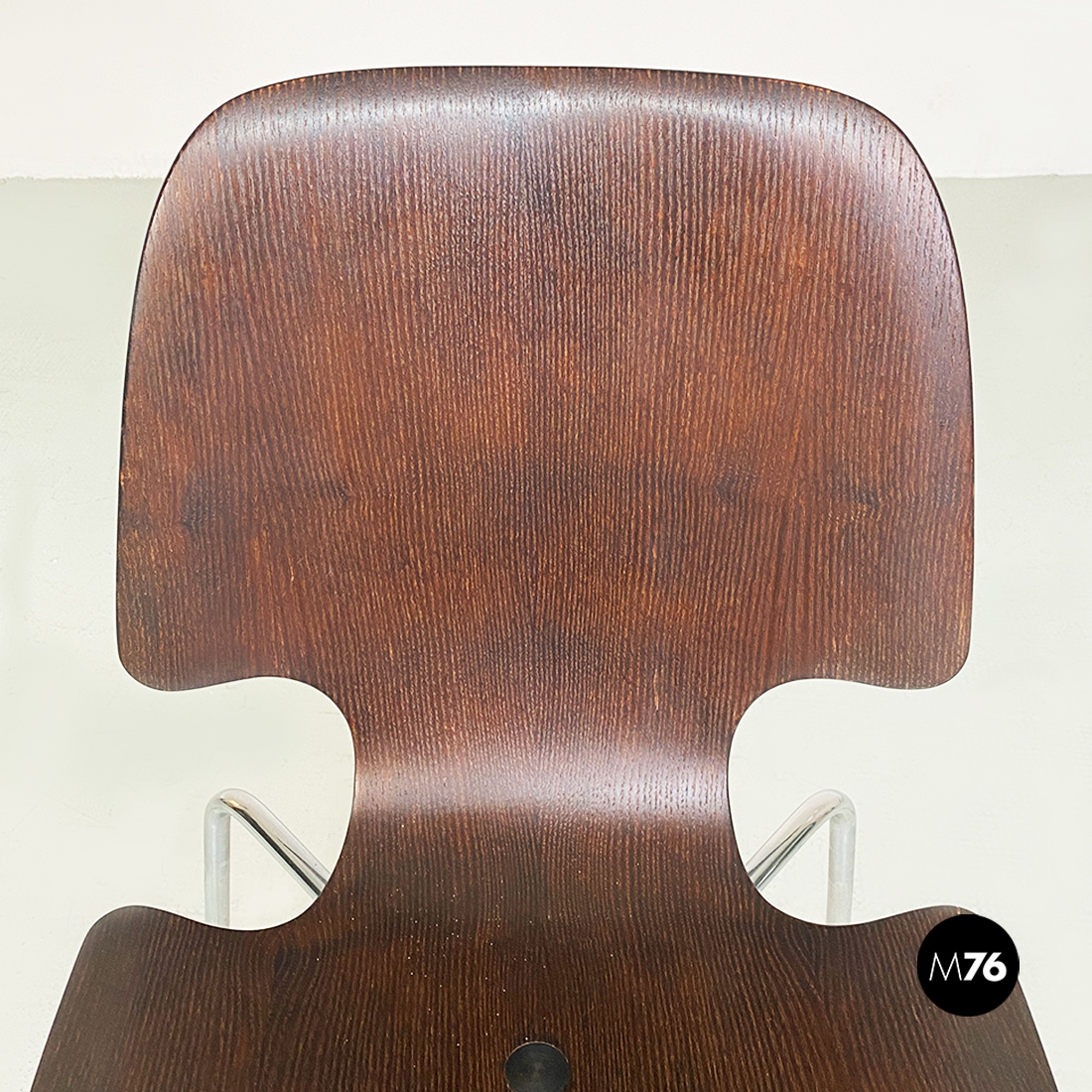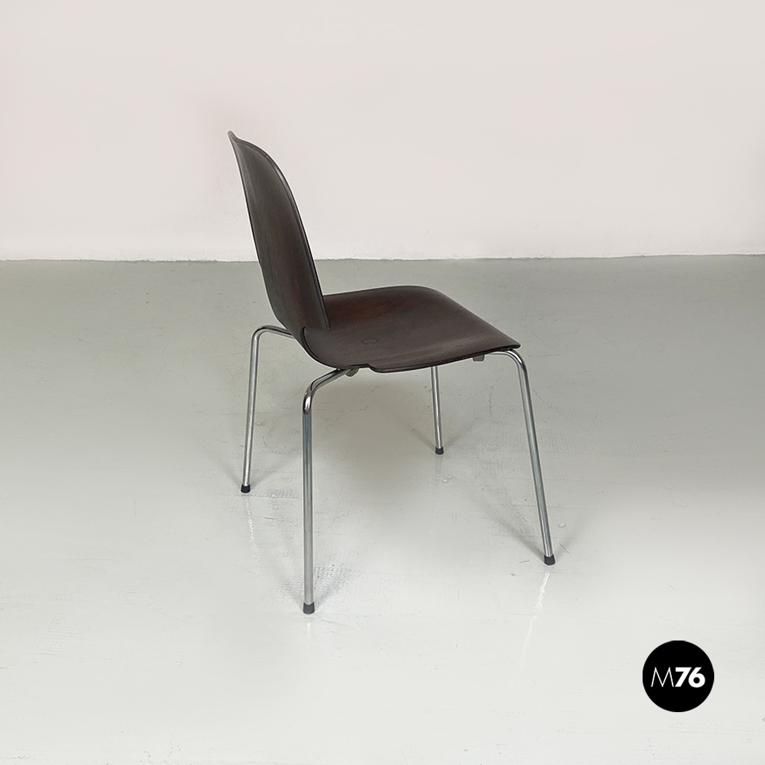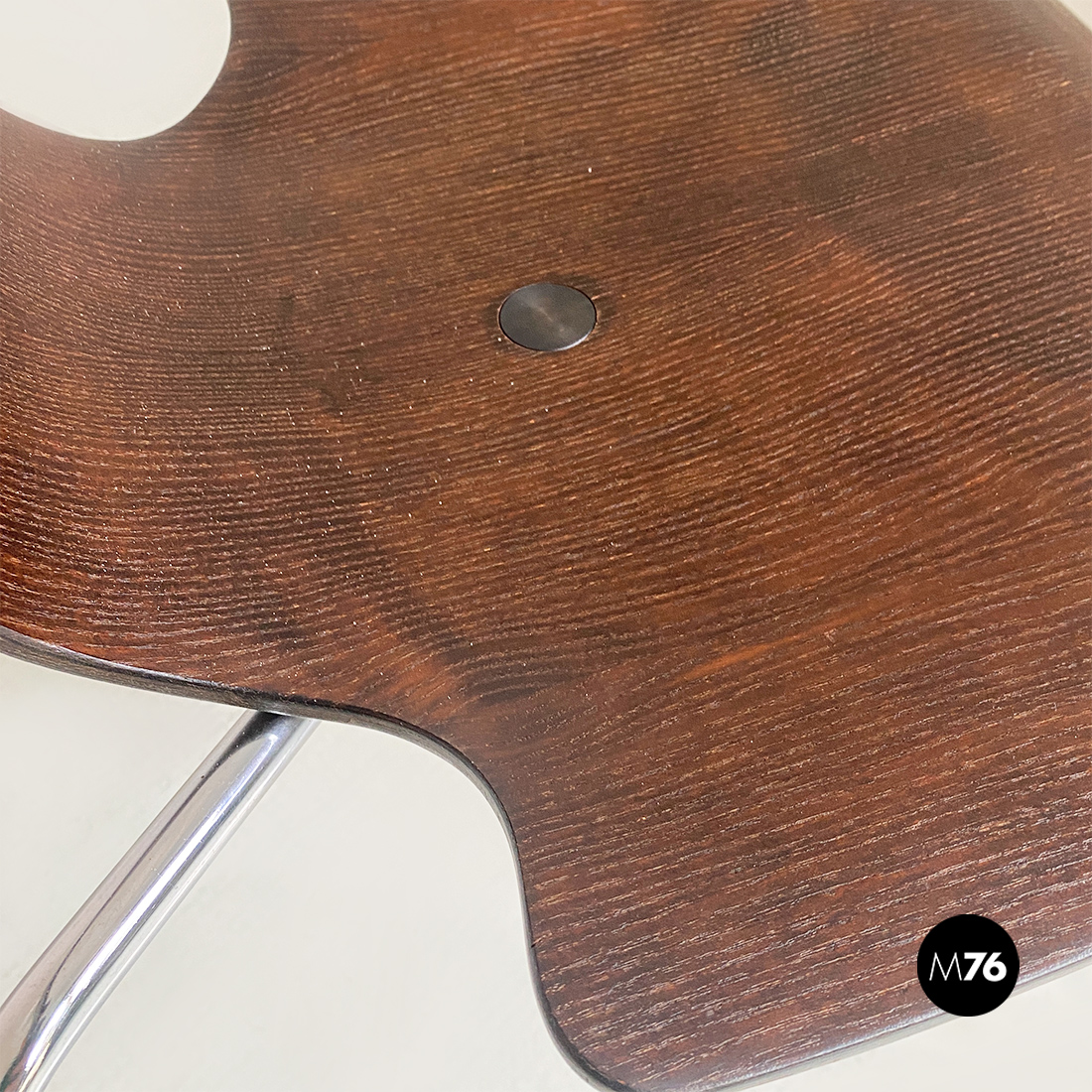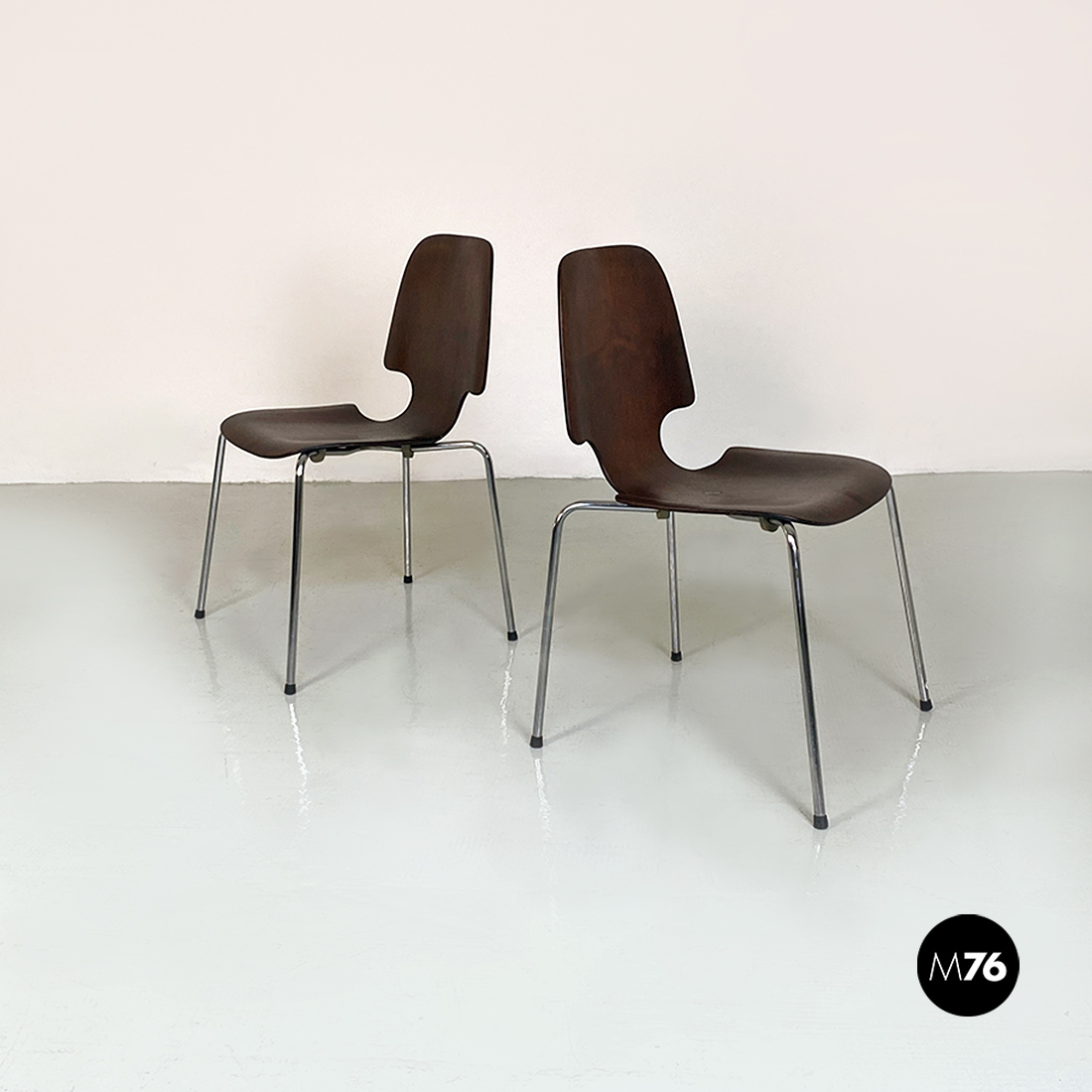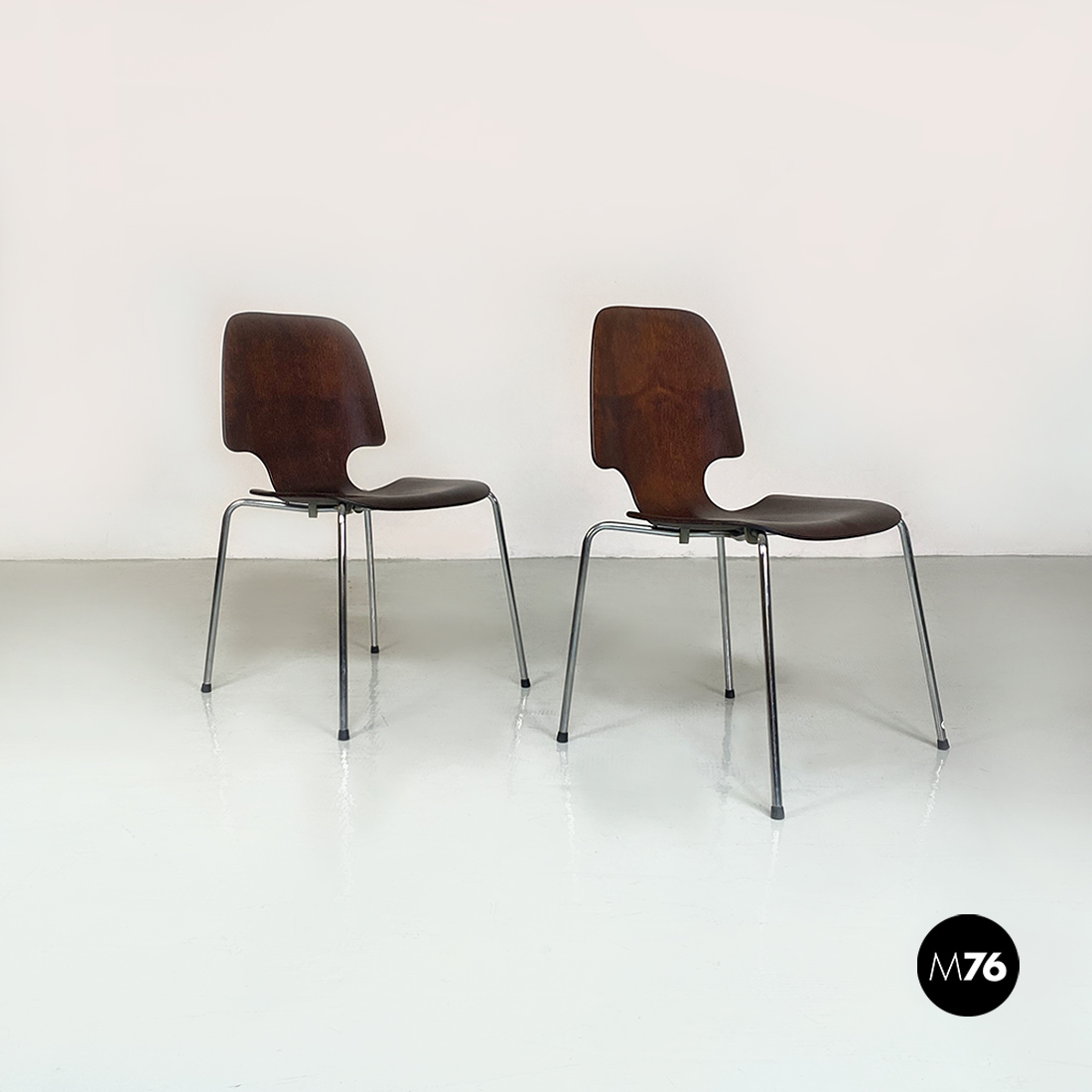Coppia di sedie, con mono scocca in legno scuro, curvata con forma sagomata e zampe in tondino di acciaio cromato, con dettaglio tondo in metallo nella parte centrale della seduta.