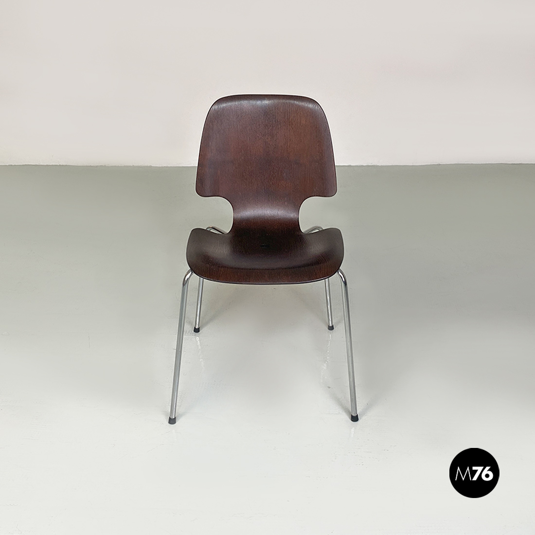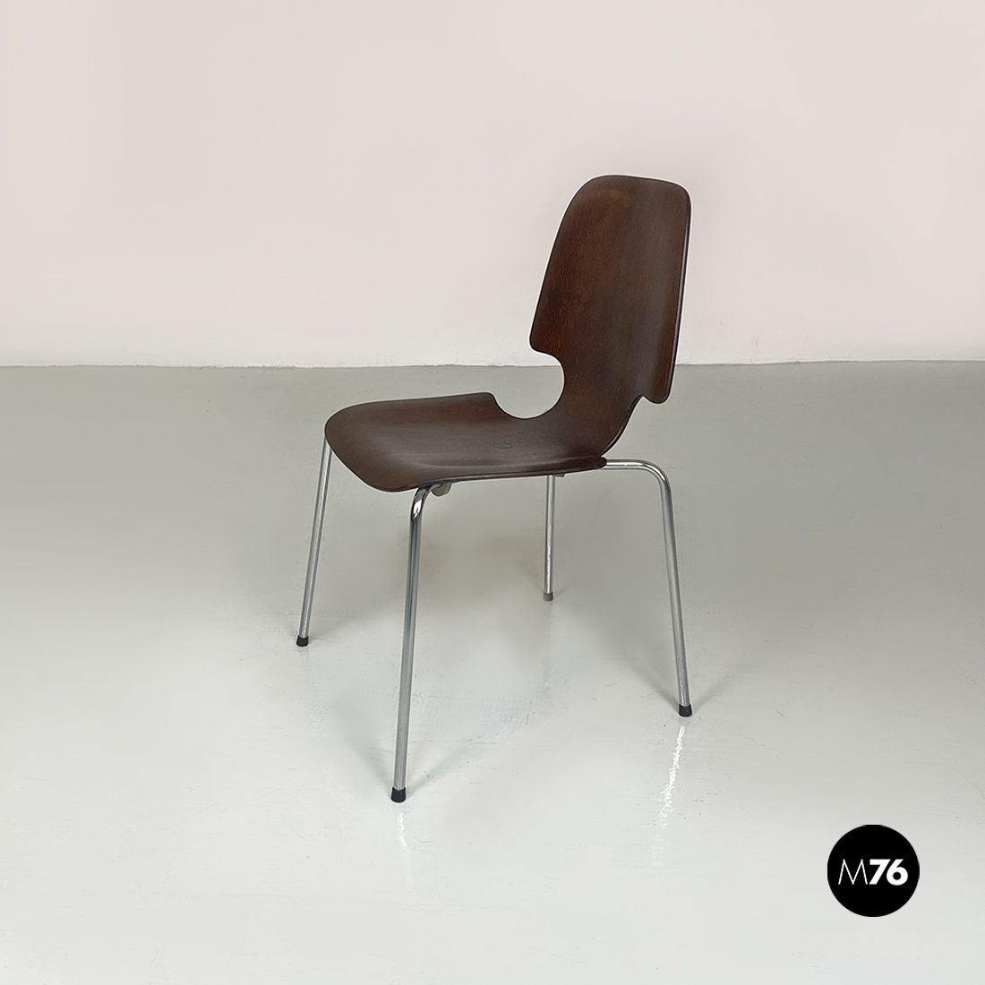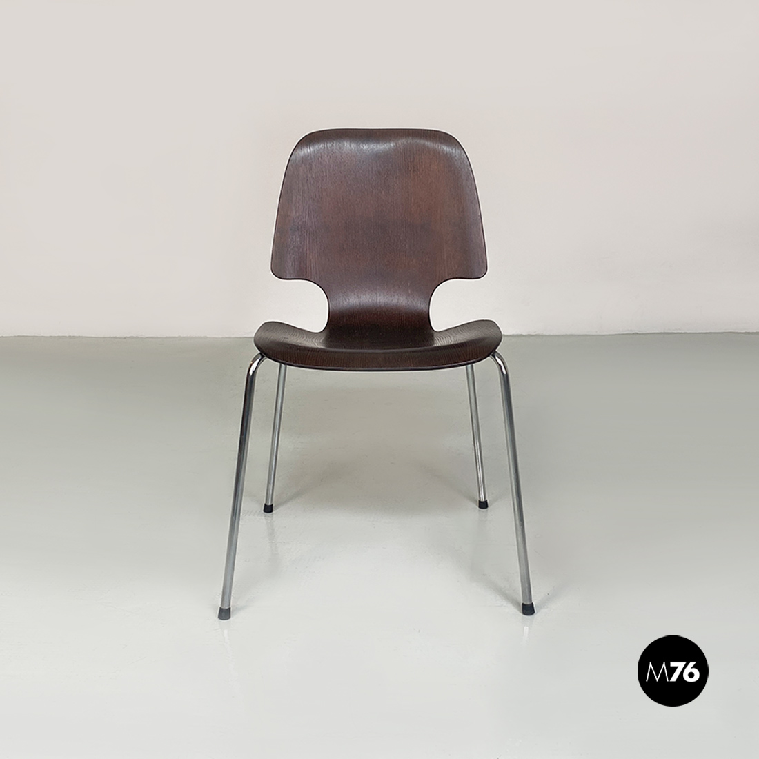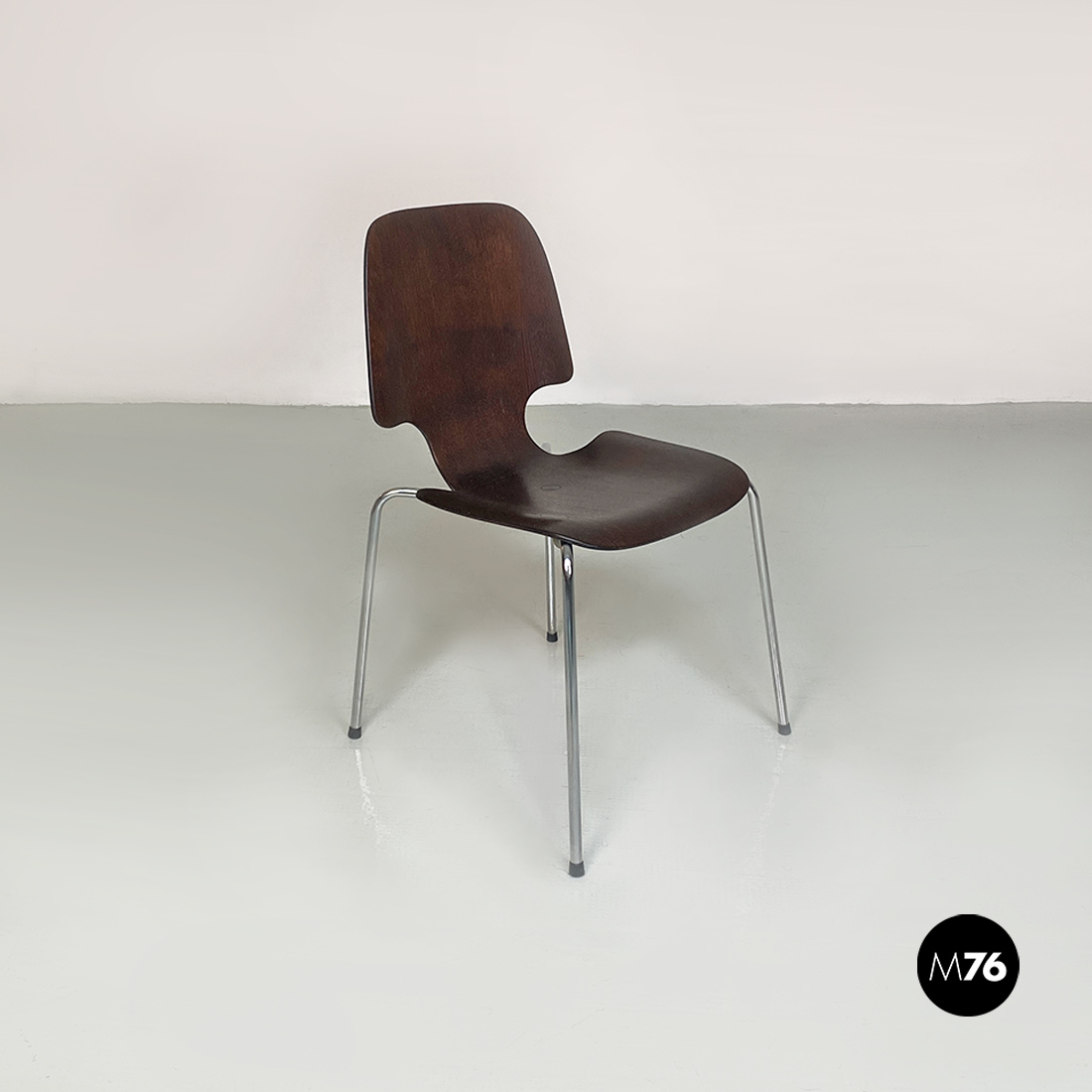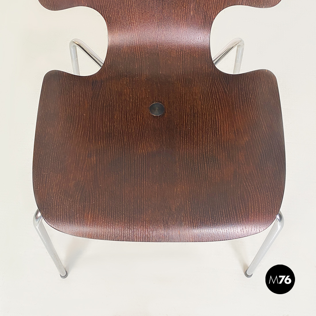 Coppia di sedie, con mono scocca in legno scuro, curvata con forma sagomata e zampe in tondino di acciaio cromato, con dettaglio tondo in metallo nella parte centrale della seduta.
