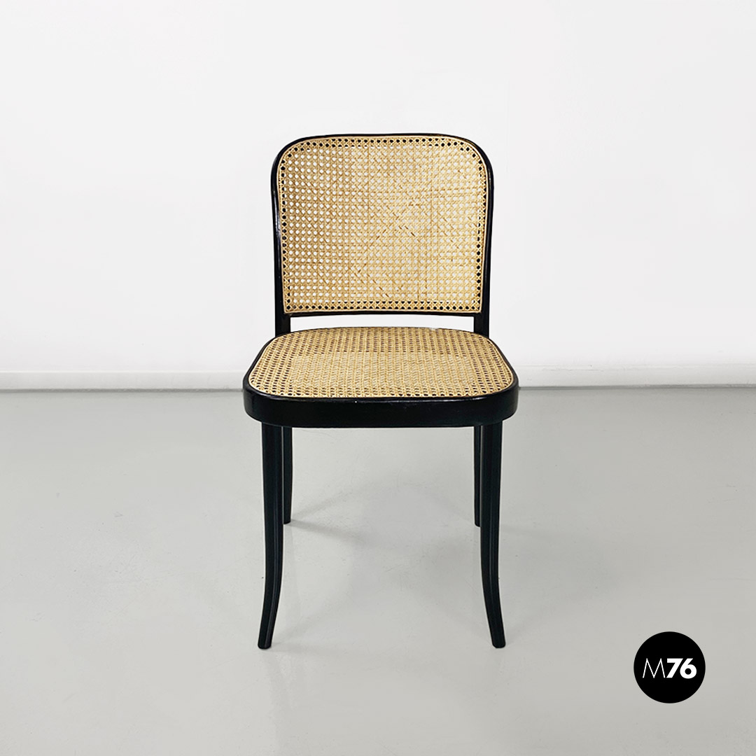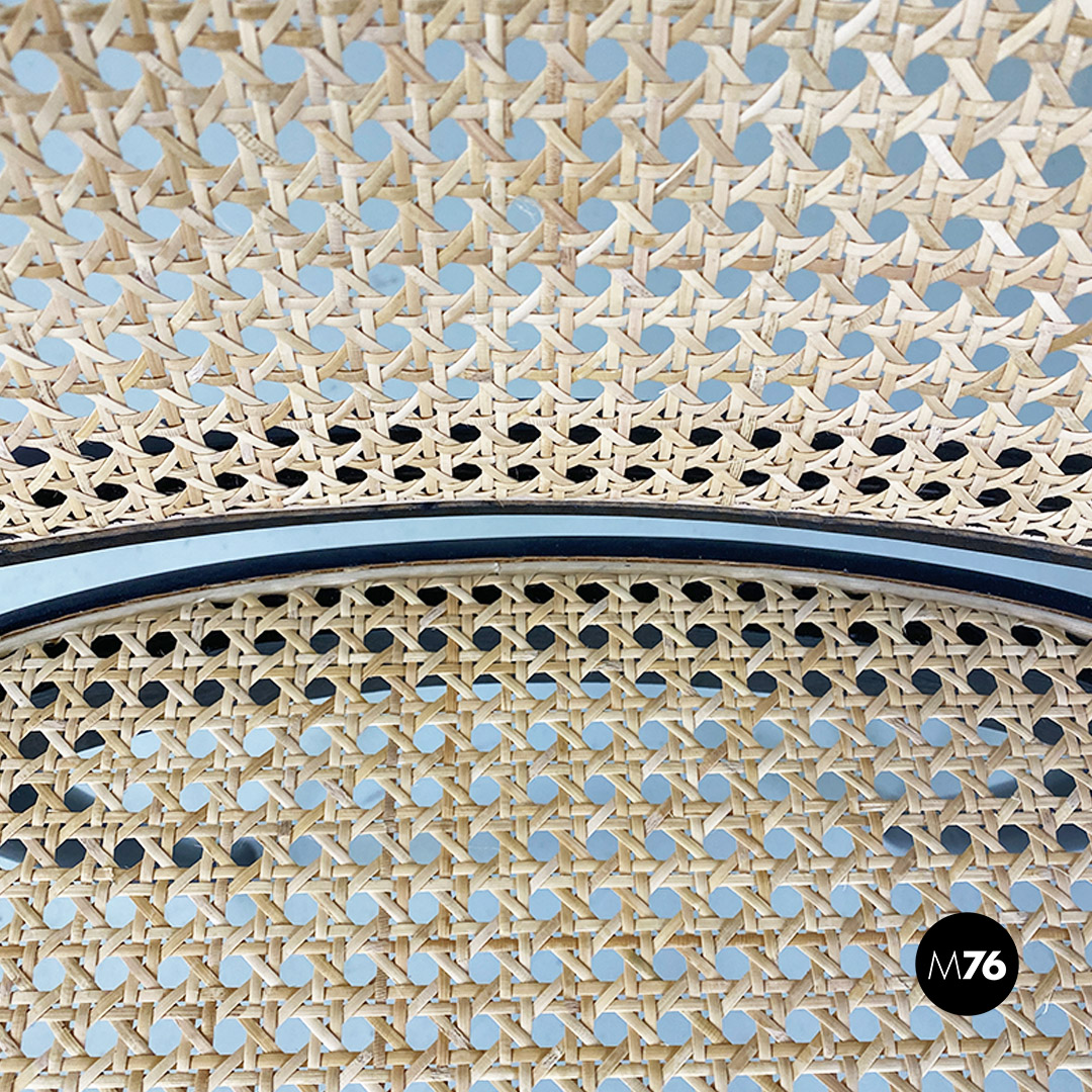 Set di otto sedie con seduta e schienale con angoli arrotondati in legno verniciato nero e in paglia di Vienna, zampe a sezione tonda sempre in legno verniciato nero.