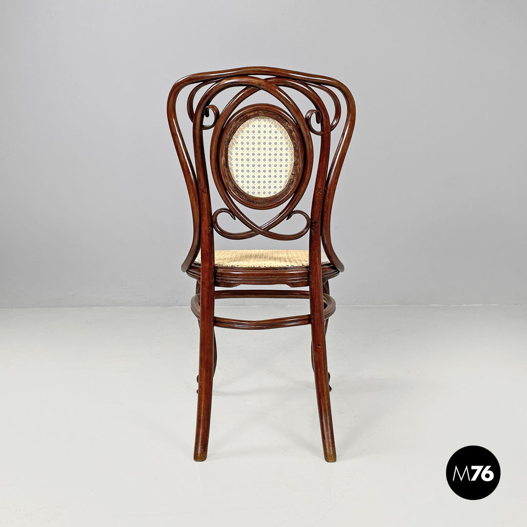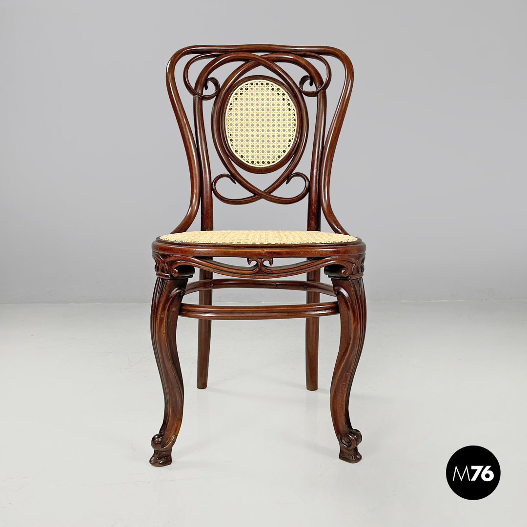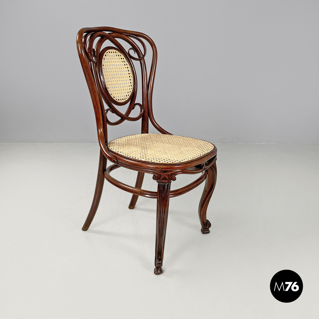 Set di quattro sedie in legno e paglia di Vienna. La struttura in legno presenta profili cilindrici e stondati, e forma delle decorazione a ricciolo sullo schienale e sulle gambe. La seduta e la parte centrale dello schienale sono rivestiti in paglia.