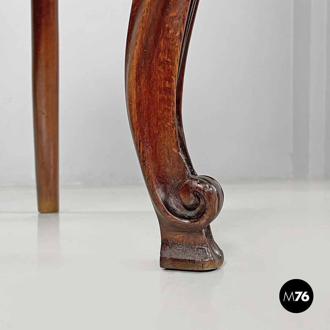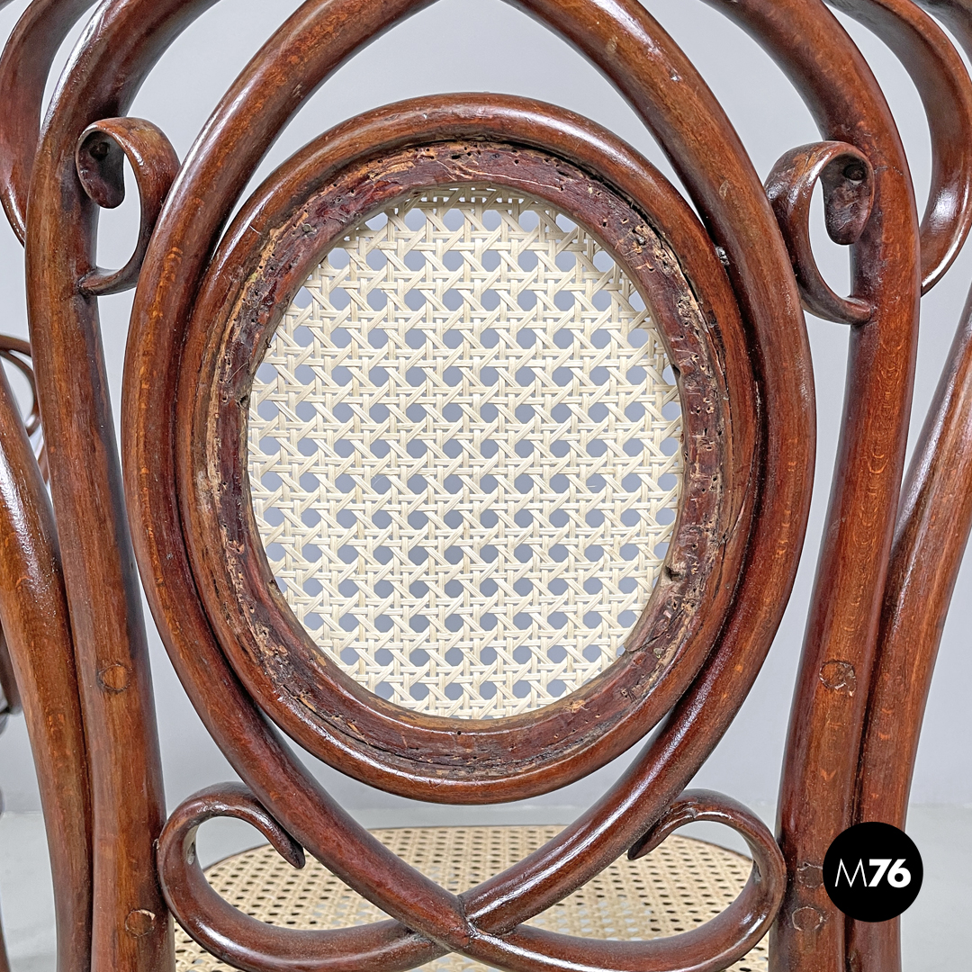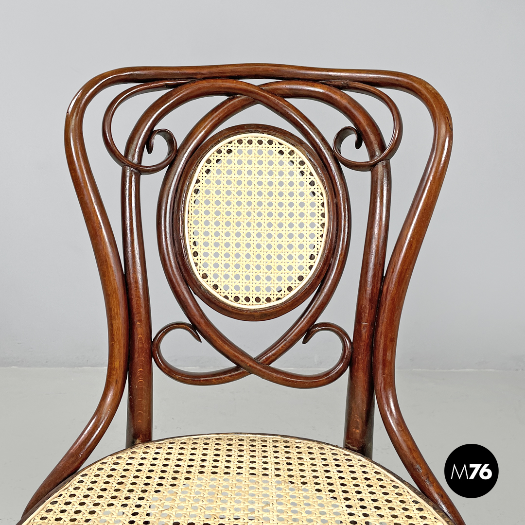 Set di quattro sedie in legno e paglia di Vienna. La struttura in legno presenta profili cilindrici e stondati, e forma delle decorazione a ricciolo sullo schienale e sulle gambe. La seduta e la parte centrale dello schienale sono rivestiti in paglia.