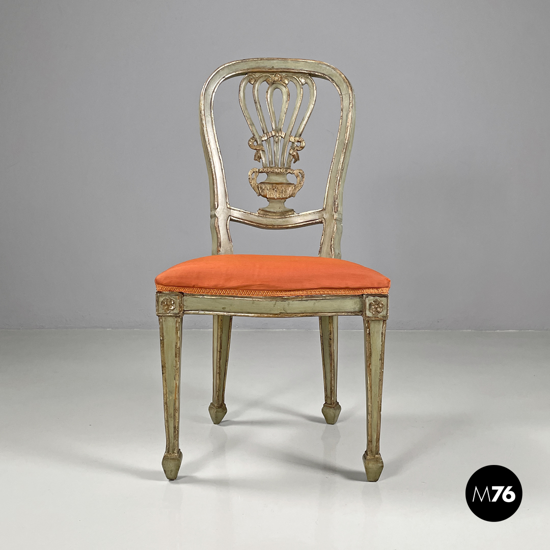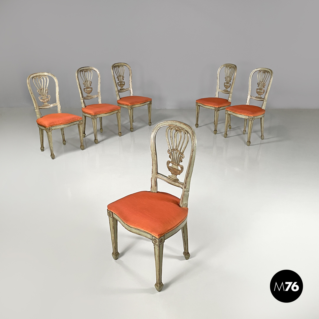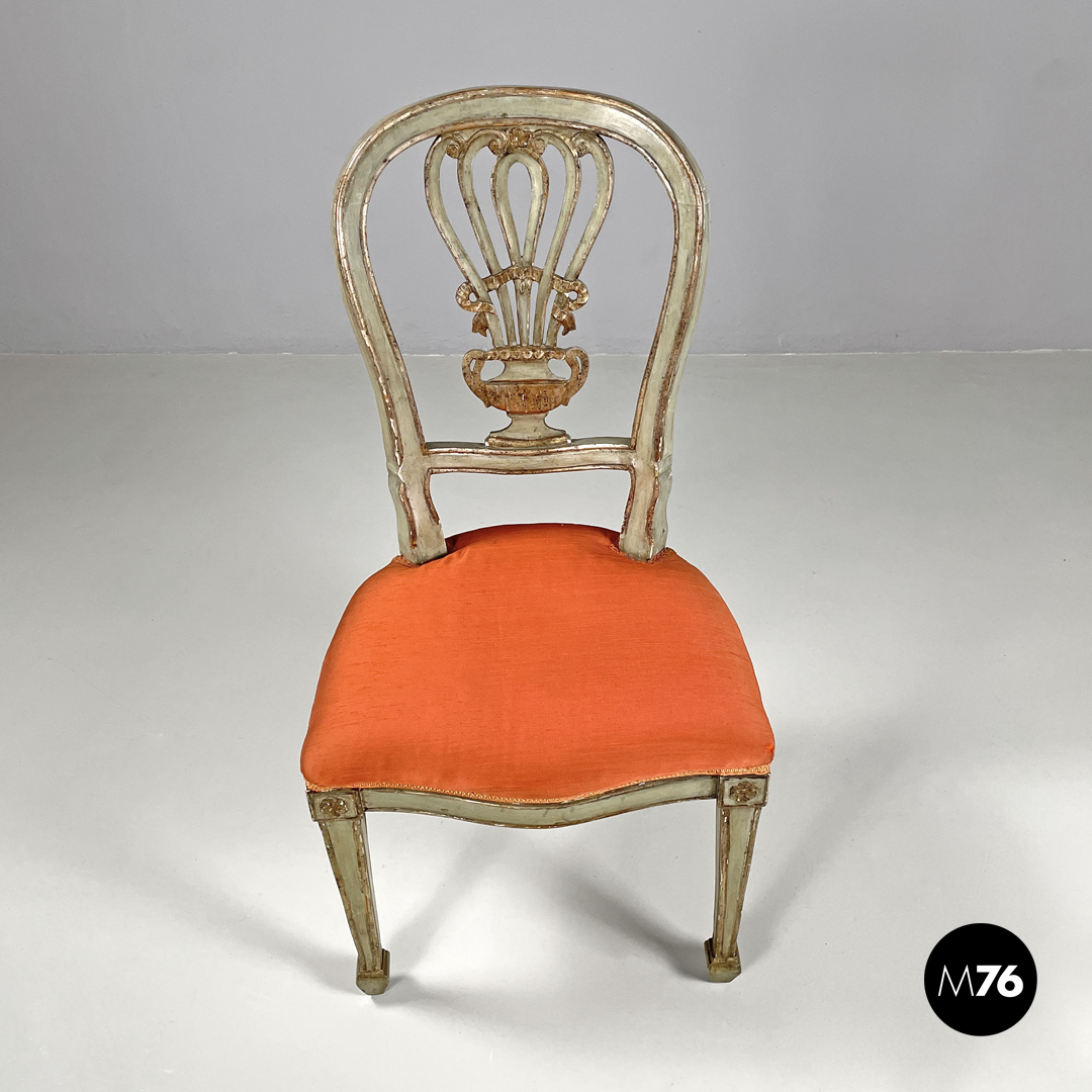 Set di sei sedie con seduta imbottita e rivestita con un tessuto arancione e passamaneria dello stesso tono. La struttura è in legno verniciato verde chiaro con profili e decorazioni dorati, lo schienale presenta un elemento centrale scolpito a forma di vaso con decorazioni che richiamano il mondo naturale. Le quattro gambe terminano con piedini squadrati.