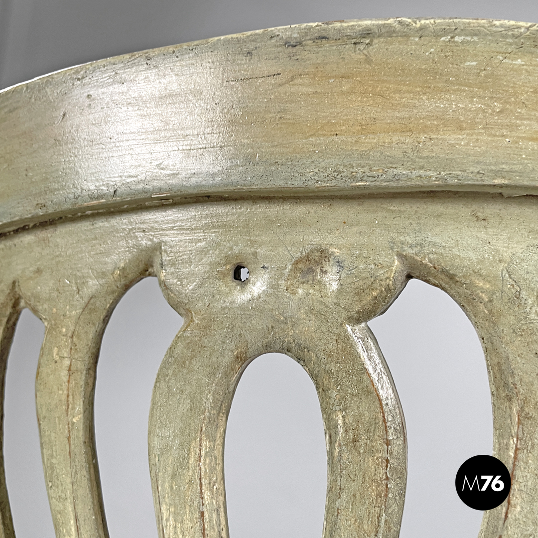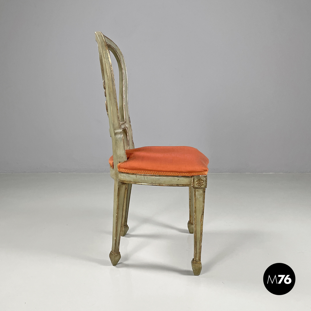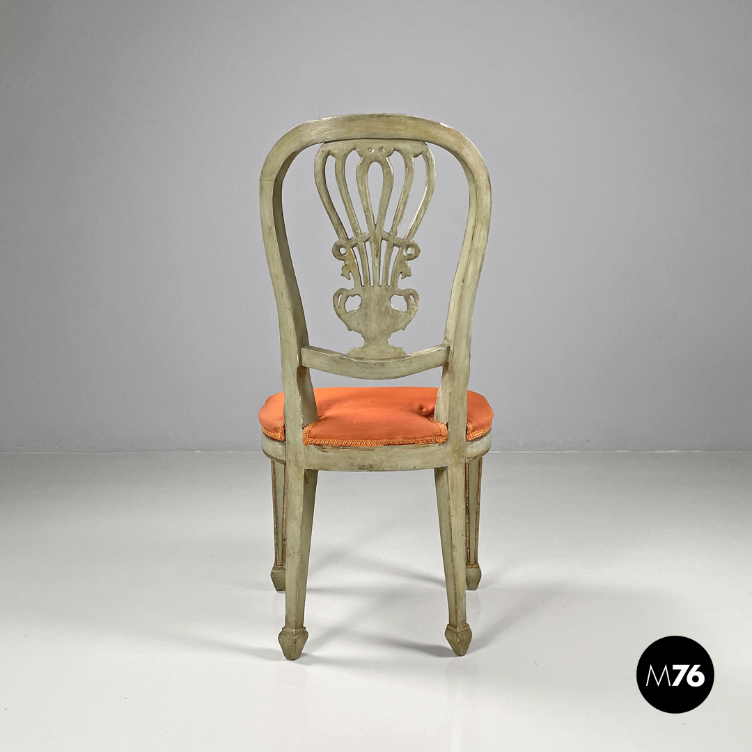 Set di sei sedie con seduta imbottita e rivestita con un tessuto arancione e passamaneria dello stesso tono. La struttura è in legno verniciato verde chiaro con profili e decorazioni dorati, lo schienale presenta un elemento centrale scolpito a forma di vaso con decorazioni che richiamano il mondo naturale. Le quattro gambe terminano con piedini squadrati.