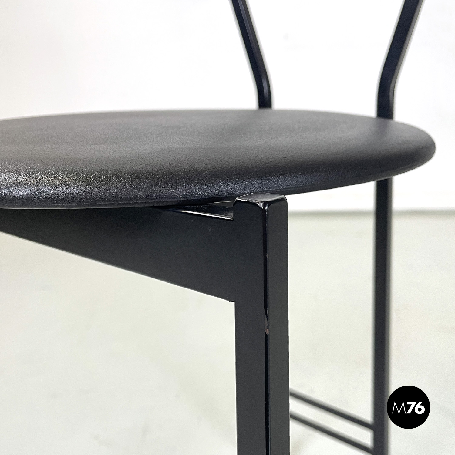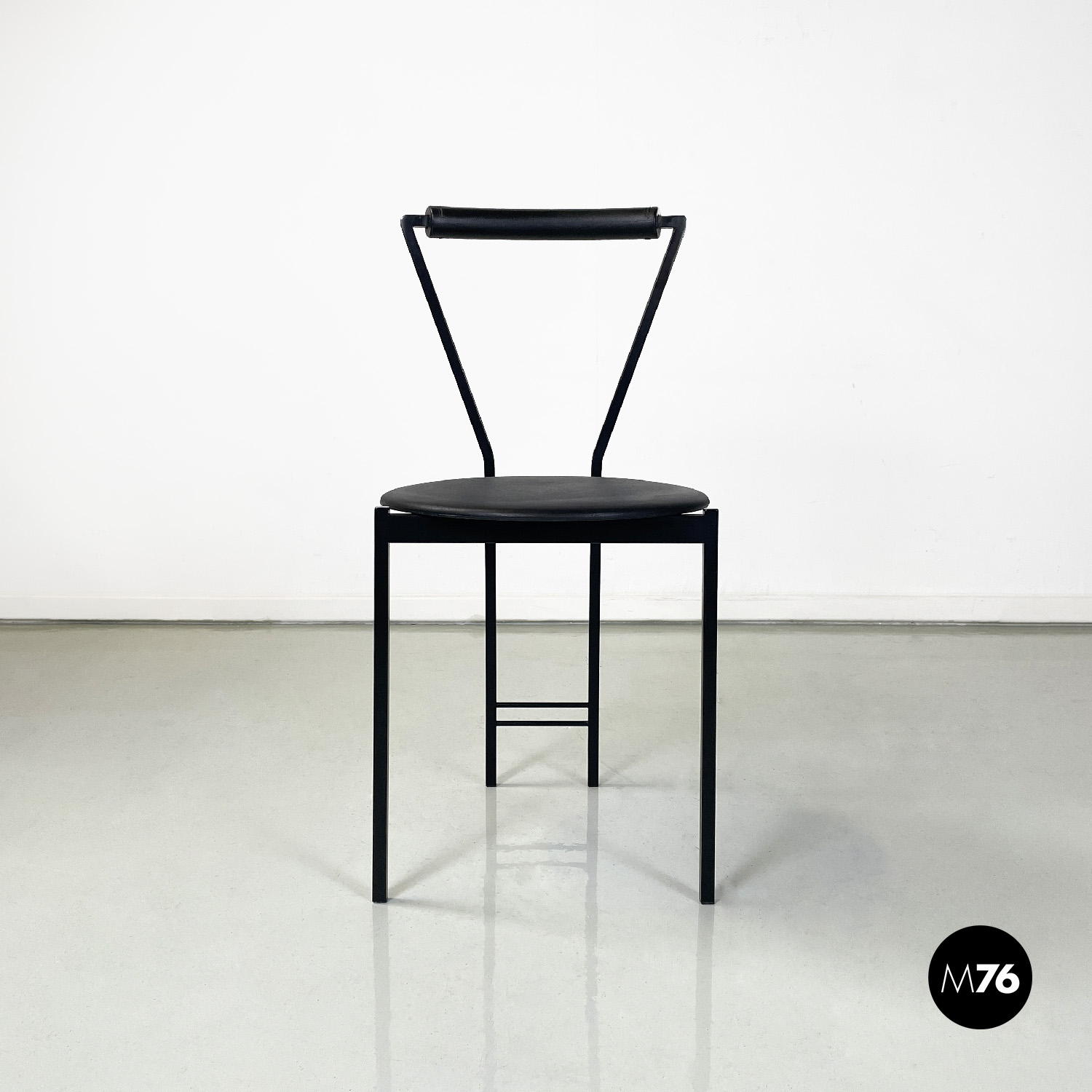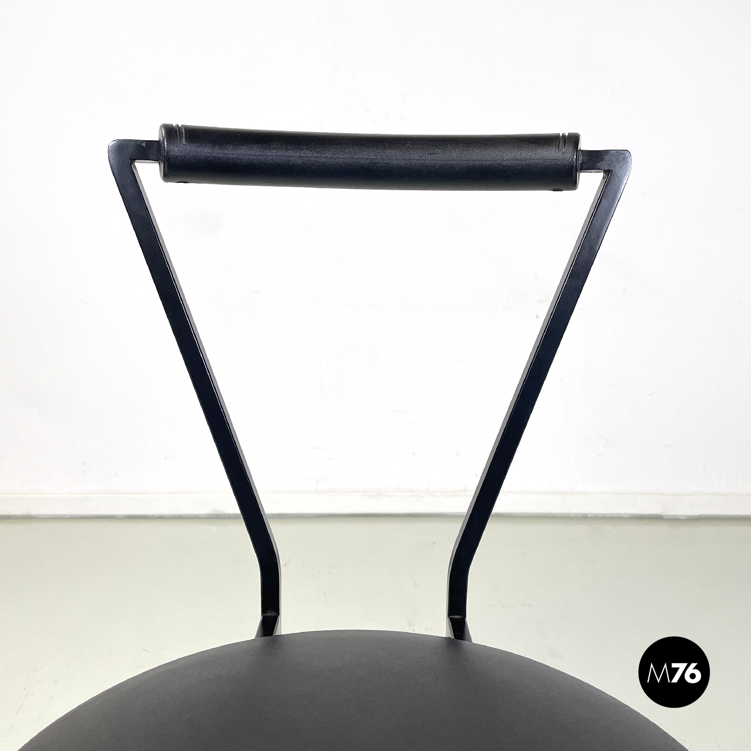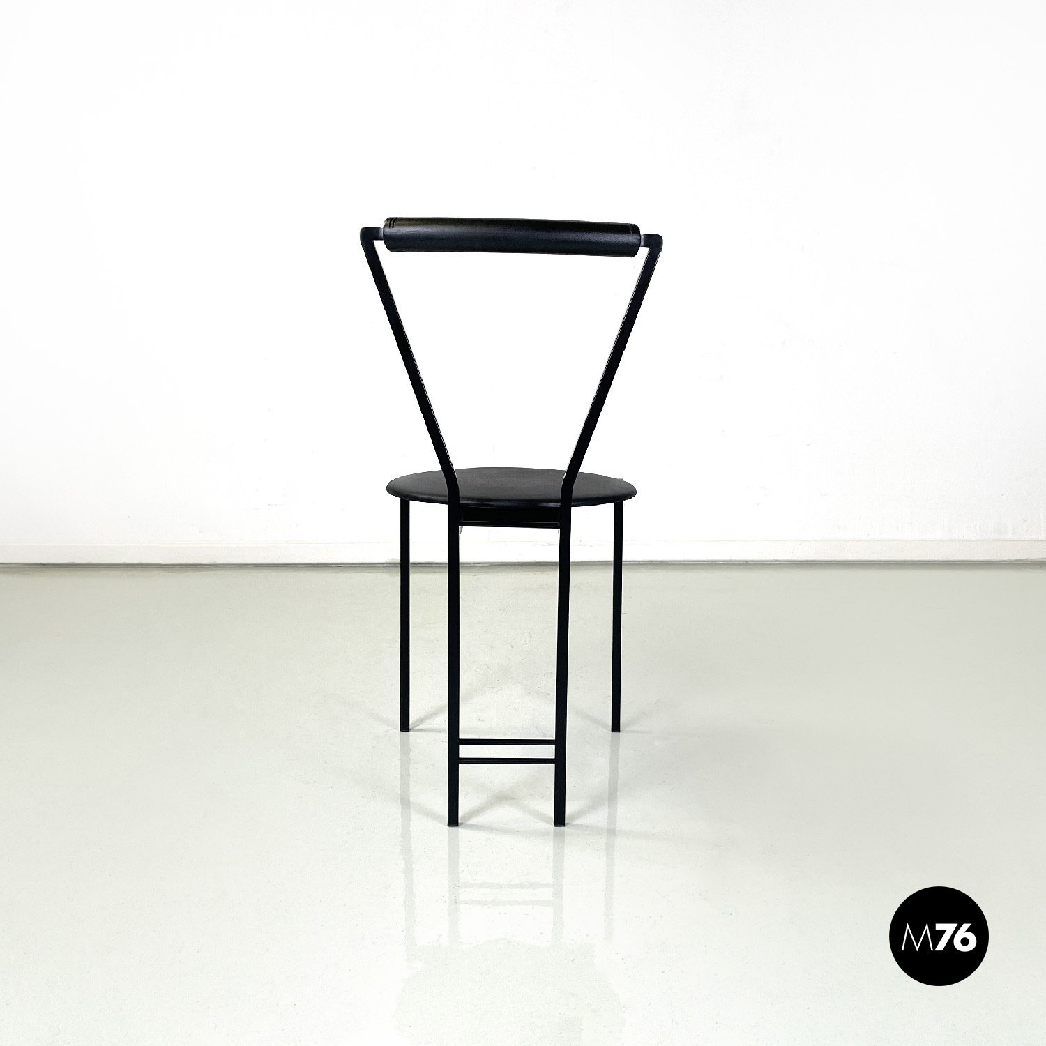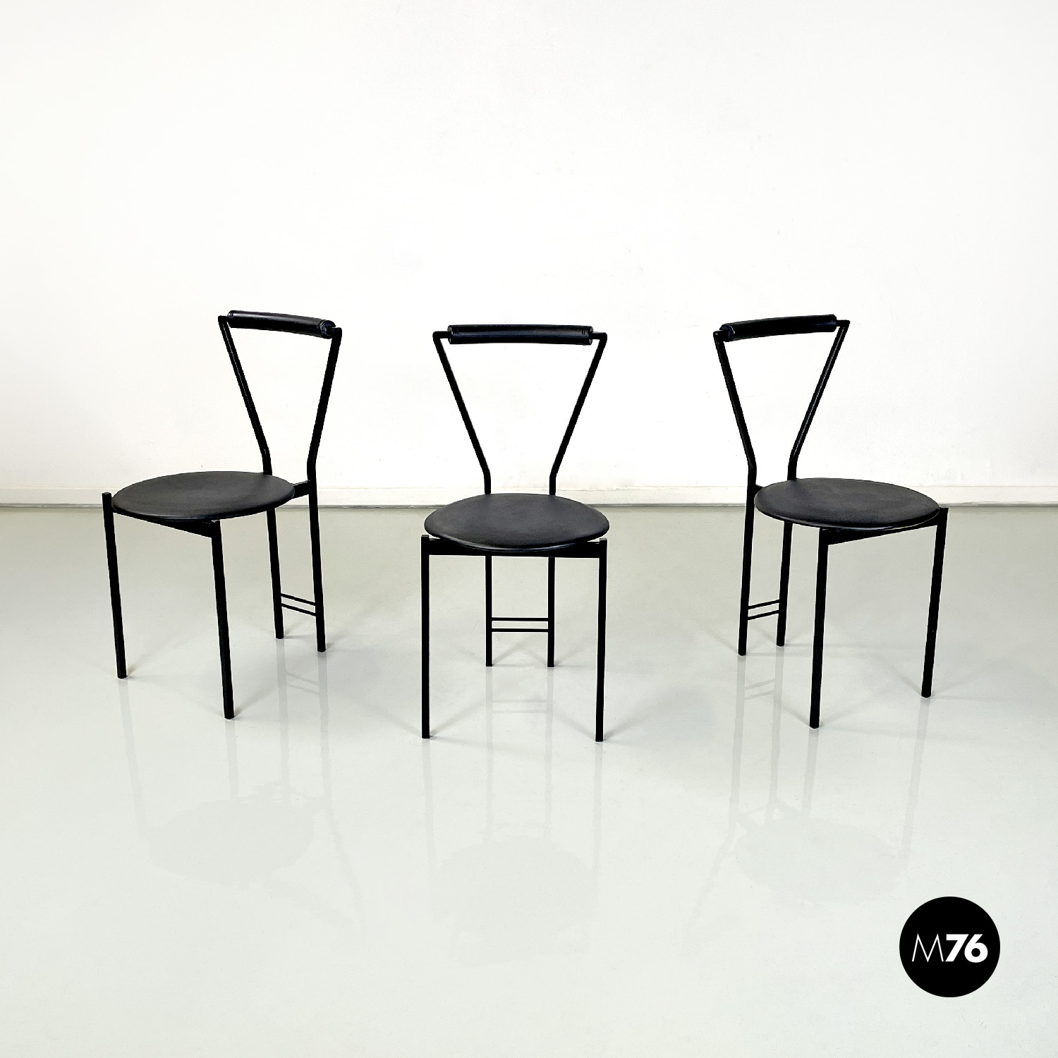 Set di tre sedie con seduta tonda in gomma nera. Lo schienale è composto da una struttura di metallo verniciato nero a sezione quadrata e di forma triangolare, avvolto nella parte alta da un cilindro in gomma nera. Le zampe di metallo verniciato nero sono a sezione quadrata.