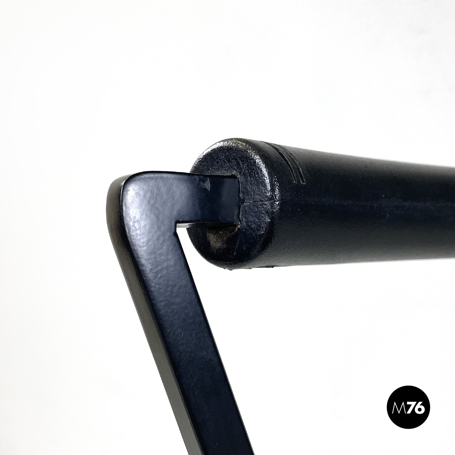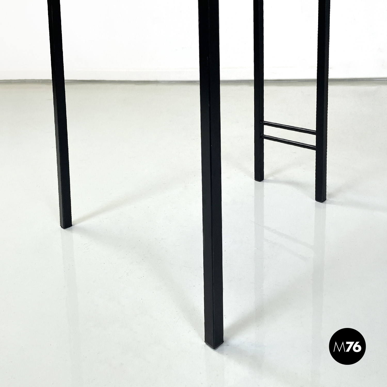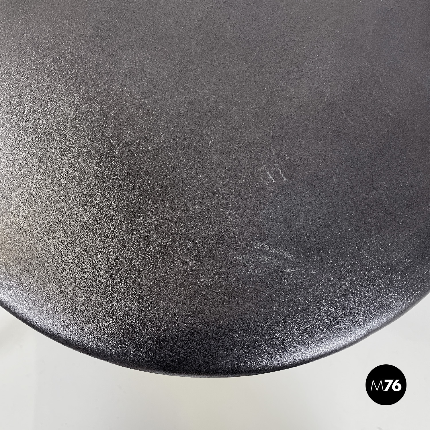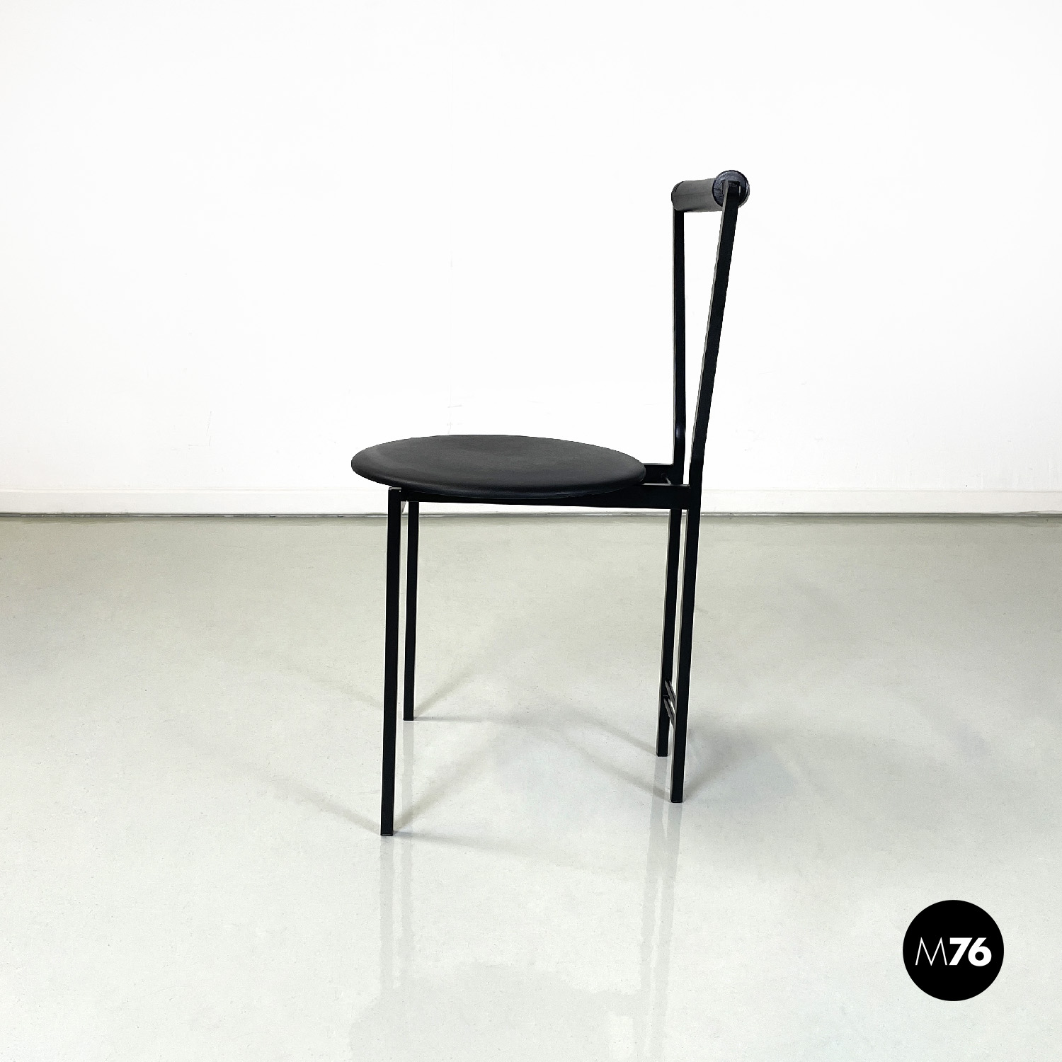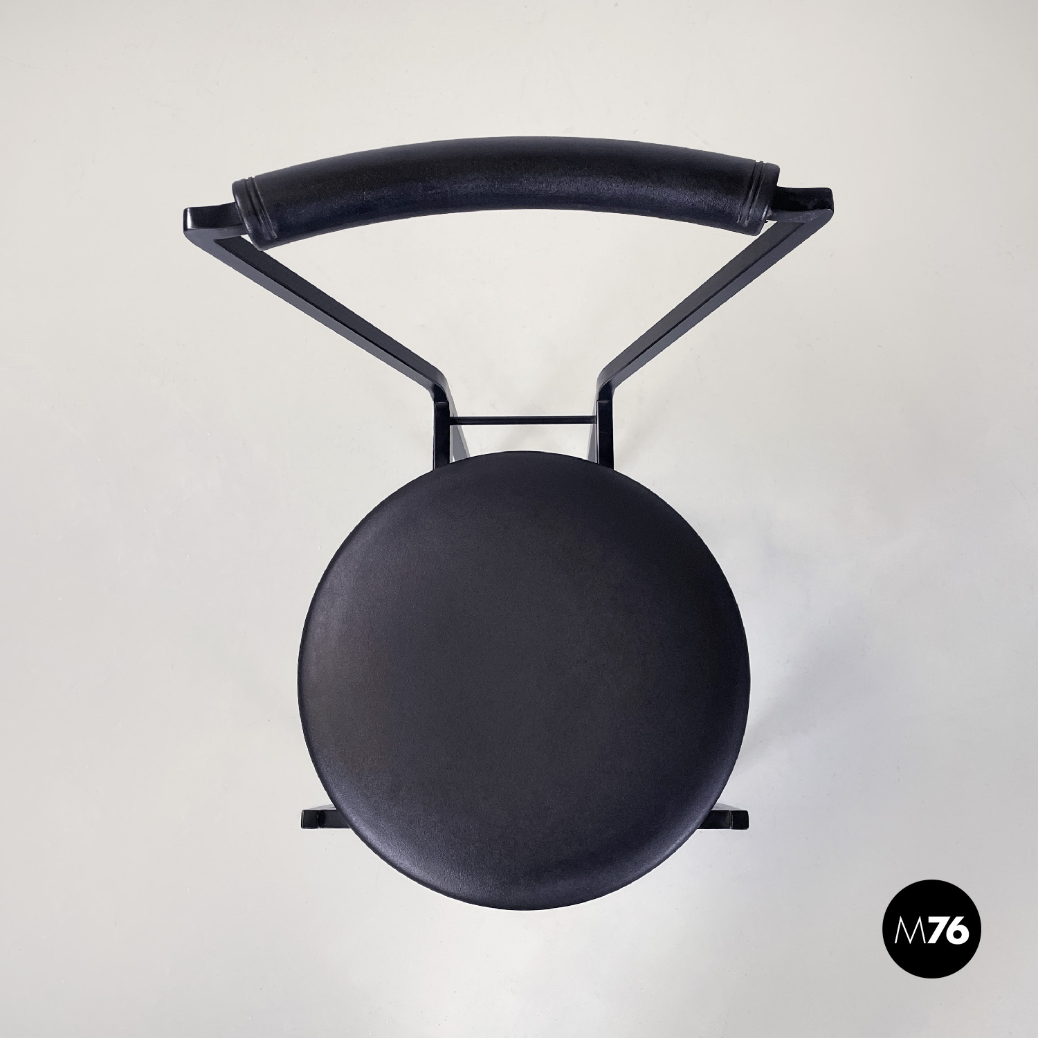 Set di tre sedie con seduta tonda in gomma nera. Lo schienale è composto da una struttura di metallo verniciato nero a sezione quadrata e di forma triangolare, avvolto nella parte alta da un cilindro in gomma nera. Le zampe di metallo verniciato nero sono a sezione quadrata.