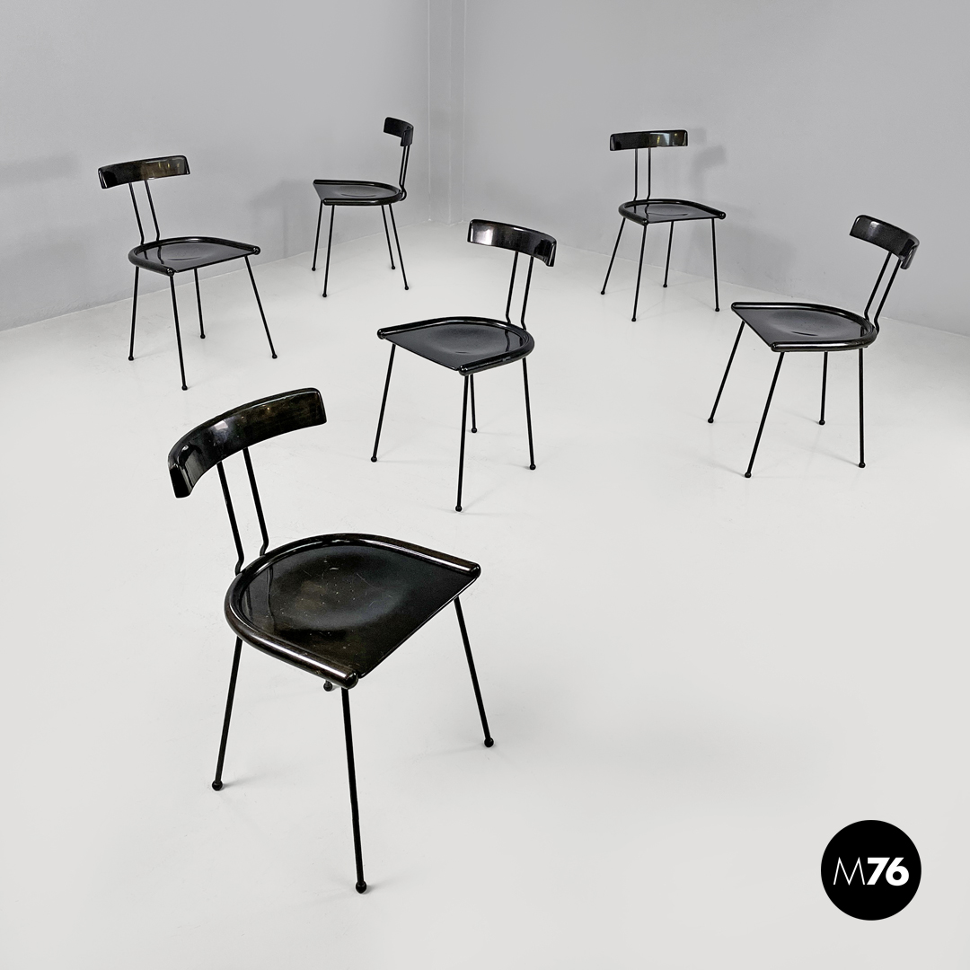 Set di sei sedie nere in metallo e legno. Lo schienale e la seduta seguono linee tondeggianti, il profilo della seduta è più grande e stondato e presenta nove piccoli fori al centro. La struttura è in tondino di metallo, i piedini sono sferici in plastica nera.
