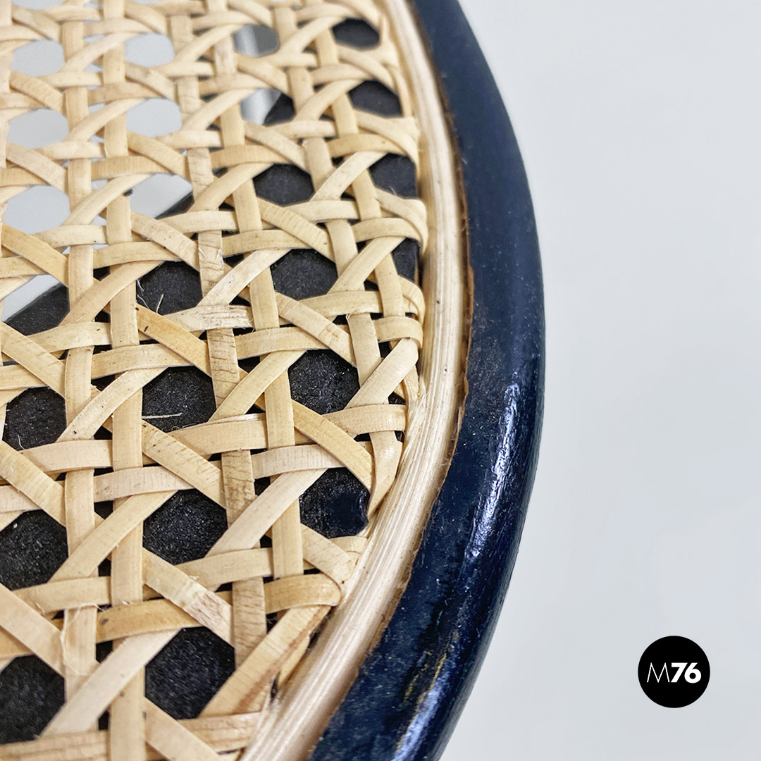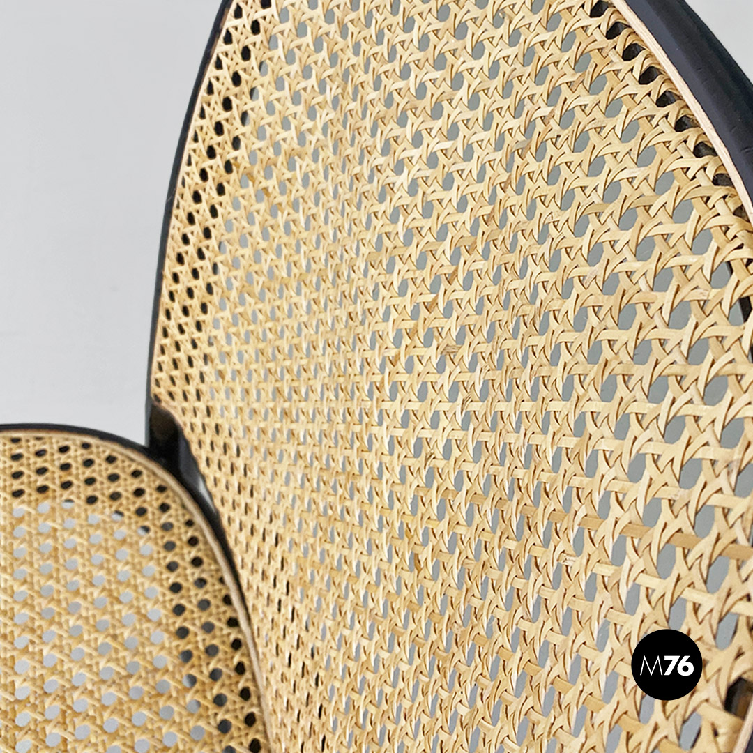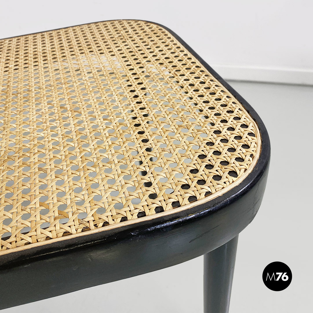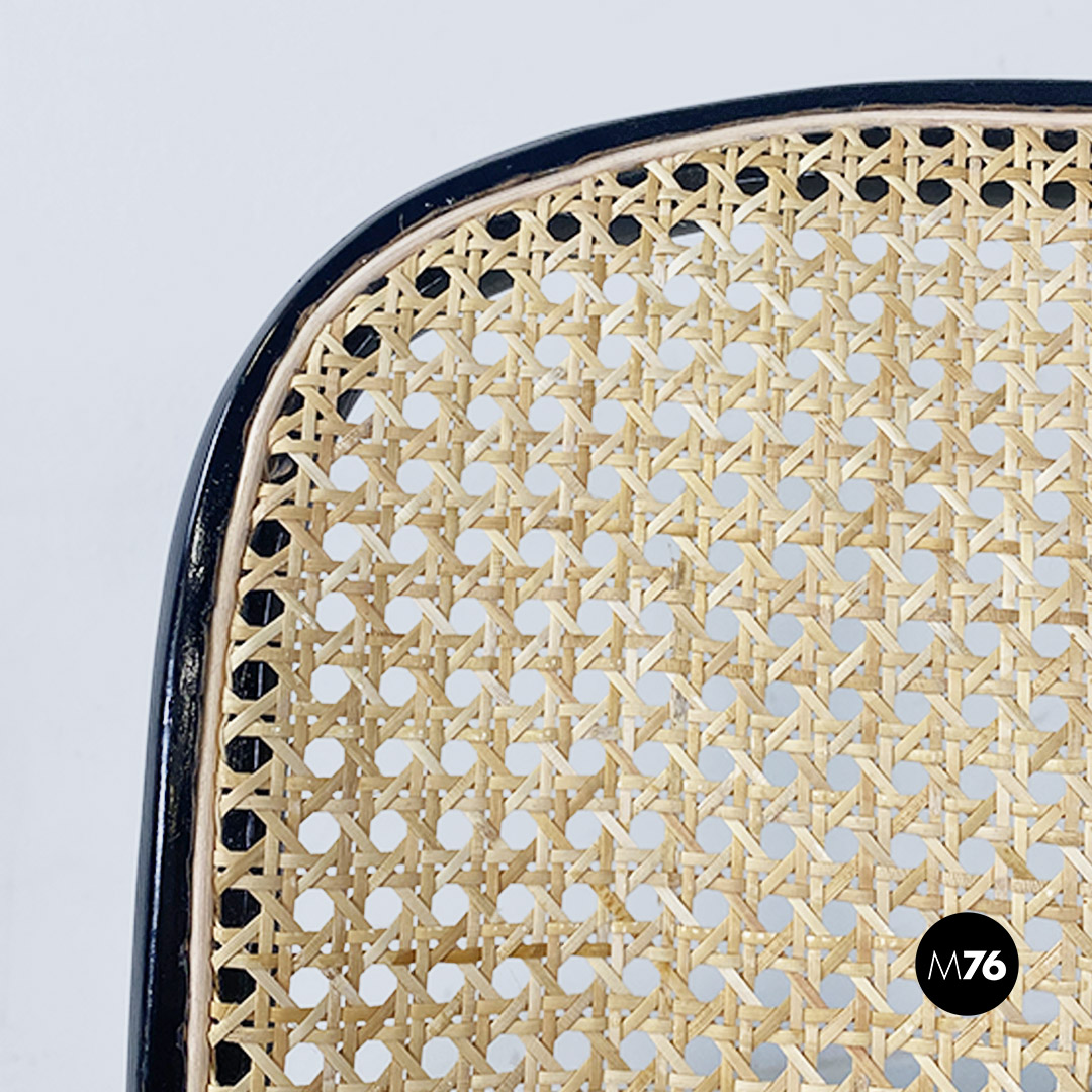 Set di otto sedie con seduta e schienale con angoli arrotondati in legno verniciato nero e in paglia di Vienna, zampe a sezione tonda sempre in legno verniciato nero.