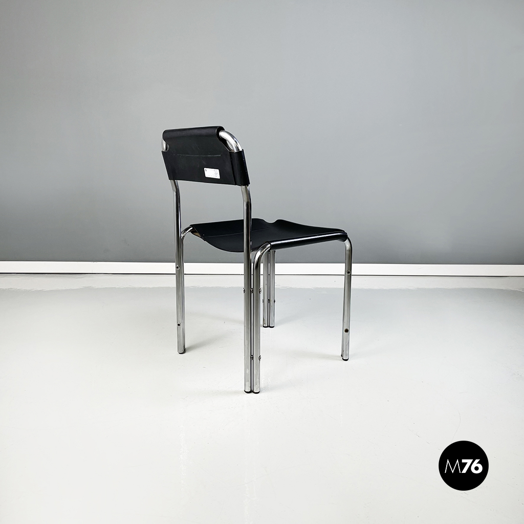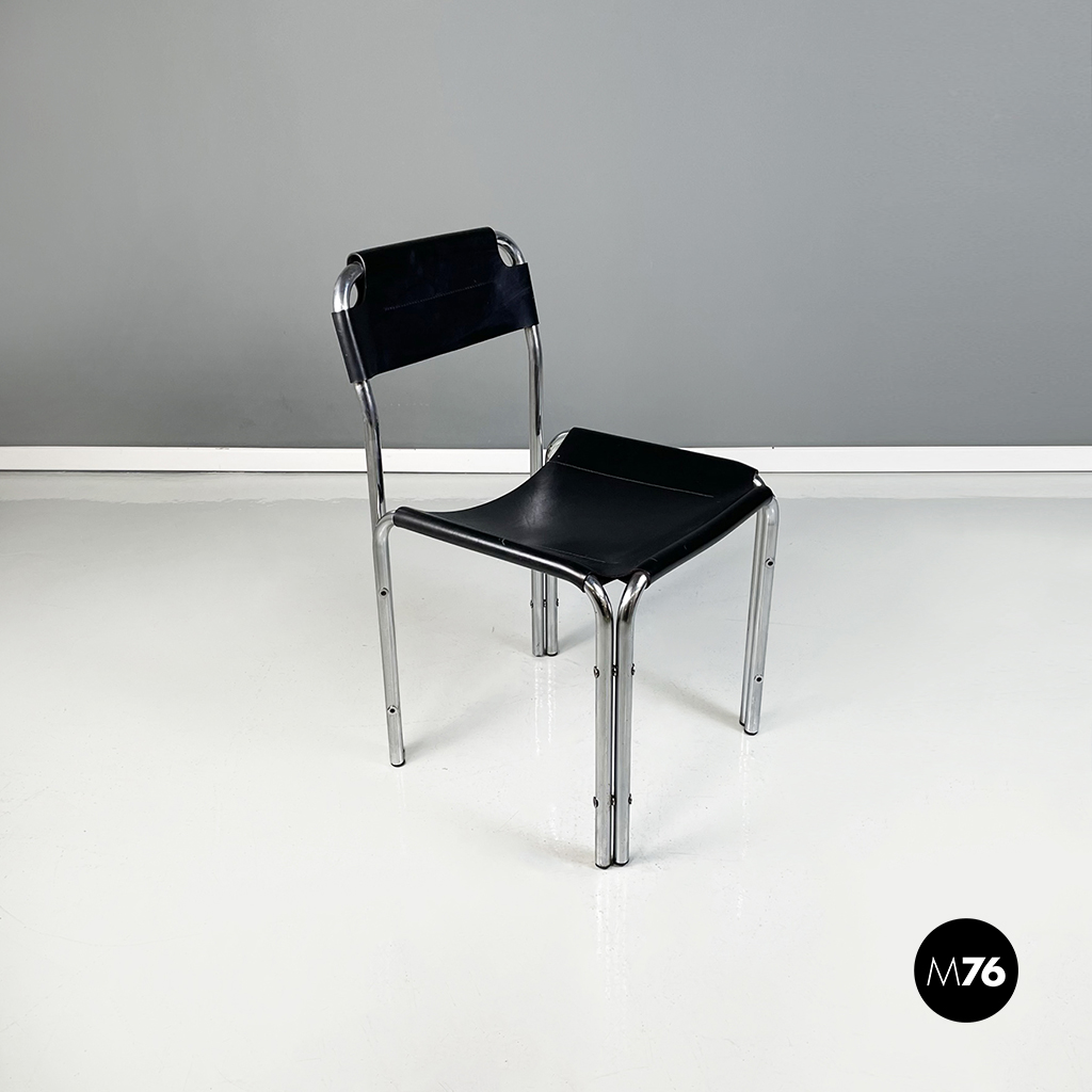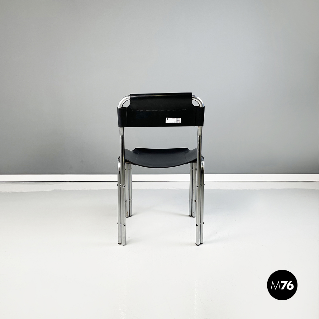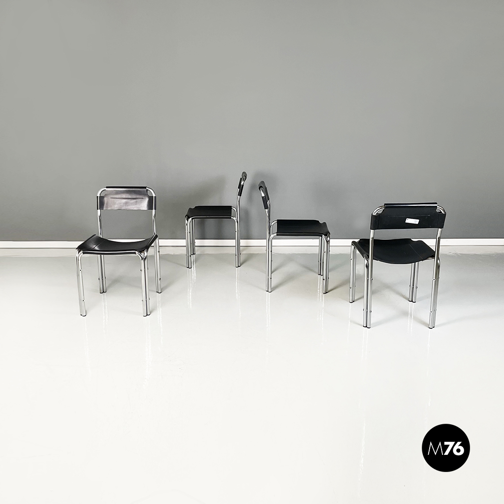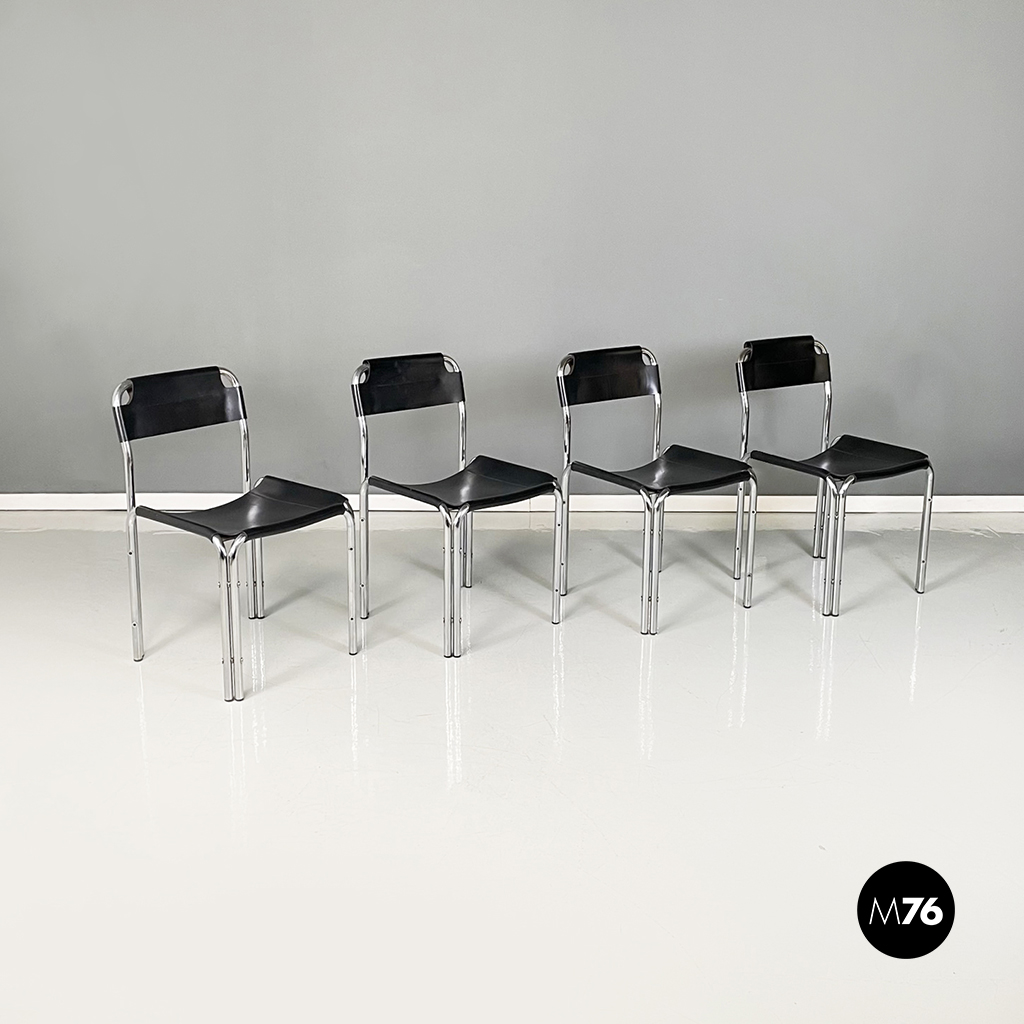 Set di quattro sedie con struttura in metallo tubolare. La seduta quadrata e lo schienale rettangolare in cuoio nero seguono la forma della struttura. Cuciture a vista.