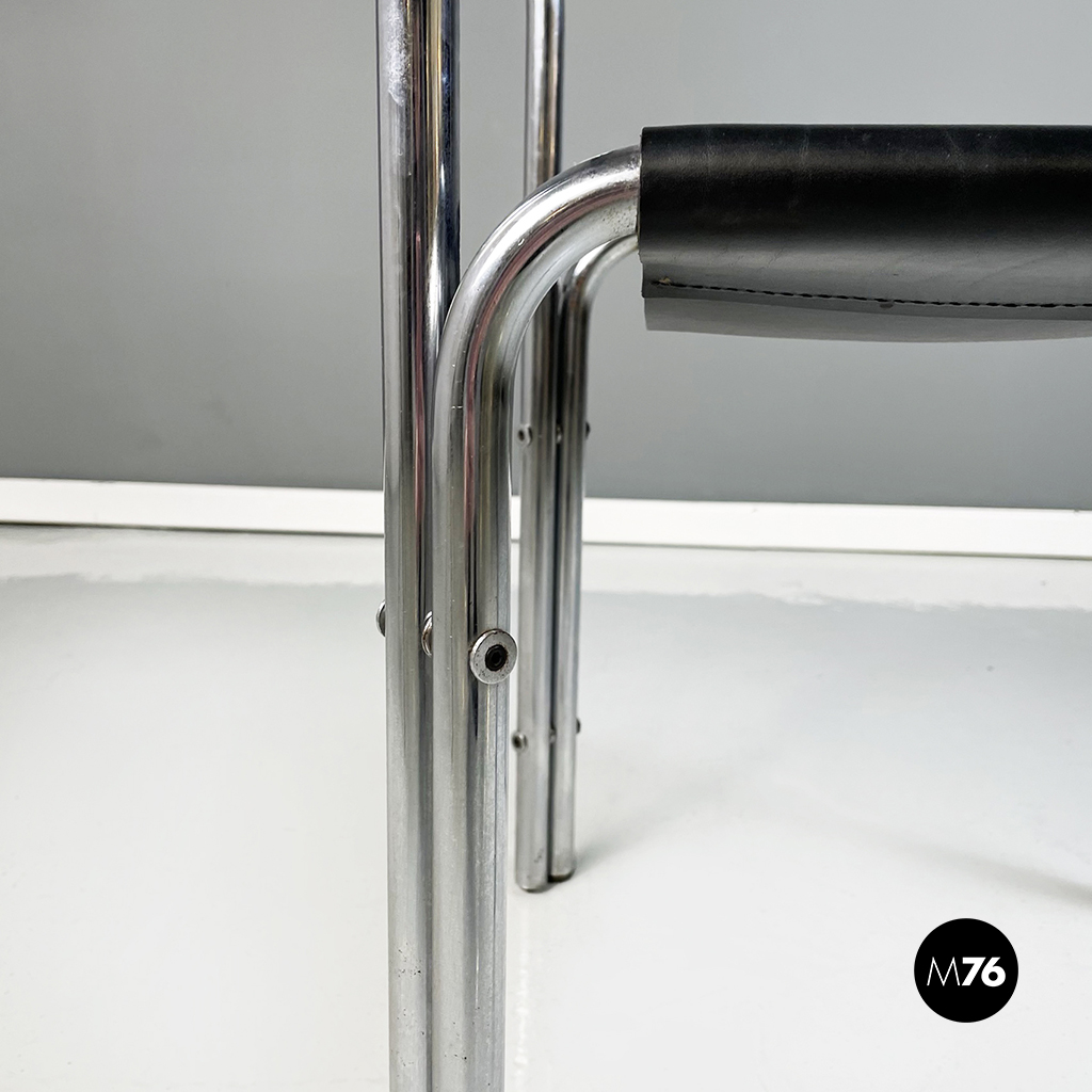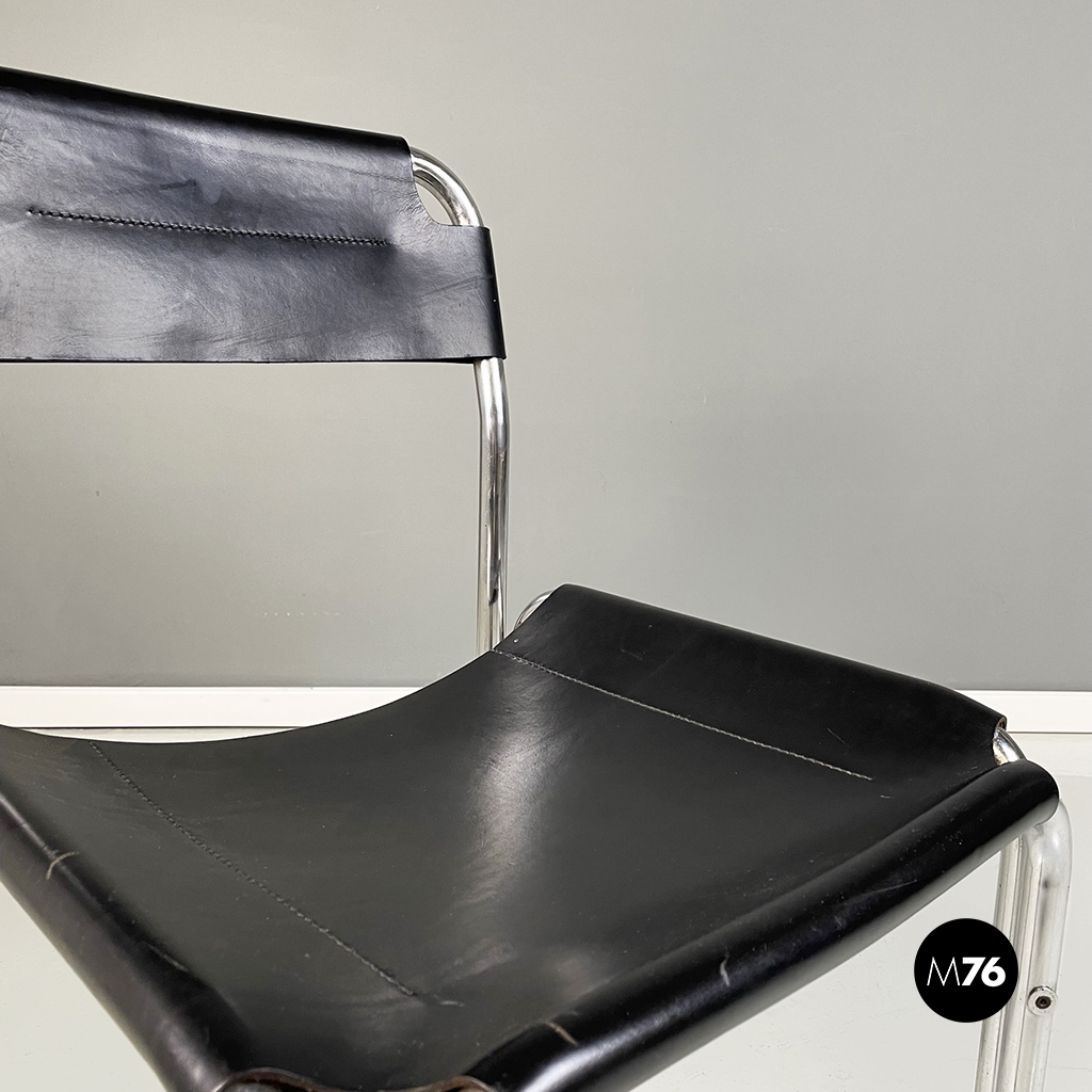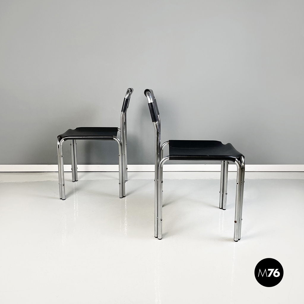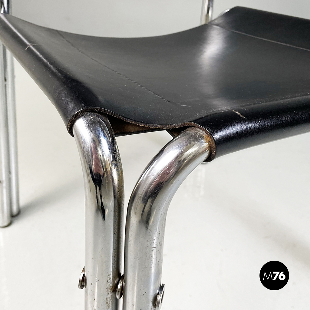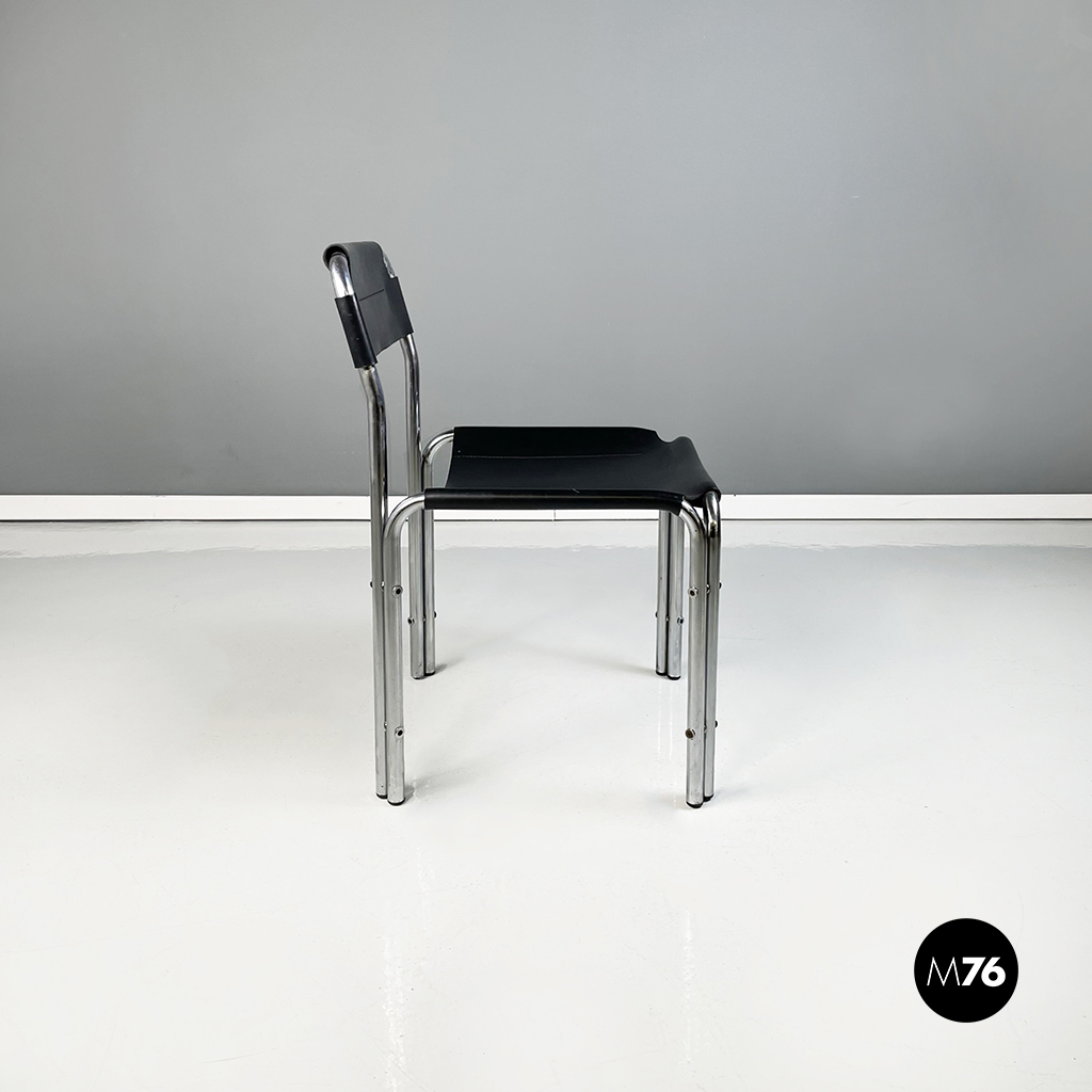 Set di quattro sedie con struttura in metallo tubolare. La seduta quadrata e lo schienale rettangolare in cuoio nero seguono la forma della struttura. Cuciture a vista.