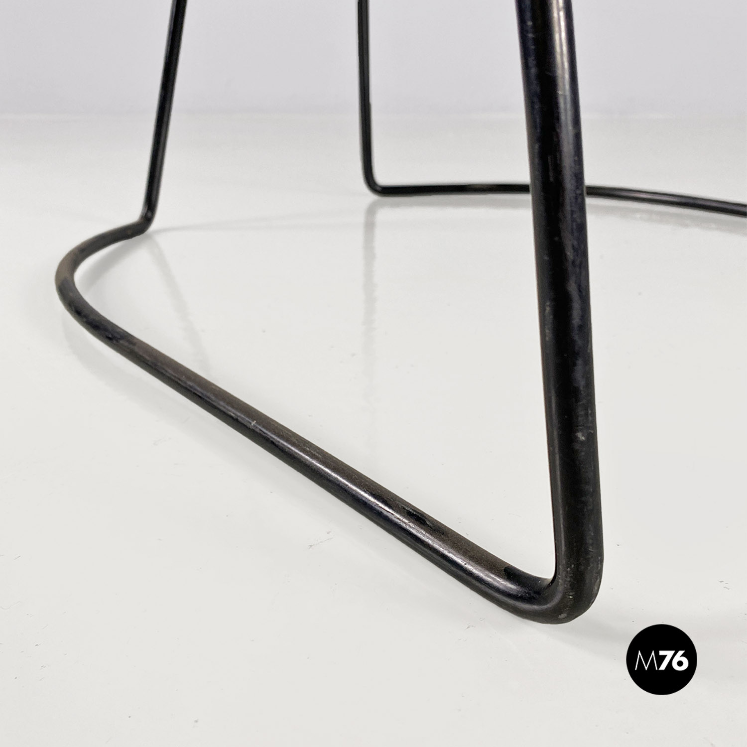 Set di quattro sedie con struttura in tondino di metallo verniciato nero e seduta e schienale in pelle nera originale.