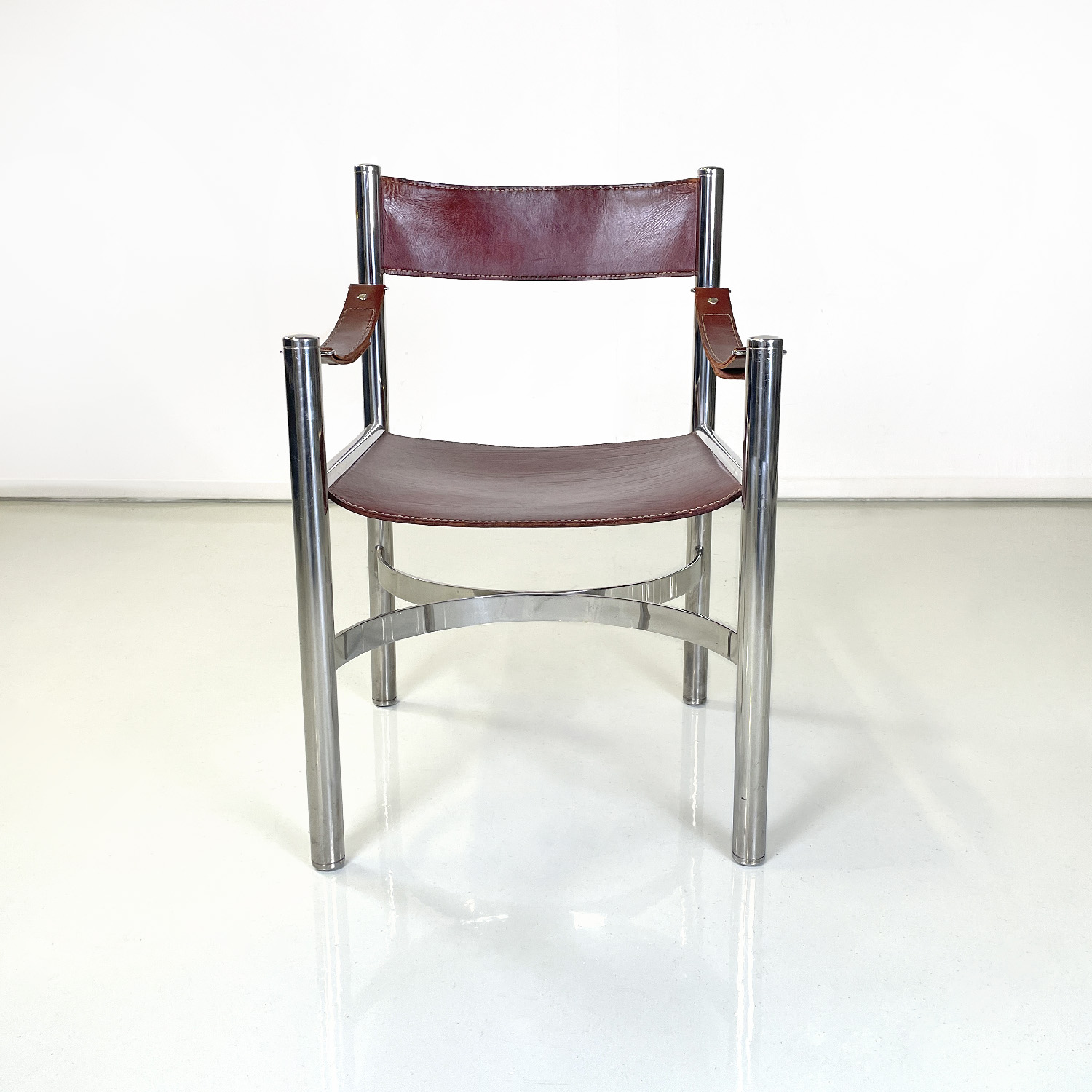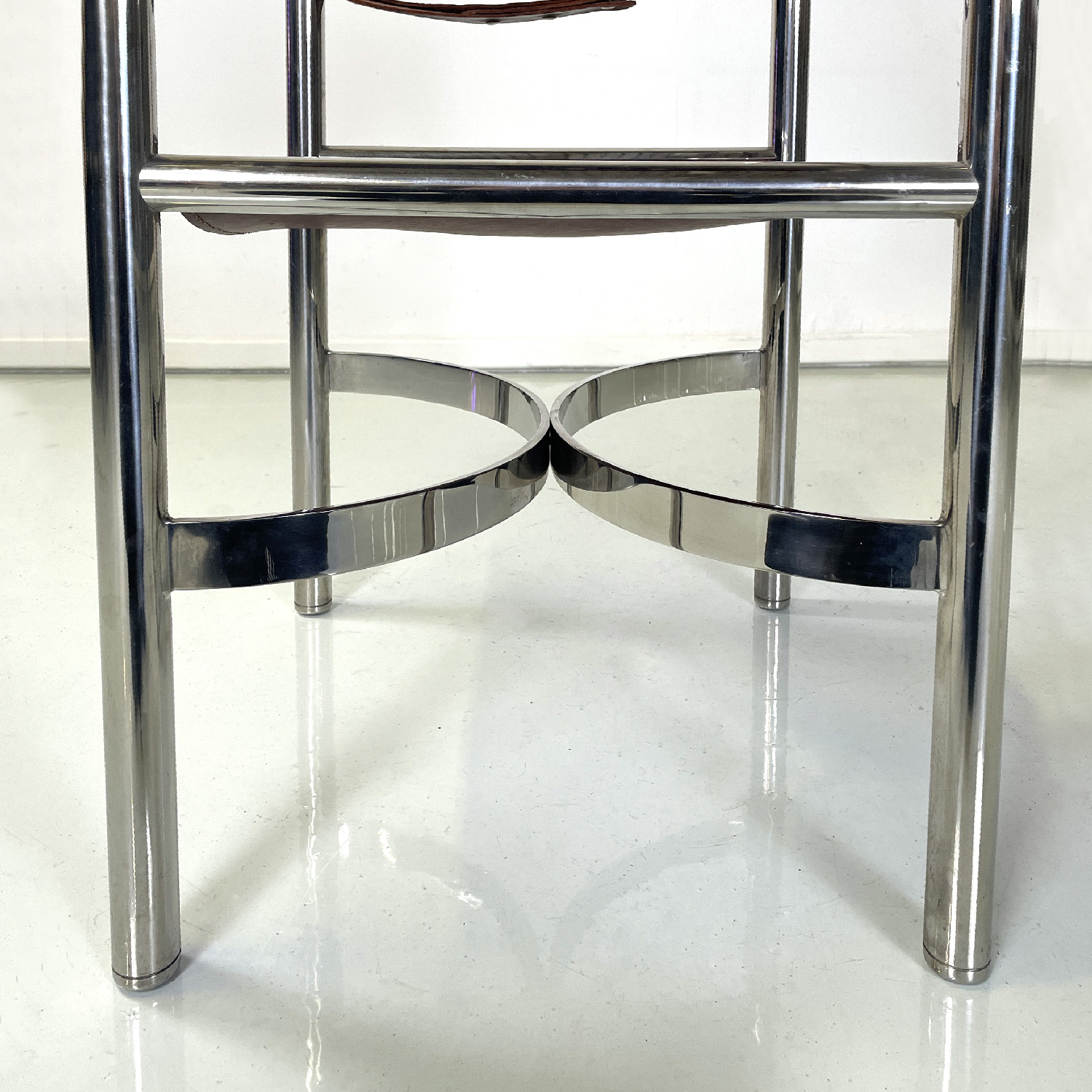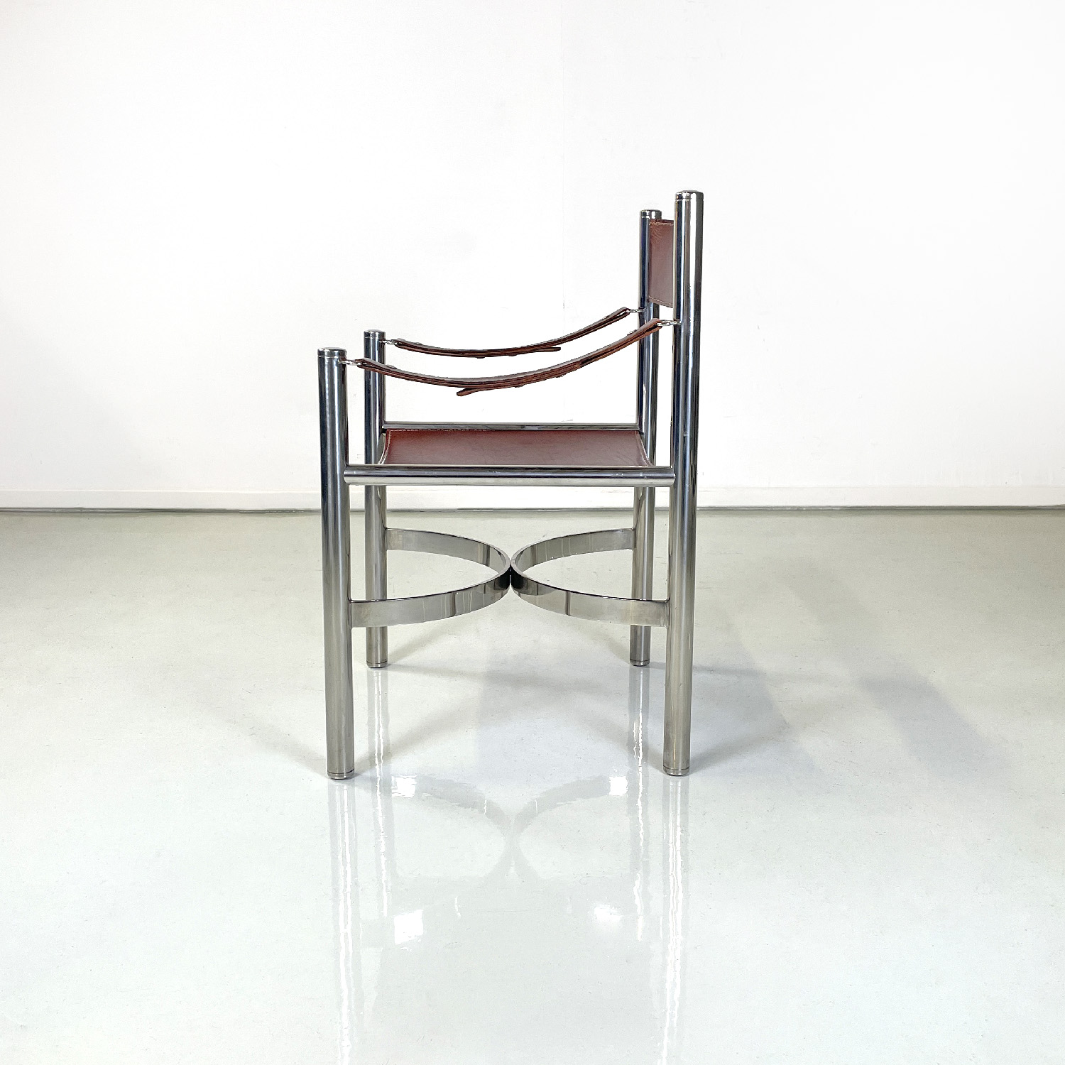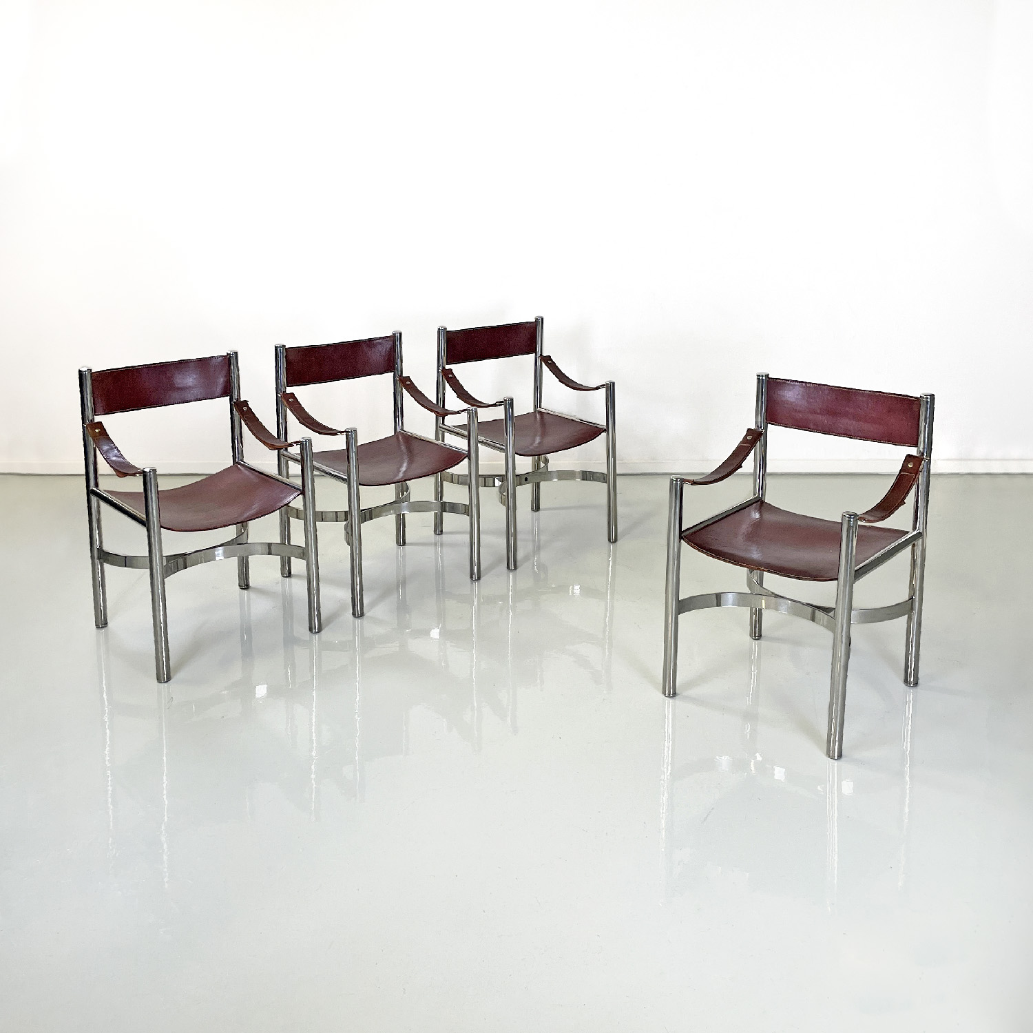 Set di quattro sedie a base rettangolare. La seduta e lo schienale sono in pelle marrone con cuciture bianche, i braccioli sono composti da una fascia della stessa pelle marrone e con le stesse cuciture. La struttura è in tubolare di acciaio cromato, le quattro gambe sono unite da due semicerchi di metallo a sezione rettangolare.