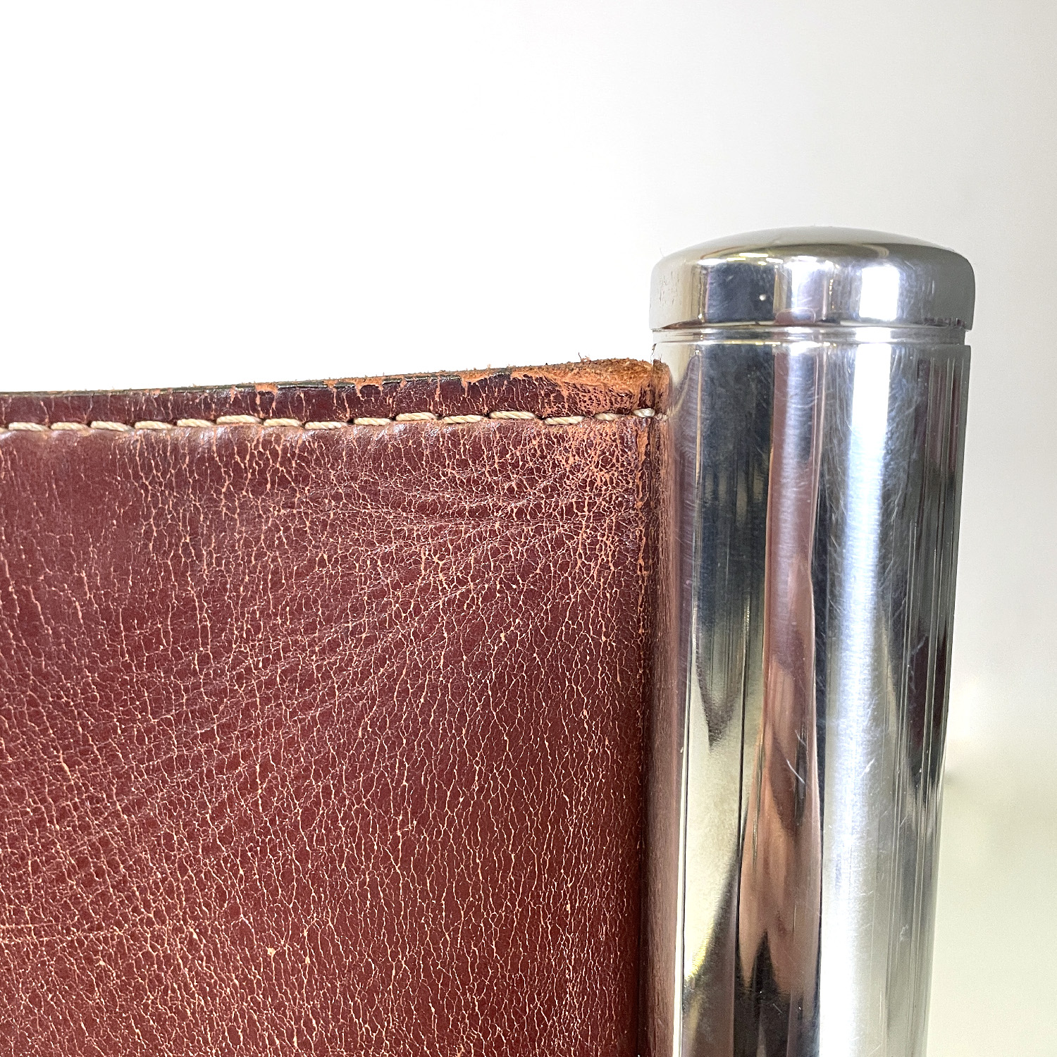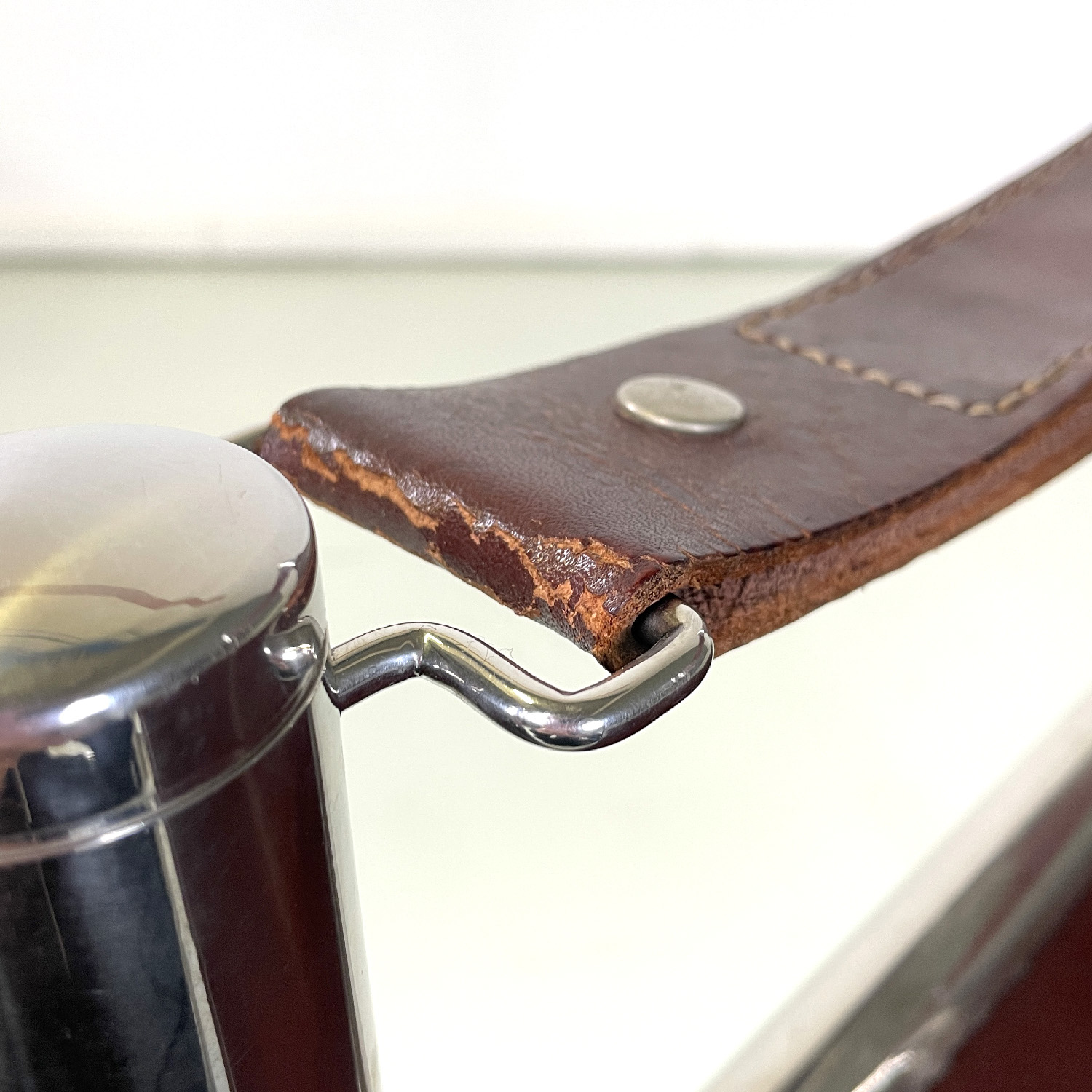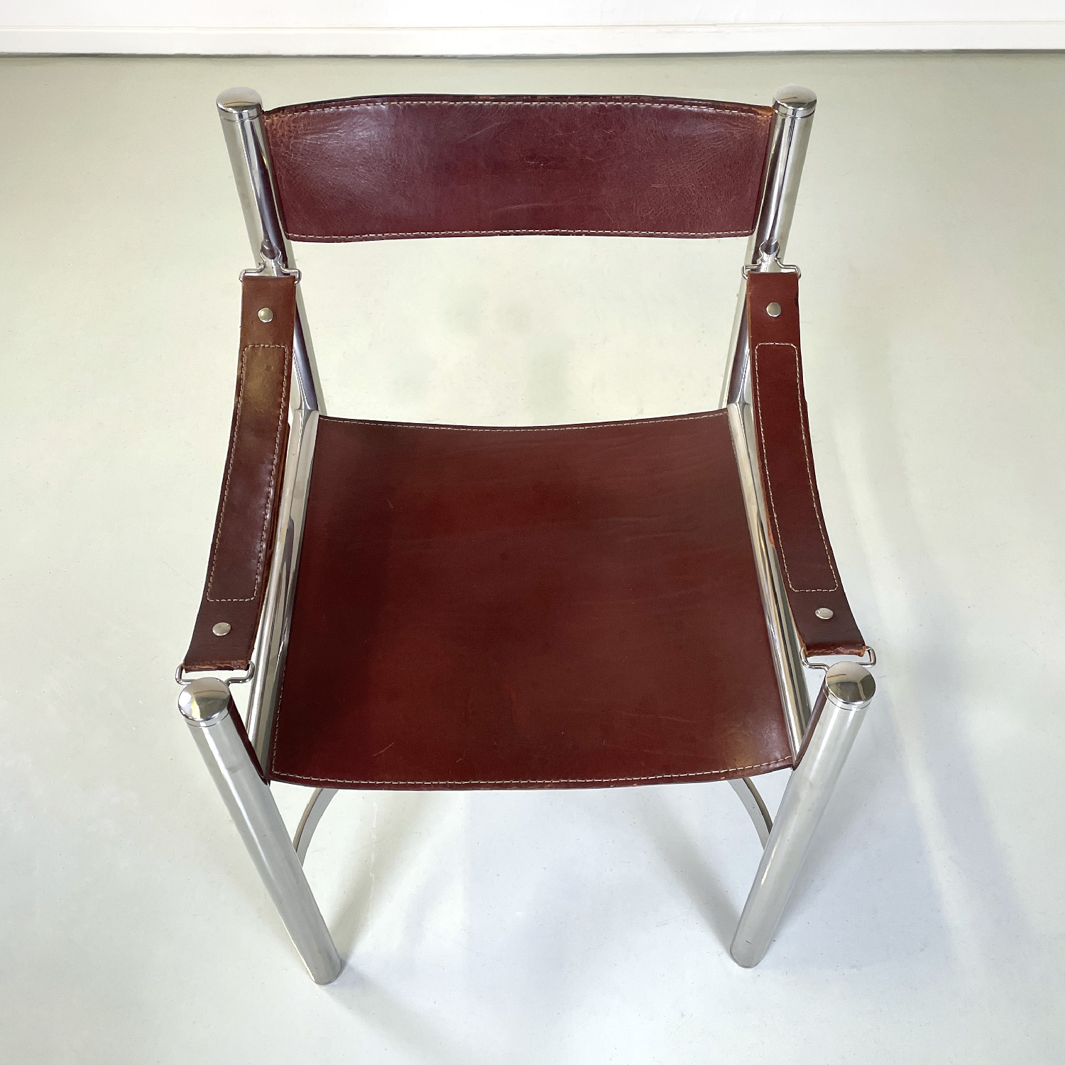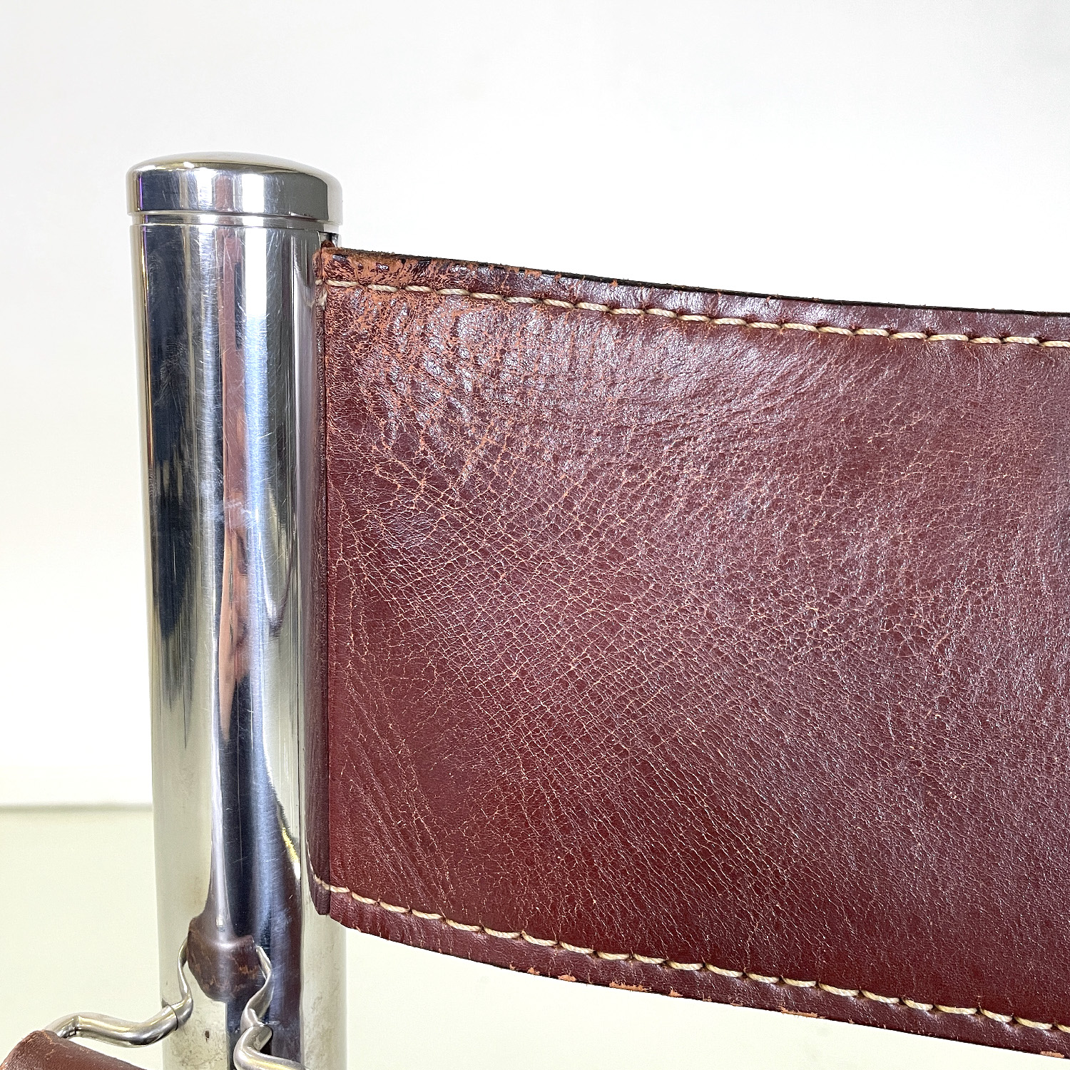 Set di quattro sedie a base rettangolare. La seduta e lo schienale sono in pelle marrone con cuciture bianche, i braccioli sono composti da una fascia della stessa pelle marrone e con le stesse cuciture. La struttura è in tubolare di acciaio cromato, le quattro gambe sono unite da due semicerchi di metallo a sezione rettangolare.