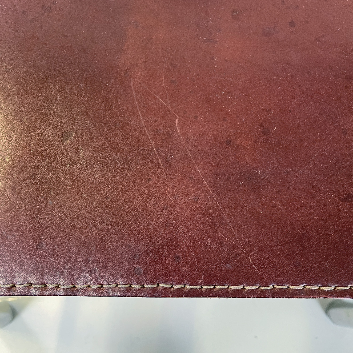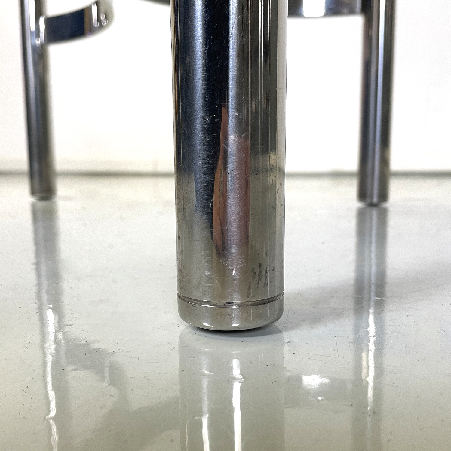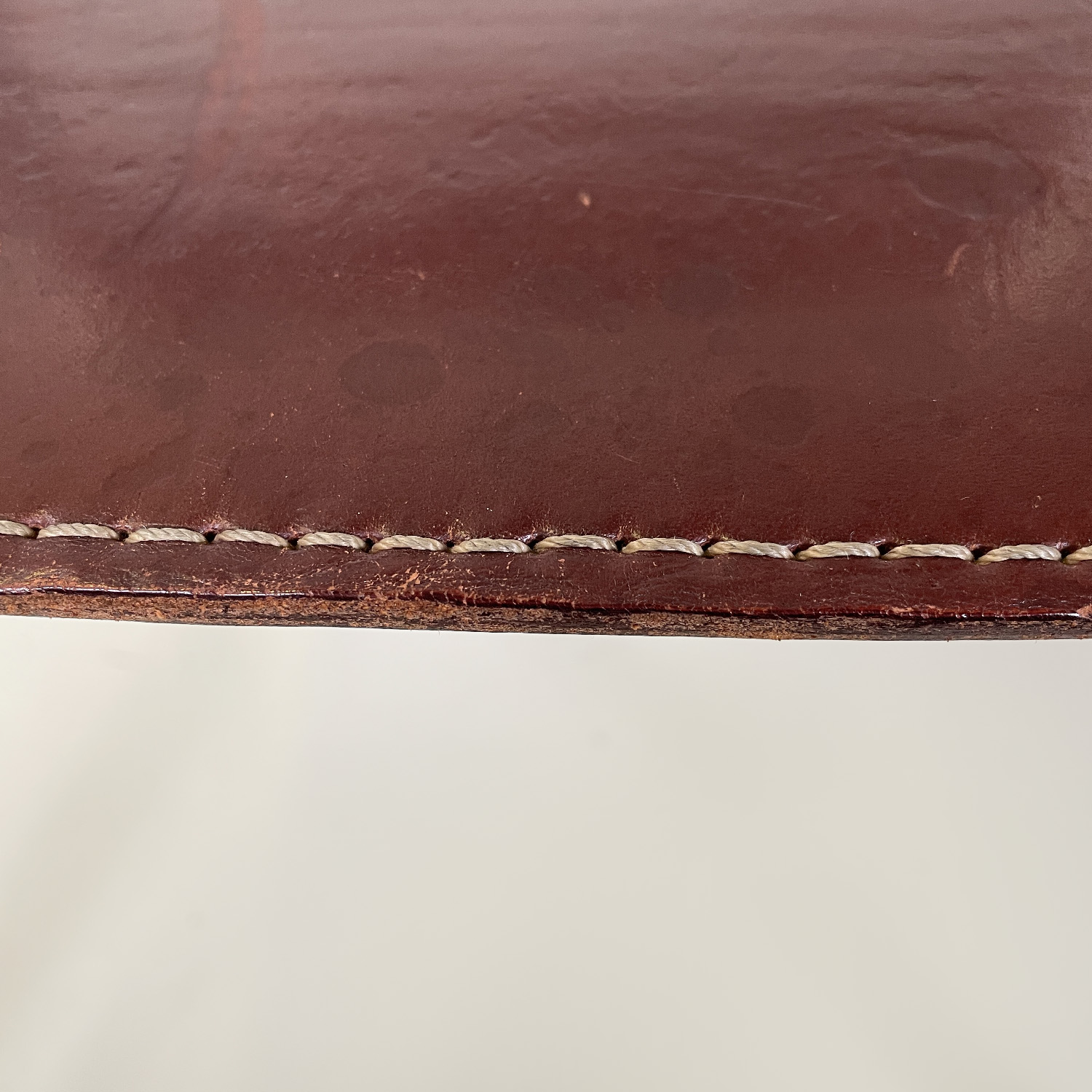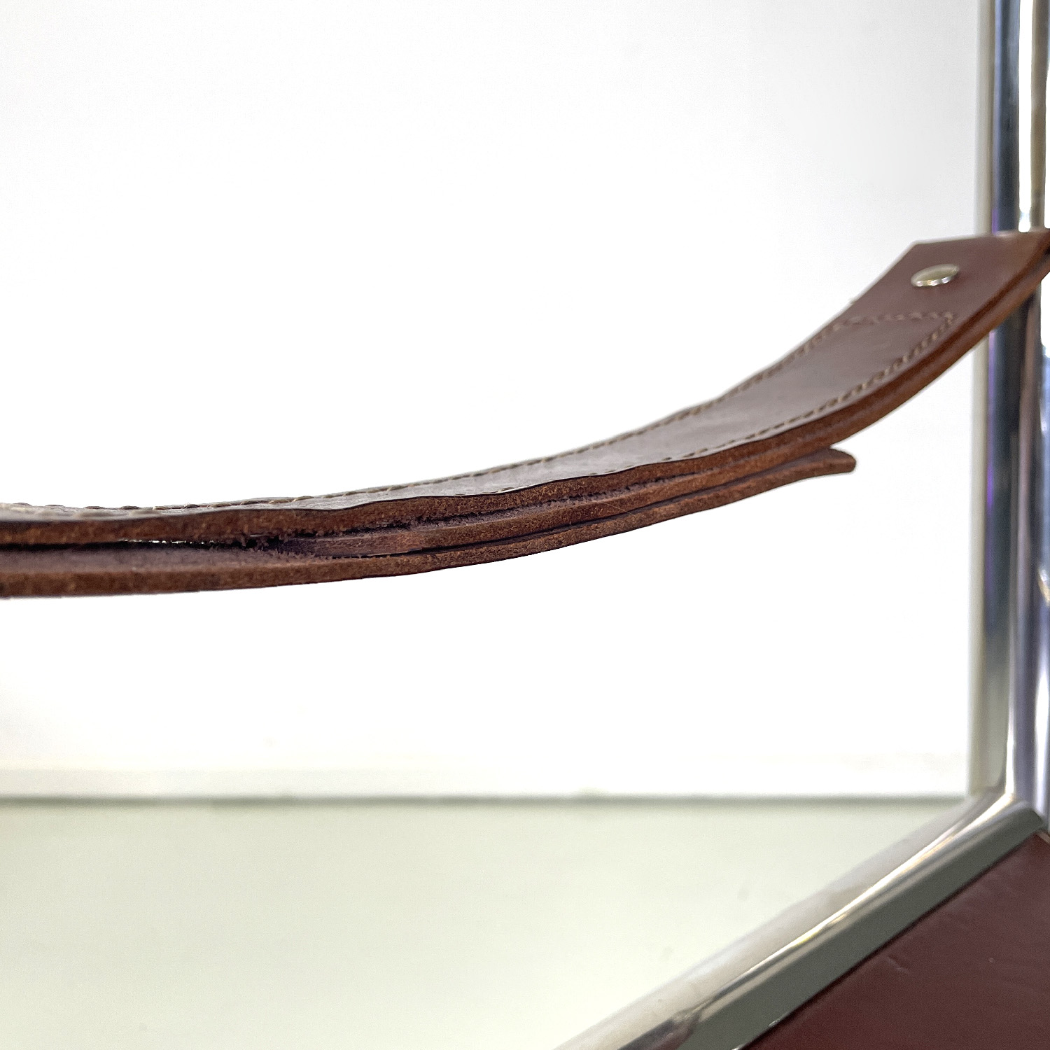 Set di quattro sedie a base rettangolare. La seduta e lo schienale sono in pelle marrone con cuciture bianche, i braccioli sono composti da una fascia della stessa pelle marrone e con le stesse cuciture. La struttura è in tubolare di acciaio cromato, le quattro gambe sono unite da due semicerchi di metallo a sezione rettangolare.