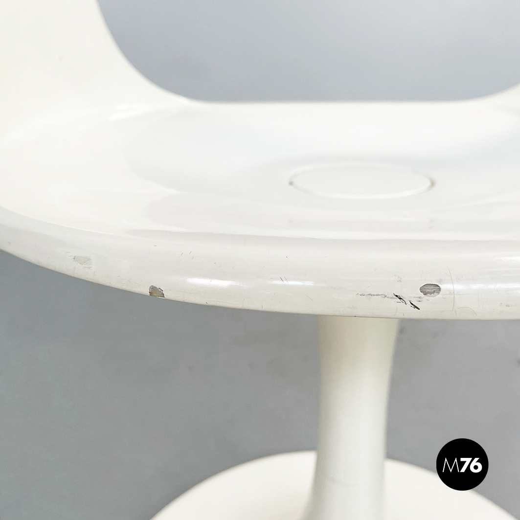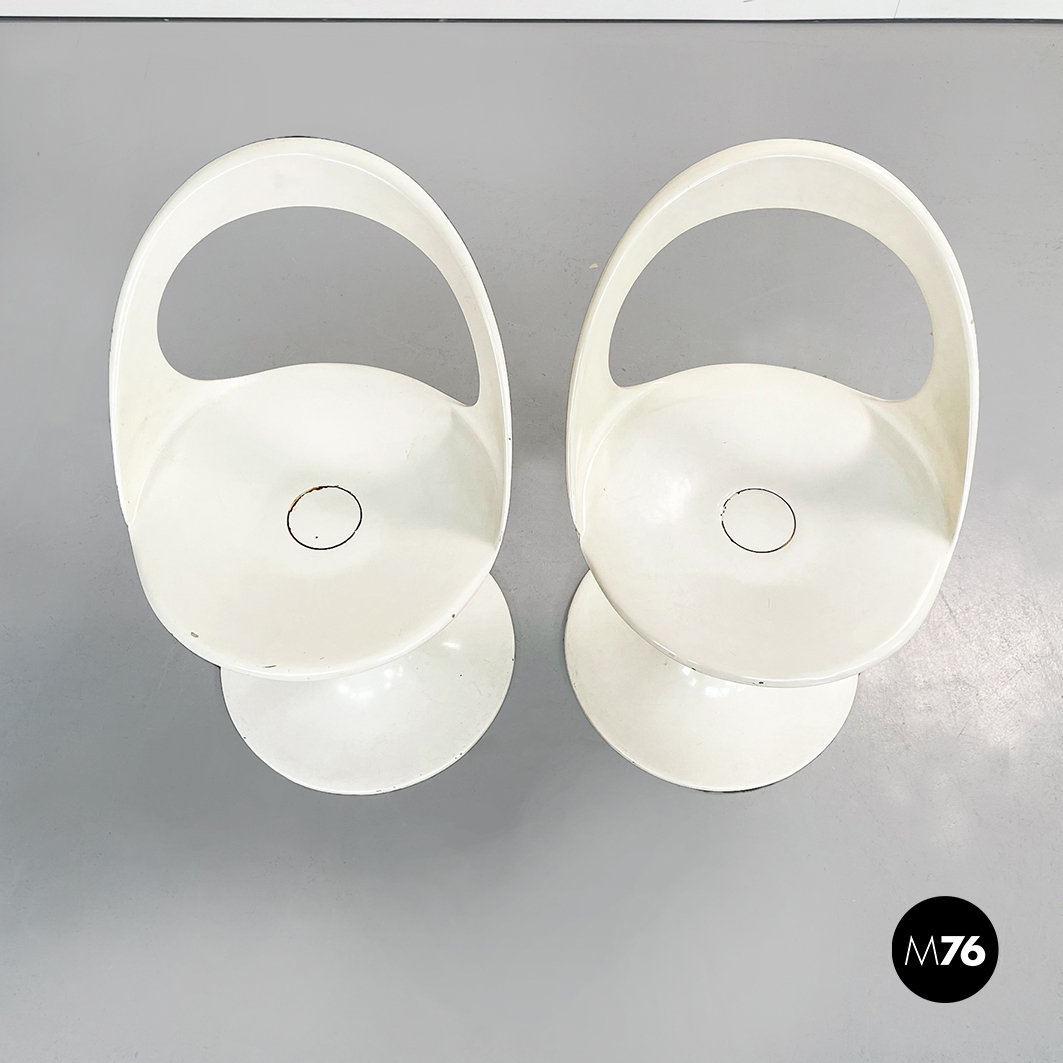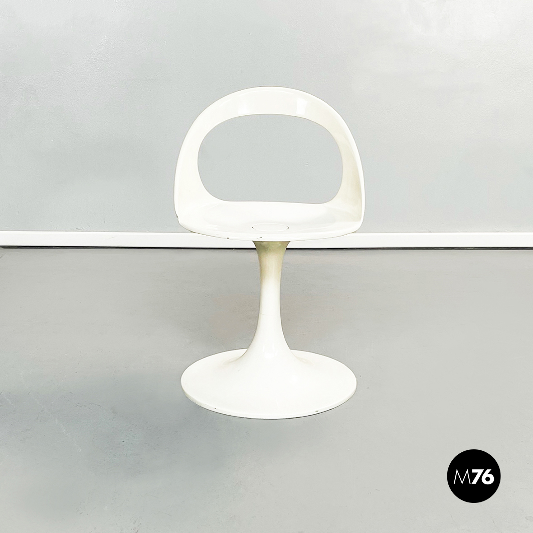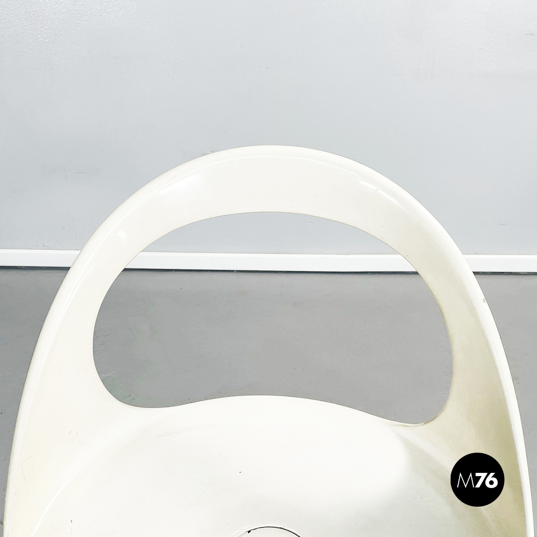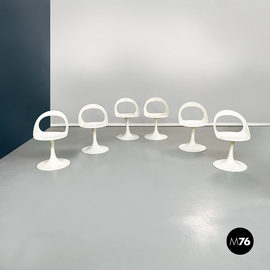 Set di sei sedie con seduta tonda, interamente in plastica bianca. La seduta tonda si unisce allo schienale, il quale è composto da un semi-ovale ricurvo e cavo. La base è tonda.