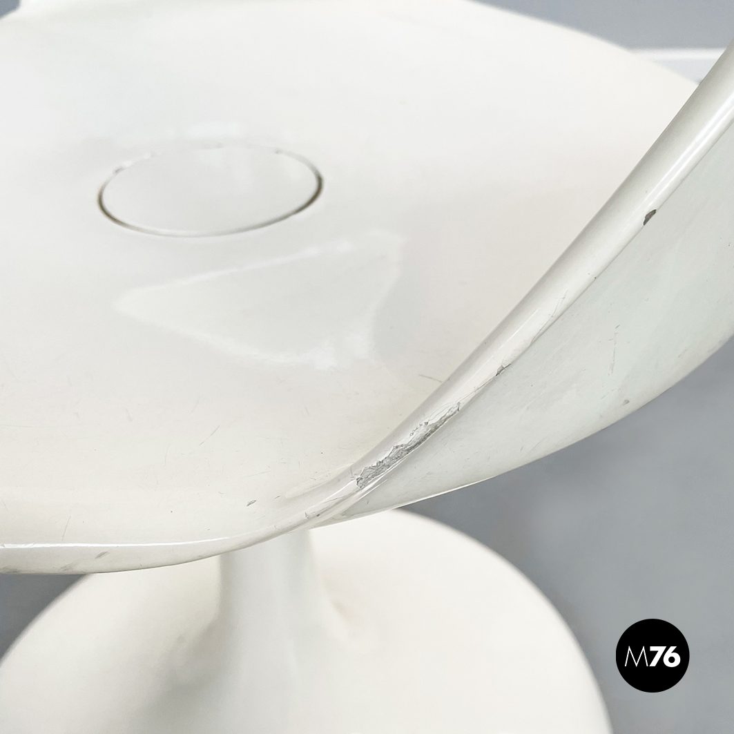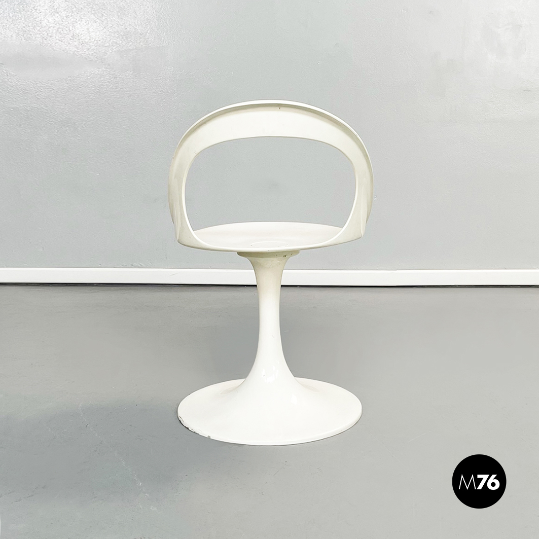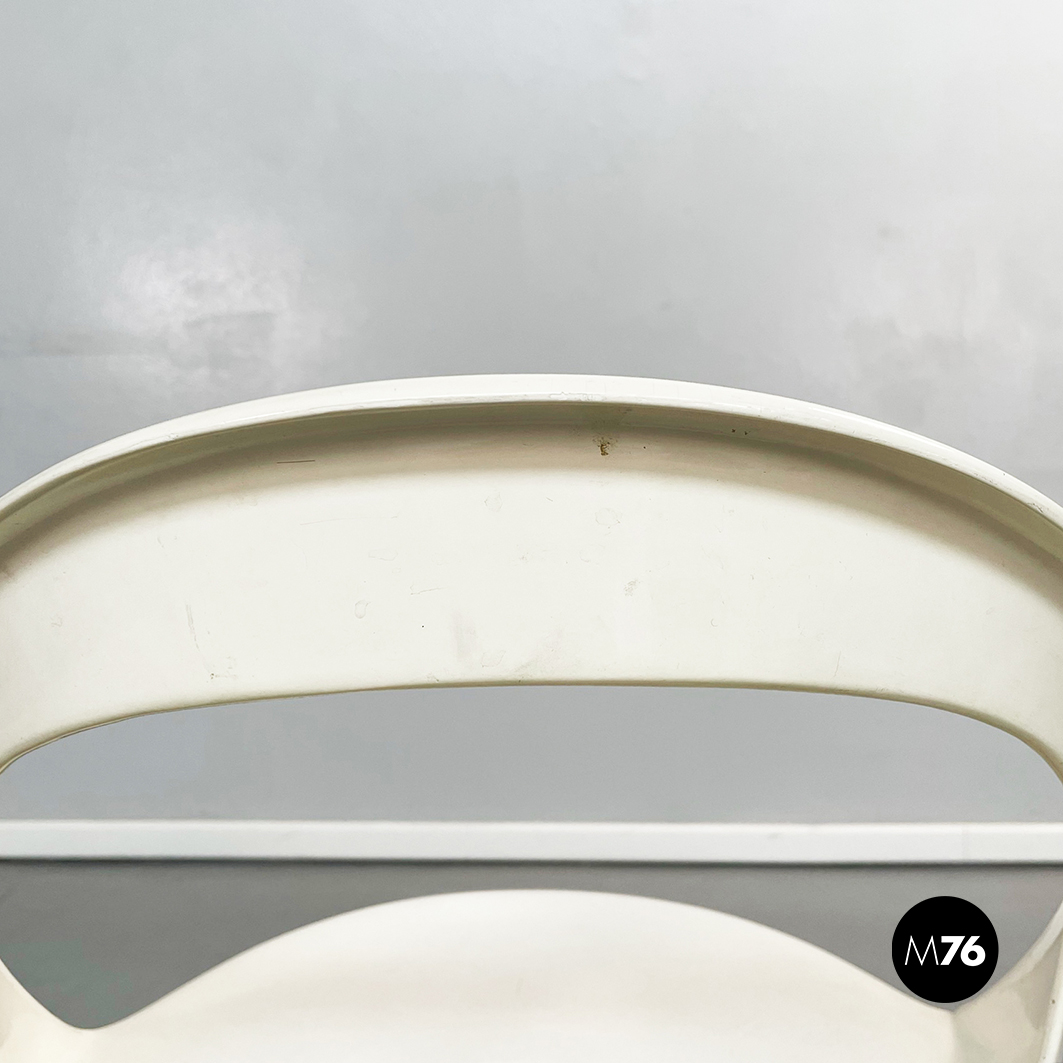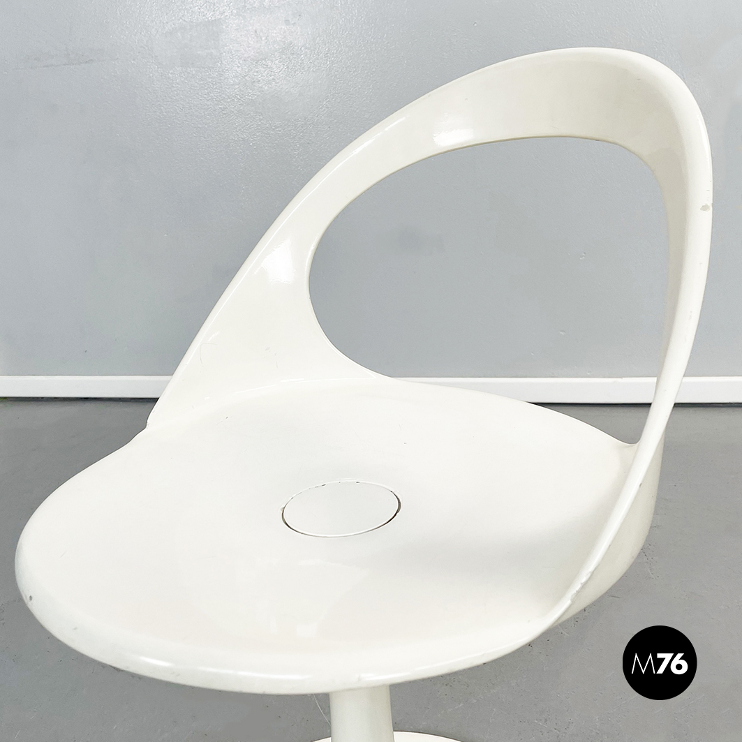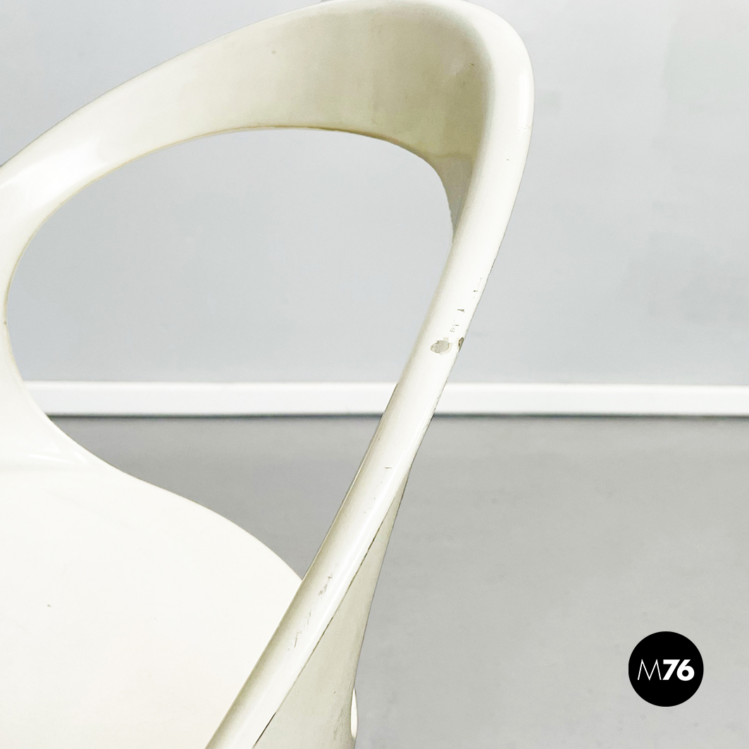 Set di sei sedie con seduta tonda, interamente in plastica bianca. La seduta tonda si unisce allo schienale, il quale è composto da un semi-ovale ricurvo e cavo. La base è tonda.