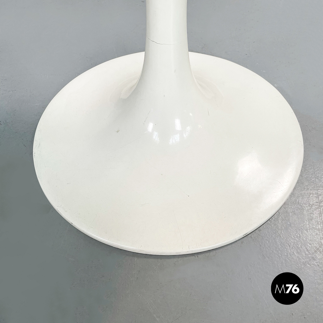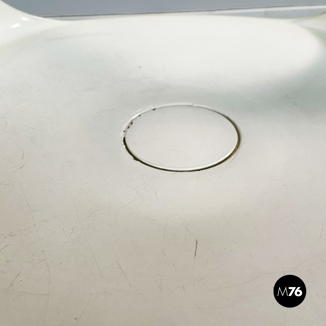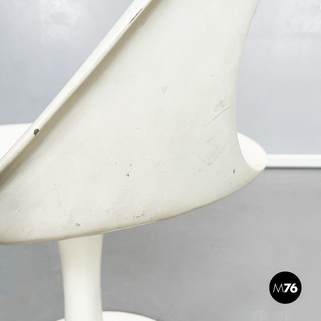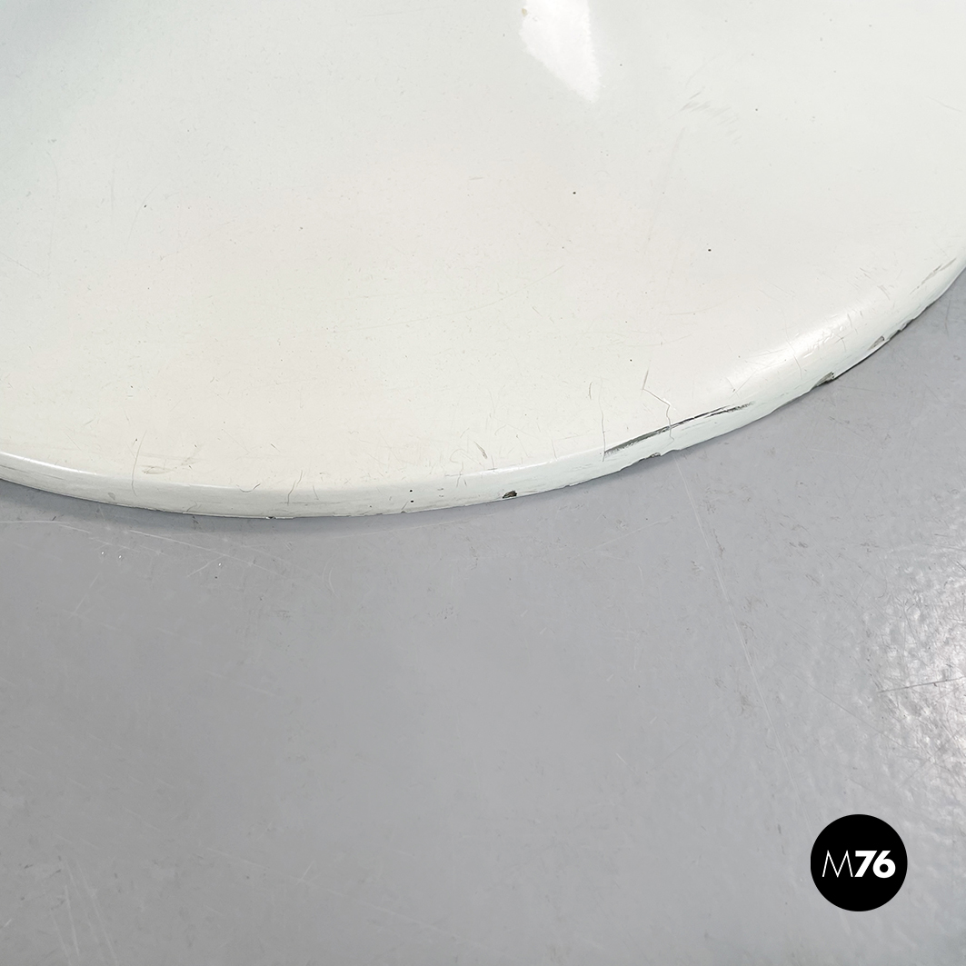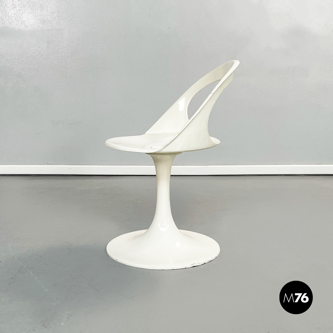 Set di sei sedie con seduta tonda, interamente in plastica bianca. La seduta tonda si unisce allo schienale, il quale è composto da un semi-ovale ricurvo e cavo. La base è tonda.