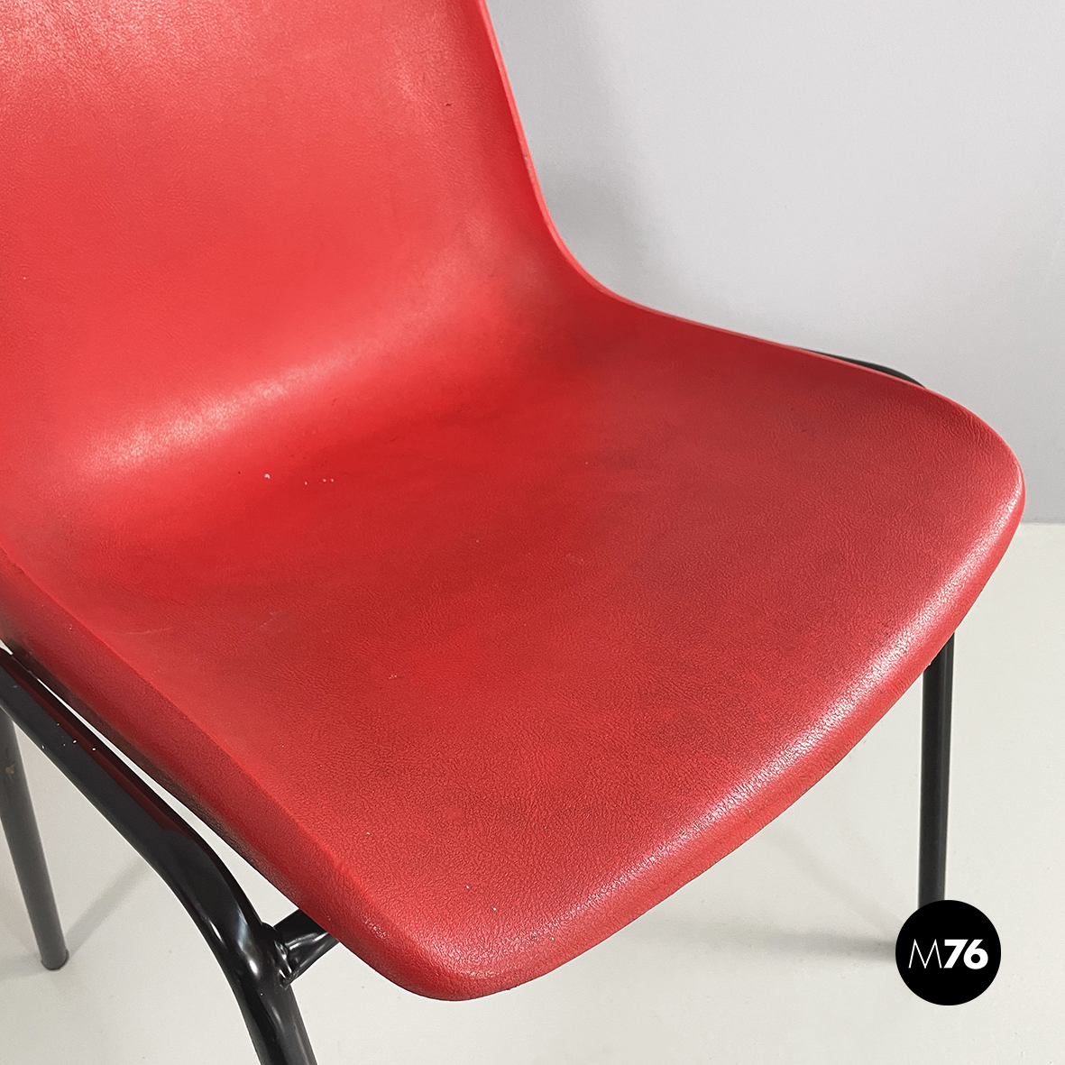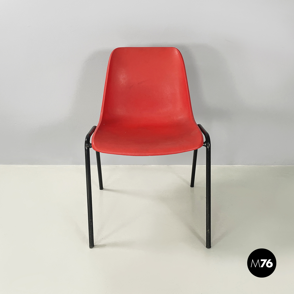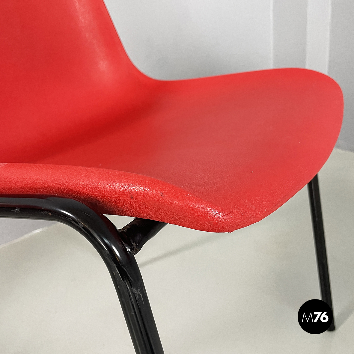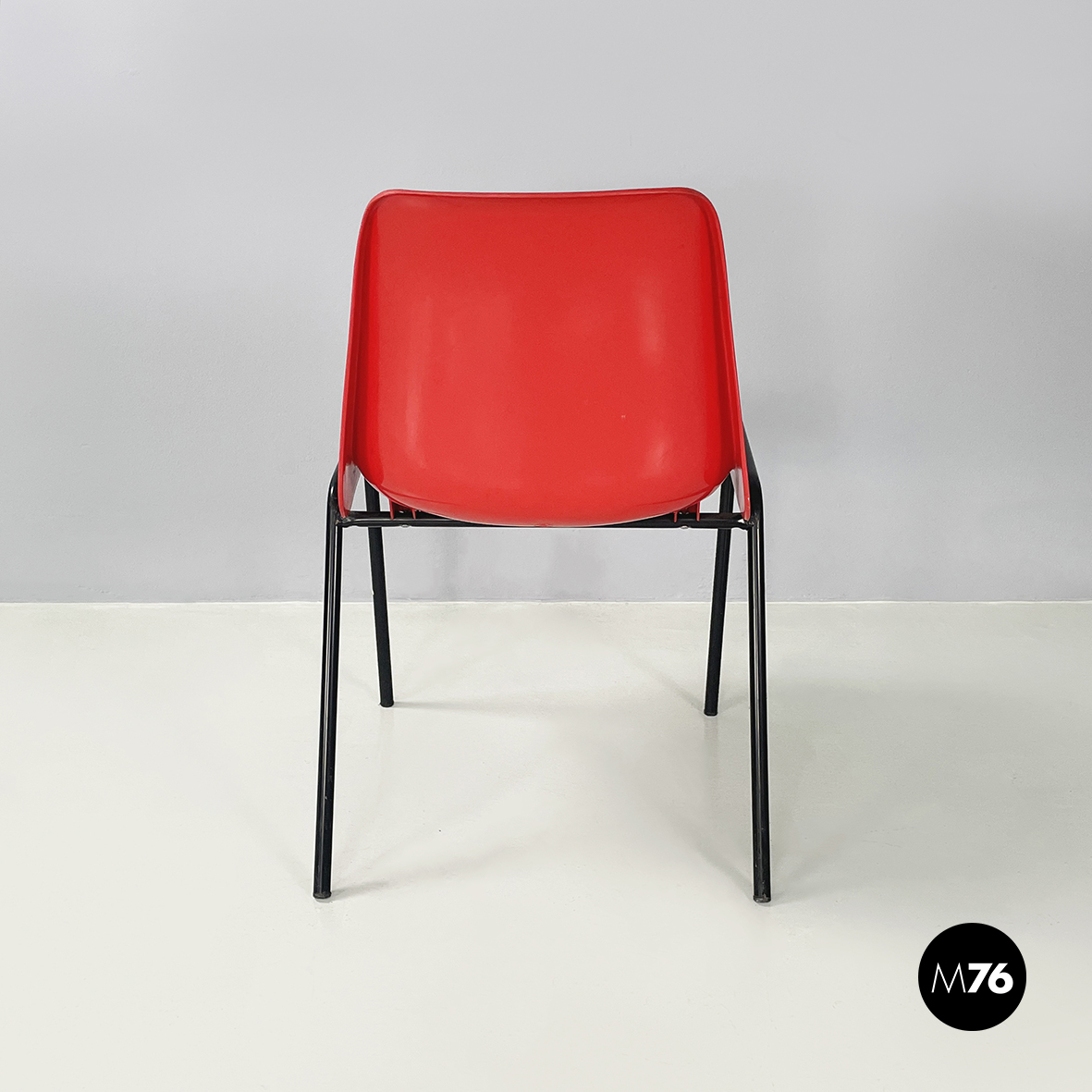 Set di cinque sedie con monoscocca curvata in plastica rossa. Le zampe sono in tondino di metallo verniciato nero. Impilabili.
