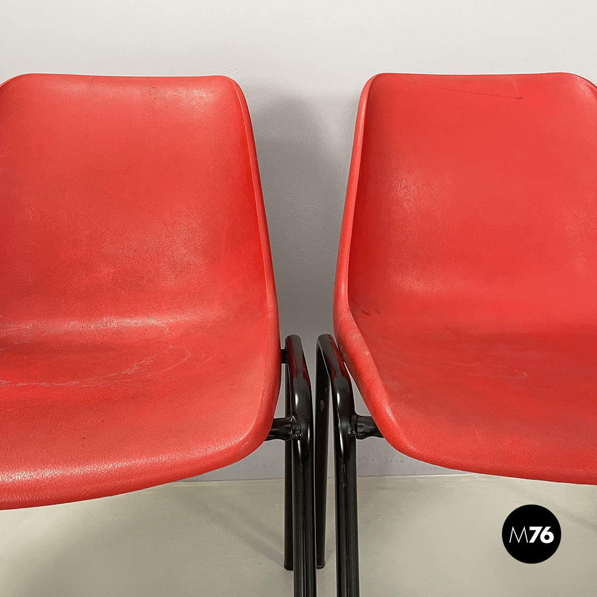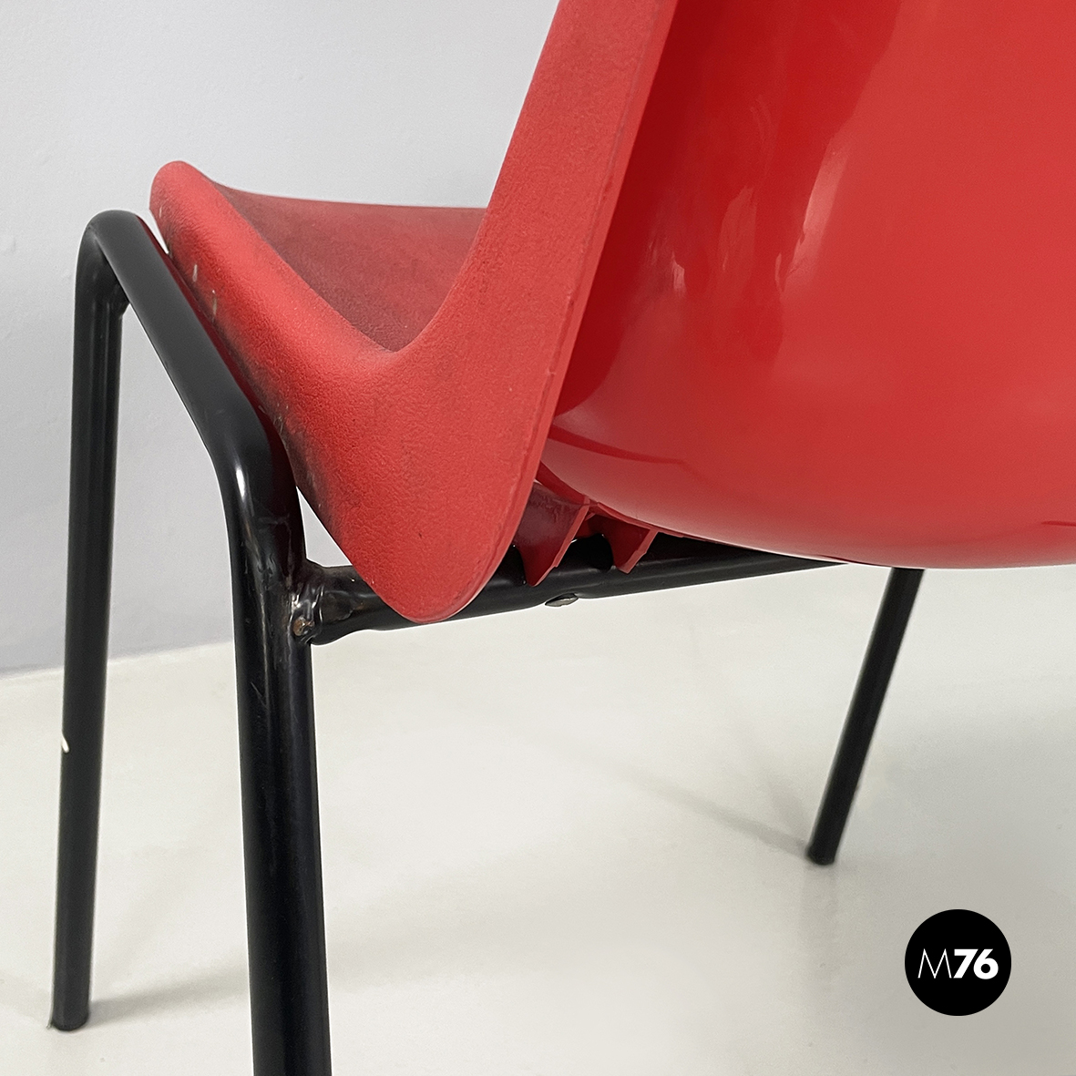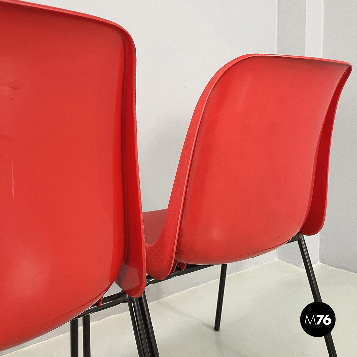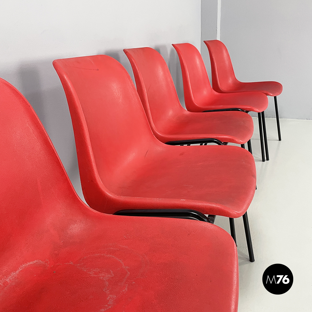 Set di cinque sedie con monoscocca curvata in plastica rossa. Le zampe sono in tondino di metallo verniciato nero. Impilabili.