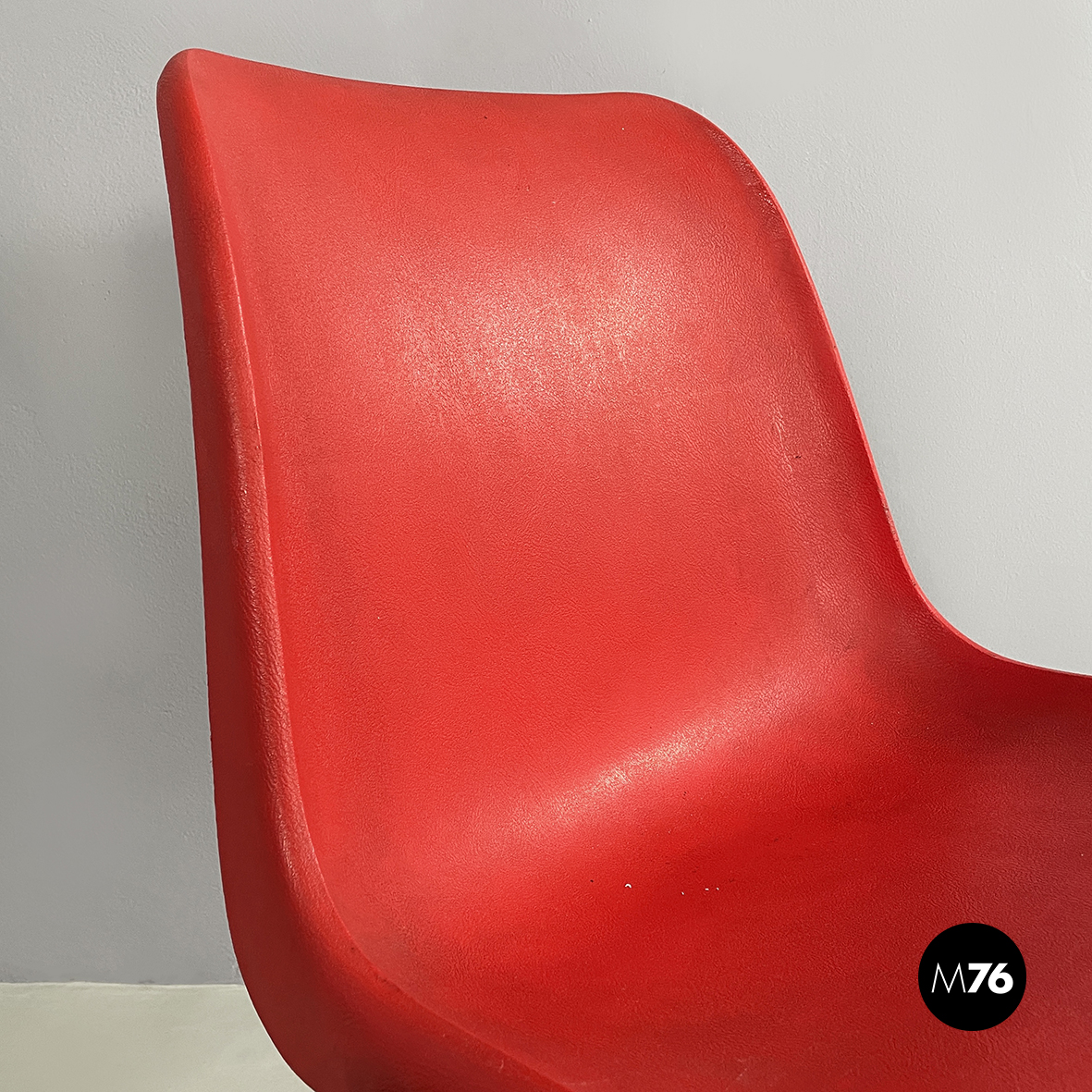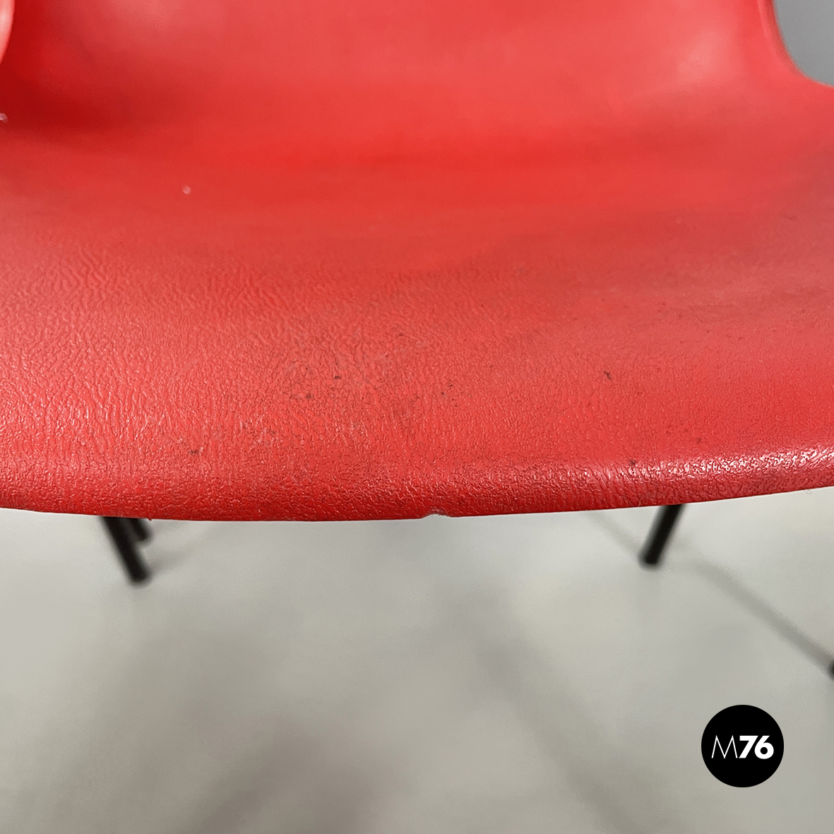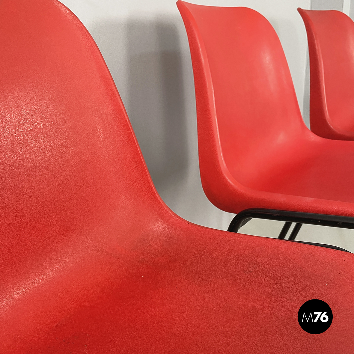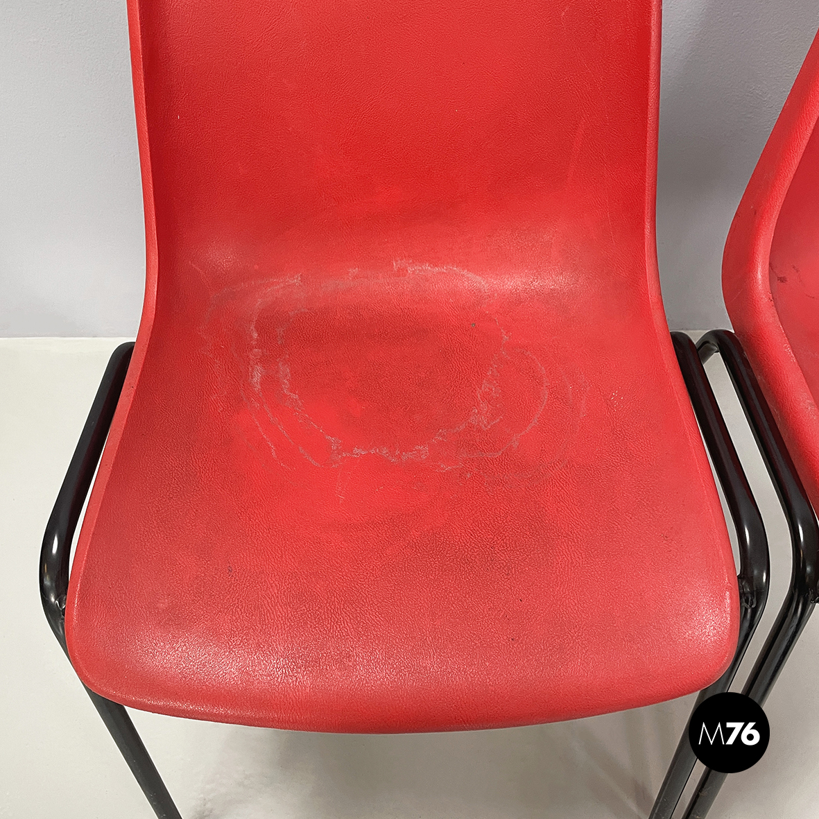 Set di cinque sedie con monoscocca curvata in plastica rossa. Le zampe sono in tondino di metallo verniciato nero. Impilabili.