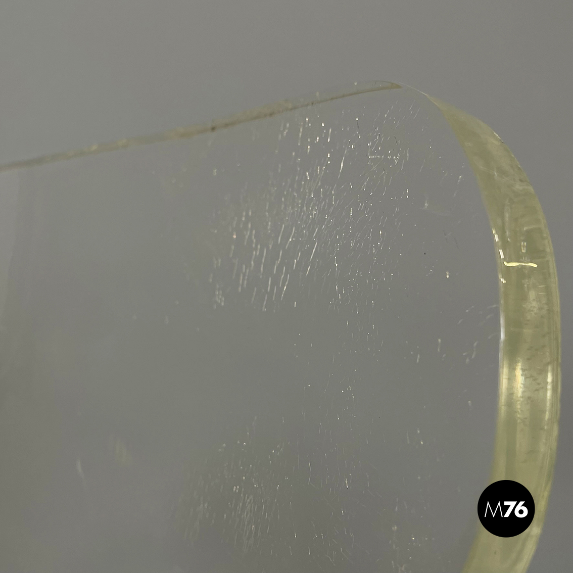 Buone condizioni. La struttura presenta segni del tempo, questi sono visibili in controluce dato che il materiale è trasparente. Plexiglass leggermente ingiallito, seduta rifatta. Condizioni strutturali buone.