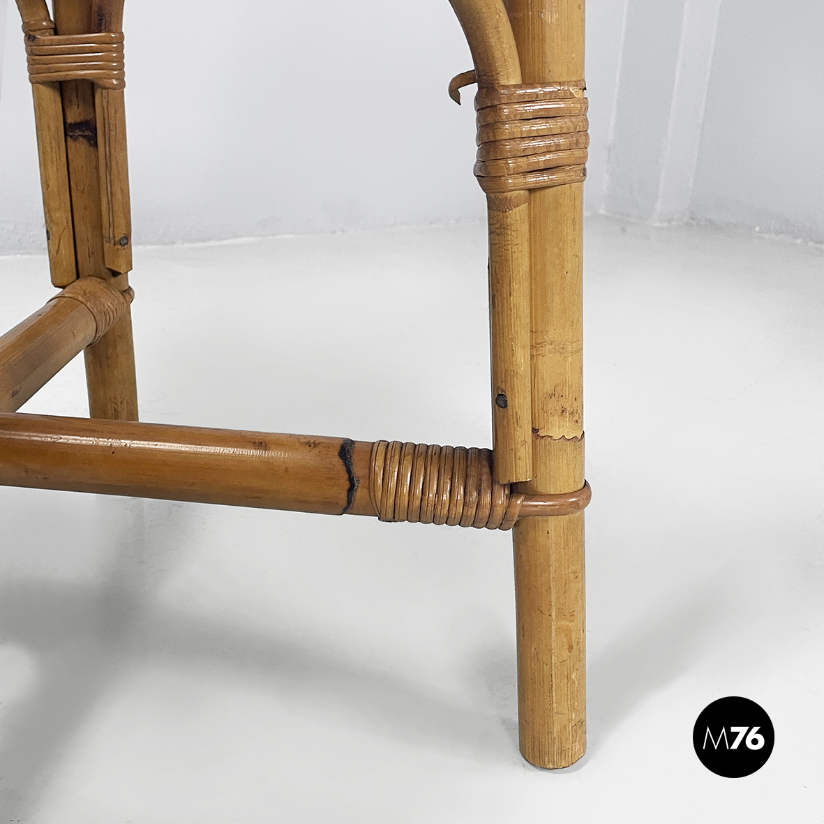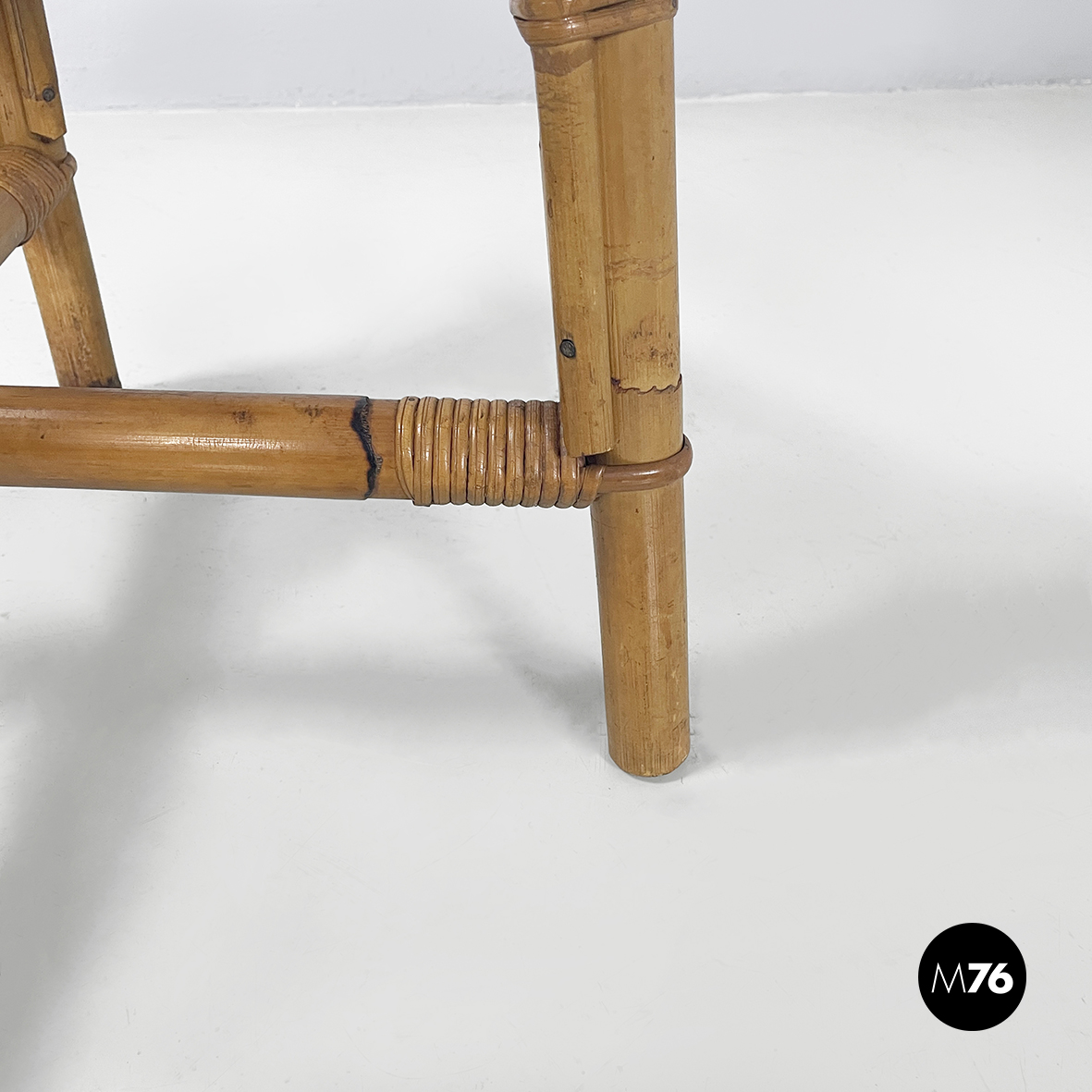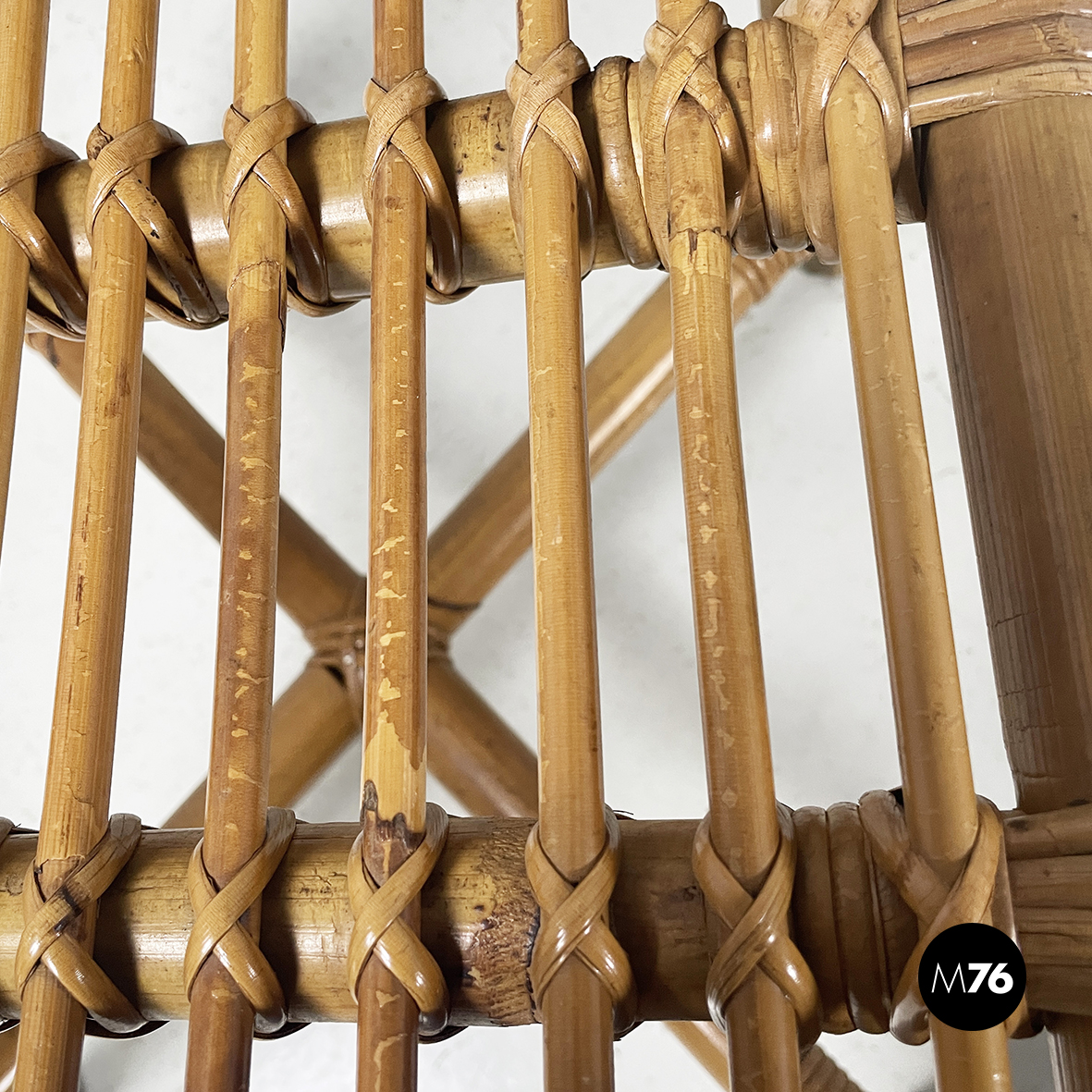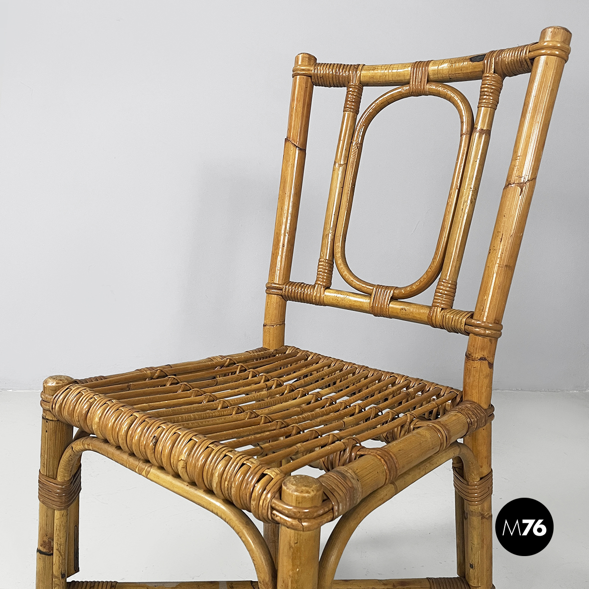 Set di quattro sedie interamente in rattan e bambù finemente intrecciato. Lo schienale presenta un decoro ovale. Seduta squadrata. Le zampe a sezione tonda sono unite al centro da una struttura a X.