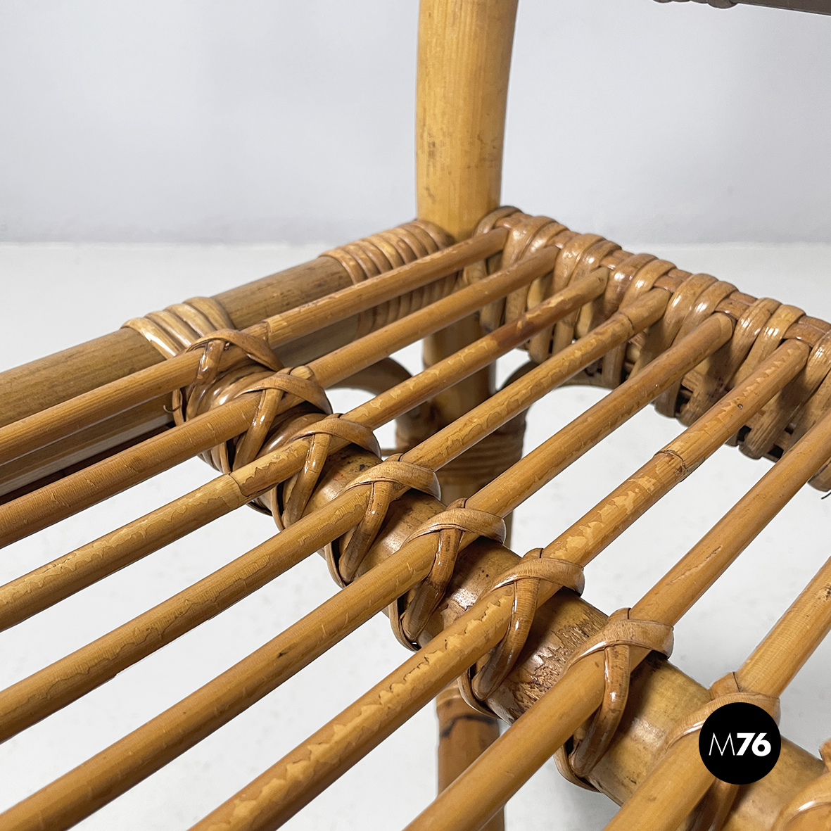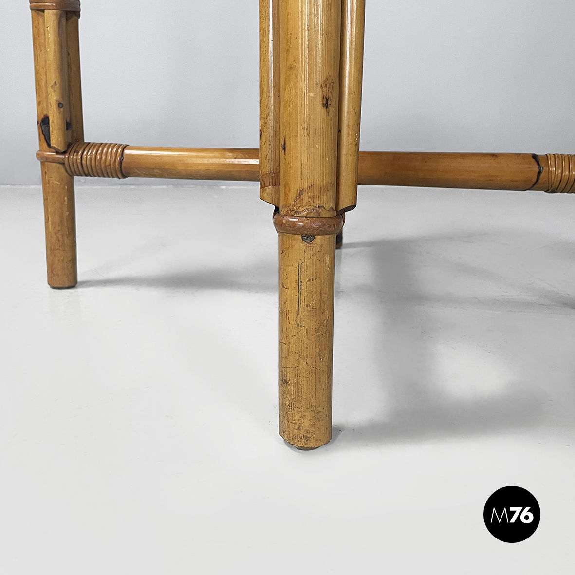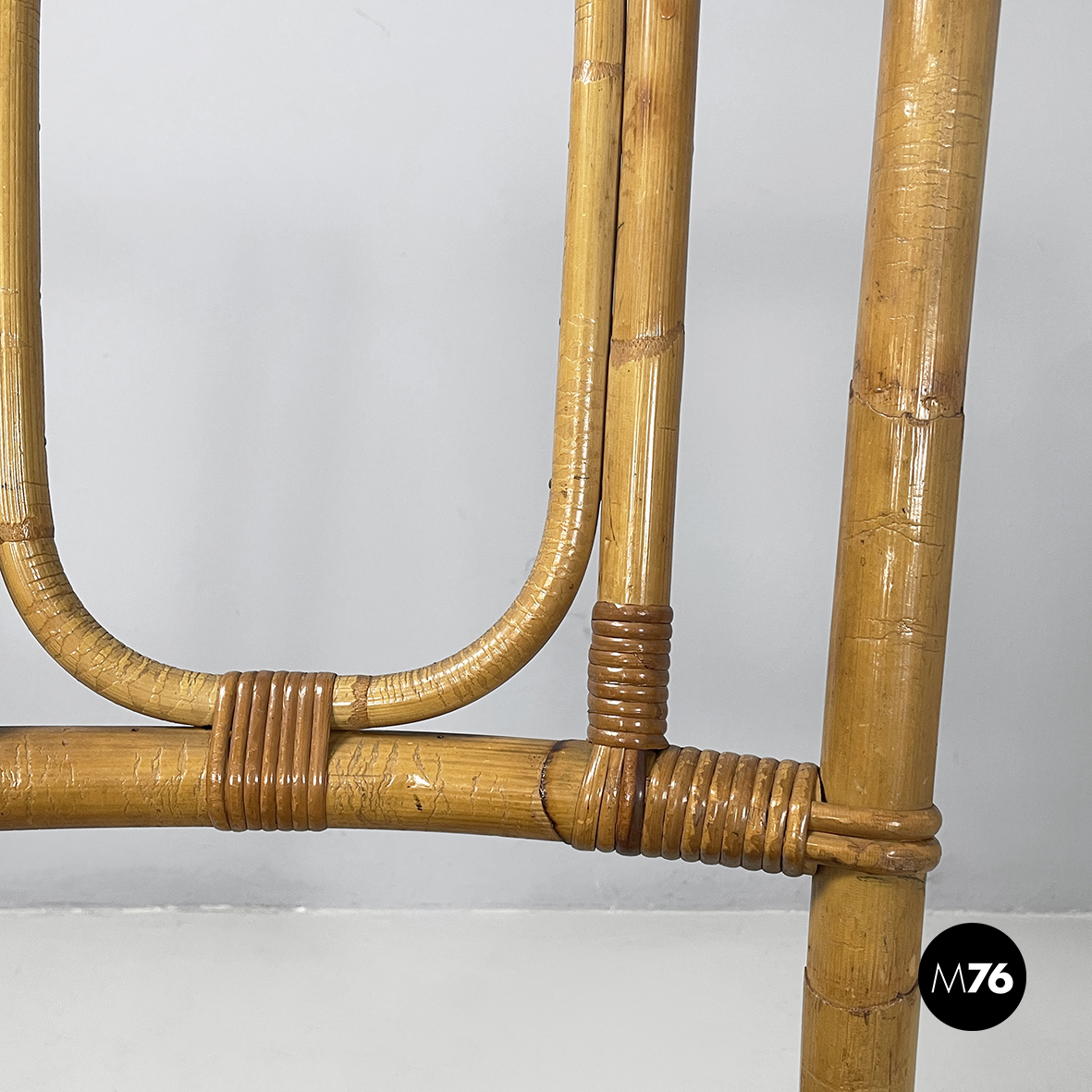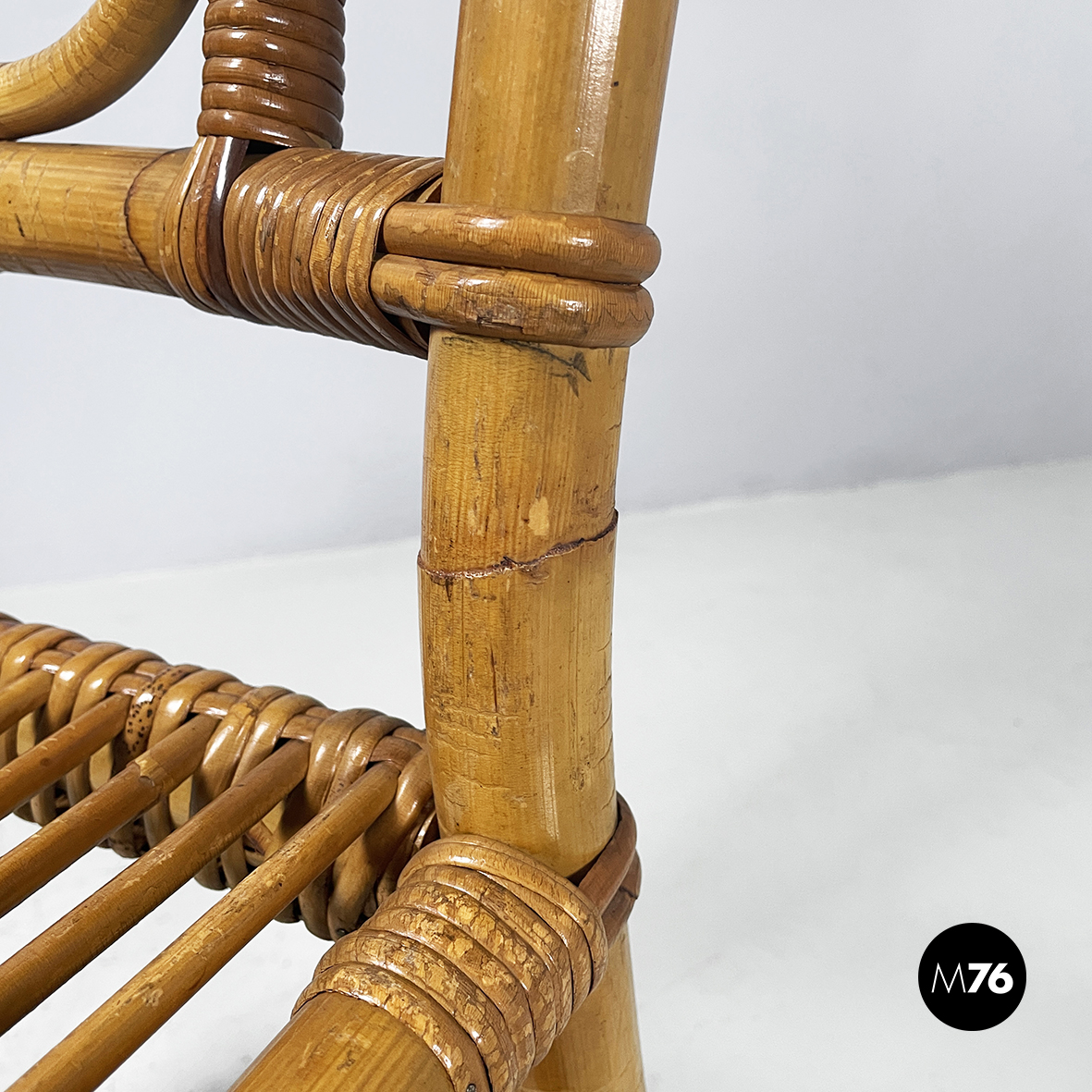 Set di quattro sedie interamente in rattan e bambù finemente intrecciato. Lo schienale presenta un decoro ovale. Seduta squadrata. Le zampe a sezione tonda sono unite al centro da una struttura a X.
