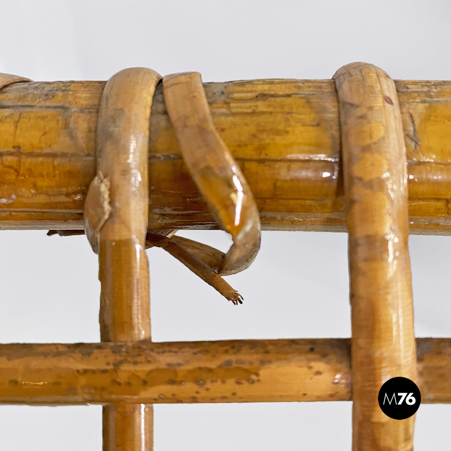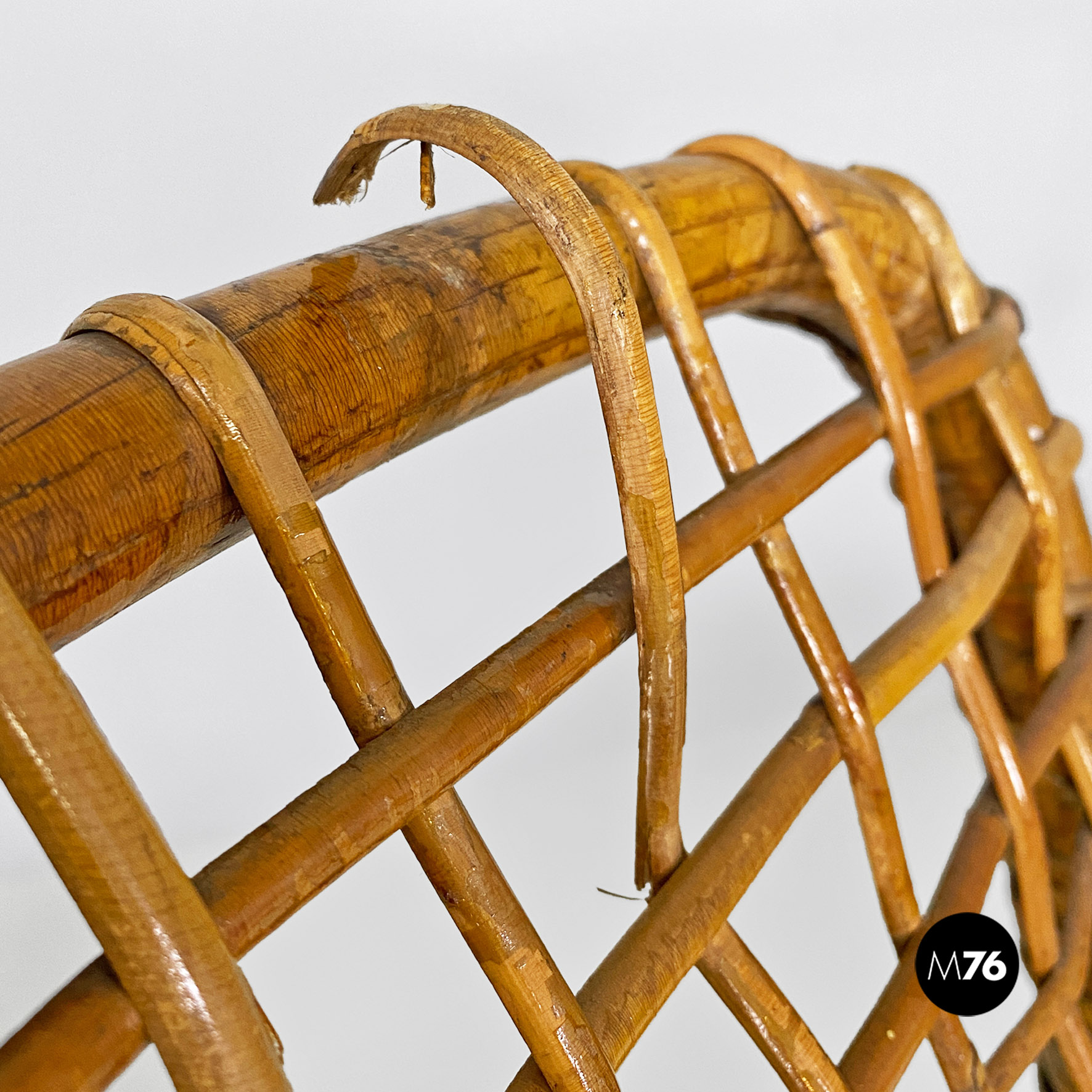 Set di sei sedie interamente in vimini, con seduta e schienale composti da rattan intrecciato a formare una griglia regolare e con la struttura portante e le gambe a sezione tonda.