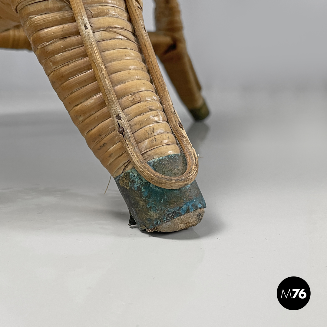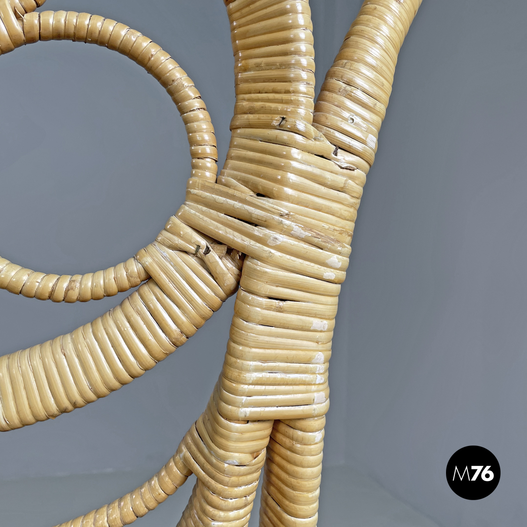 Set di quattro sedie in rattan con cuscino imbottito e rivestito di tessuto broccato sui toni del rosso, con bottoni. La struttura segue linee curve e tondeggianti, lo schienale è riccamente decorato con cerchi e intrecci, presenta due pomelli sferici che si sviluppano in alto e verso l’esterno. La seduta è circolare, le quattro gambe sono anch’esse intrecciate e decorate con motivi tondi e sono uniti sotto la seduta da una struttura incrociata. I piedini sono in metallo.
