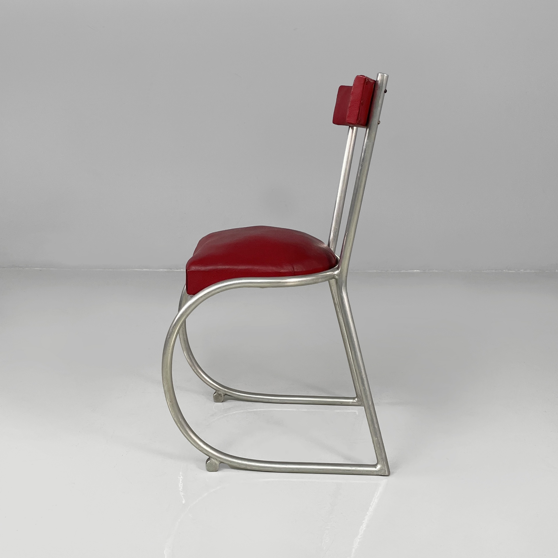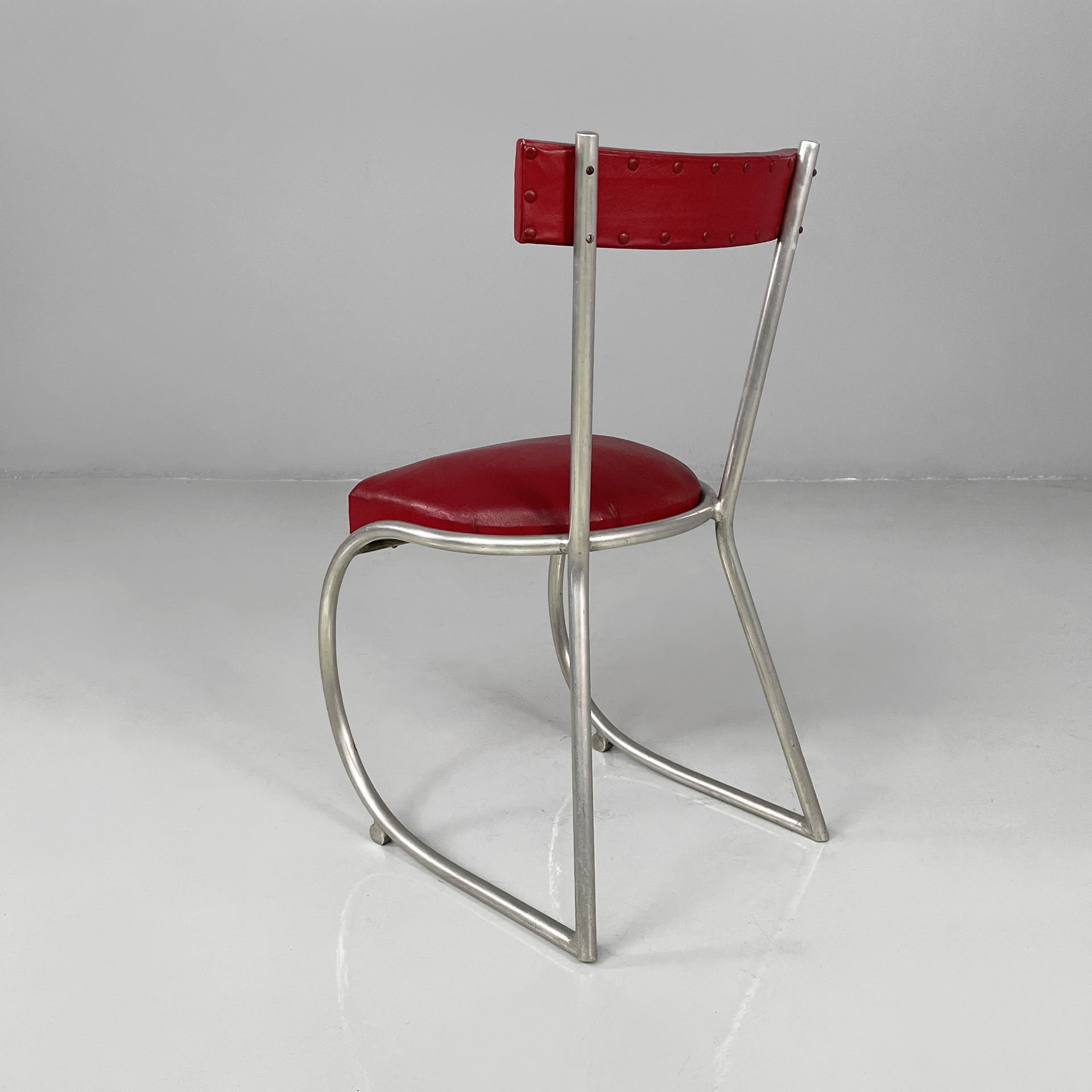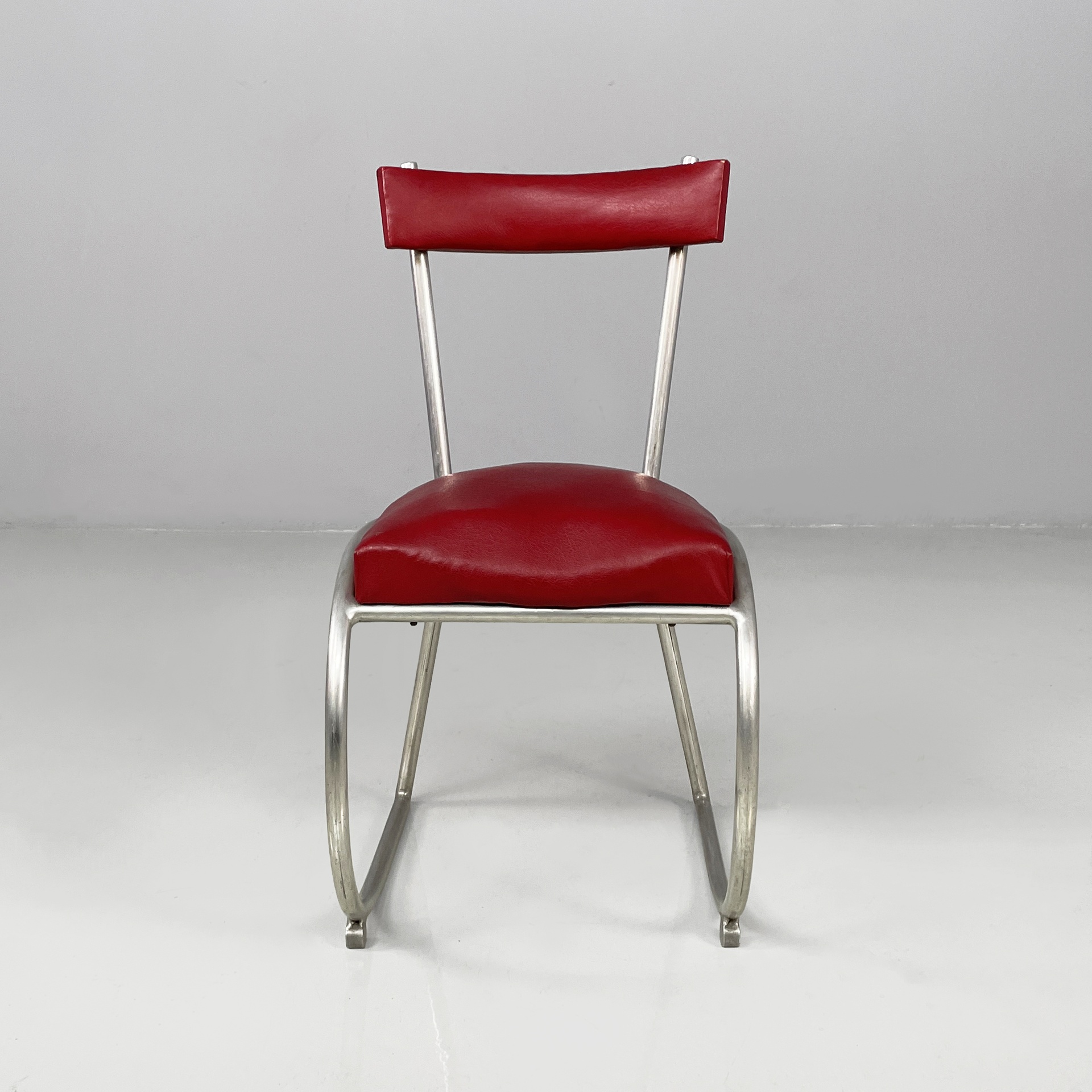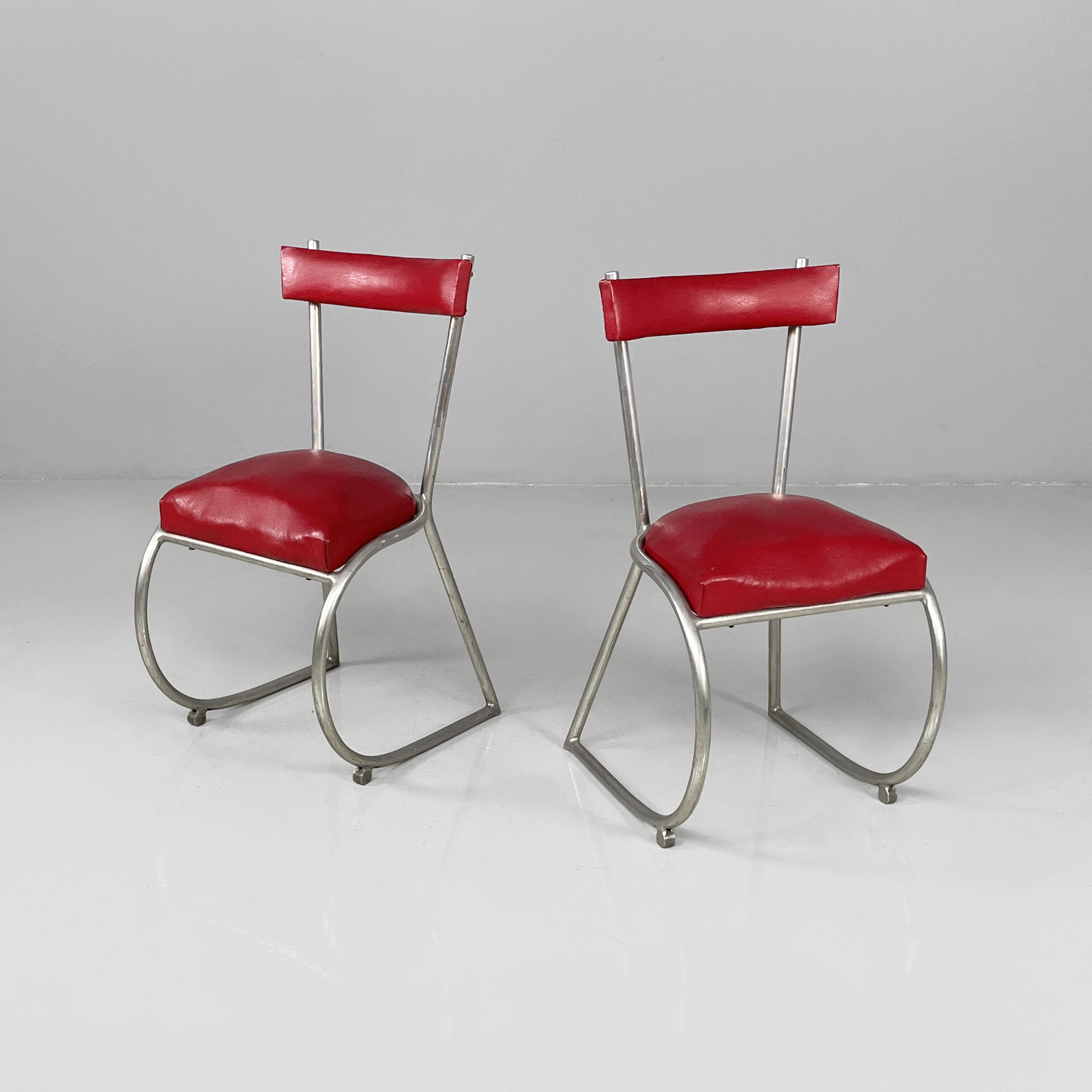 Coppia di sedie con seduta e schienale, imbottiti e rivestiti in finta pelle rossa. La struttura e le zampe sono in tubolare di metallo curvato. I piedini frontali sono a sezione tonda.
