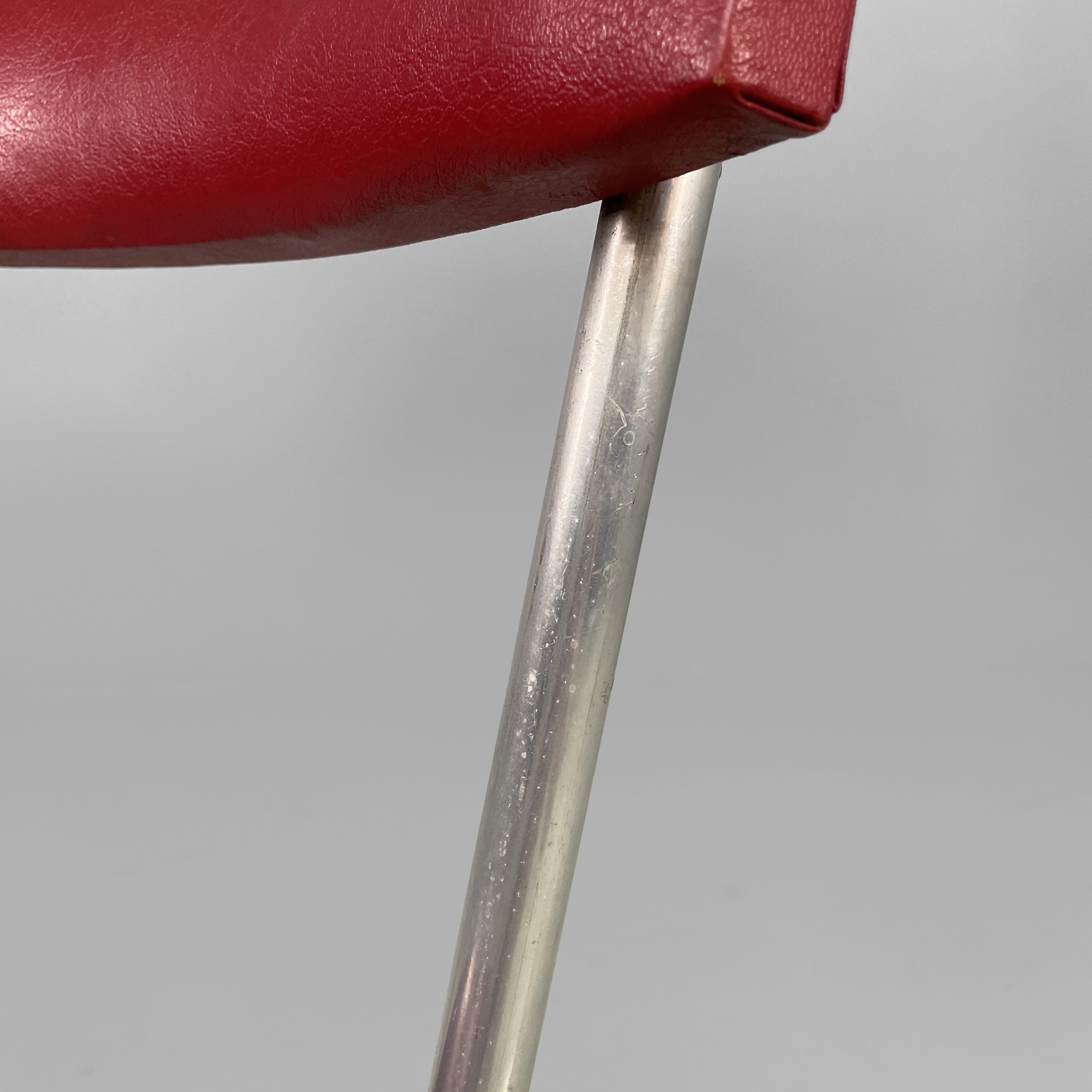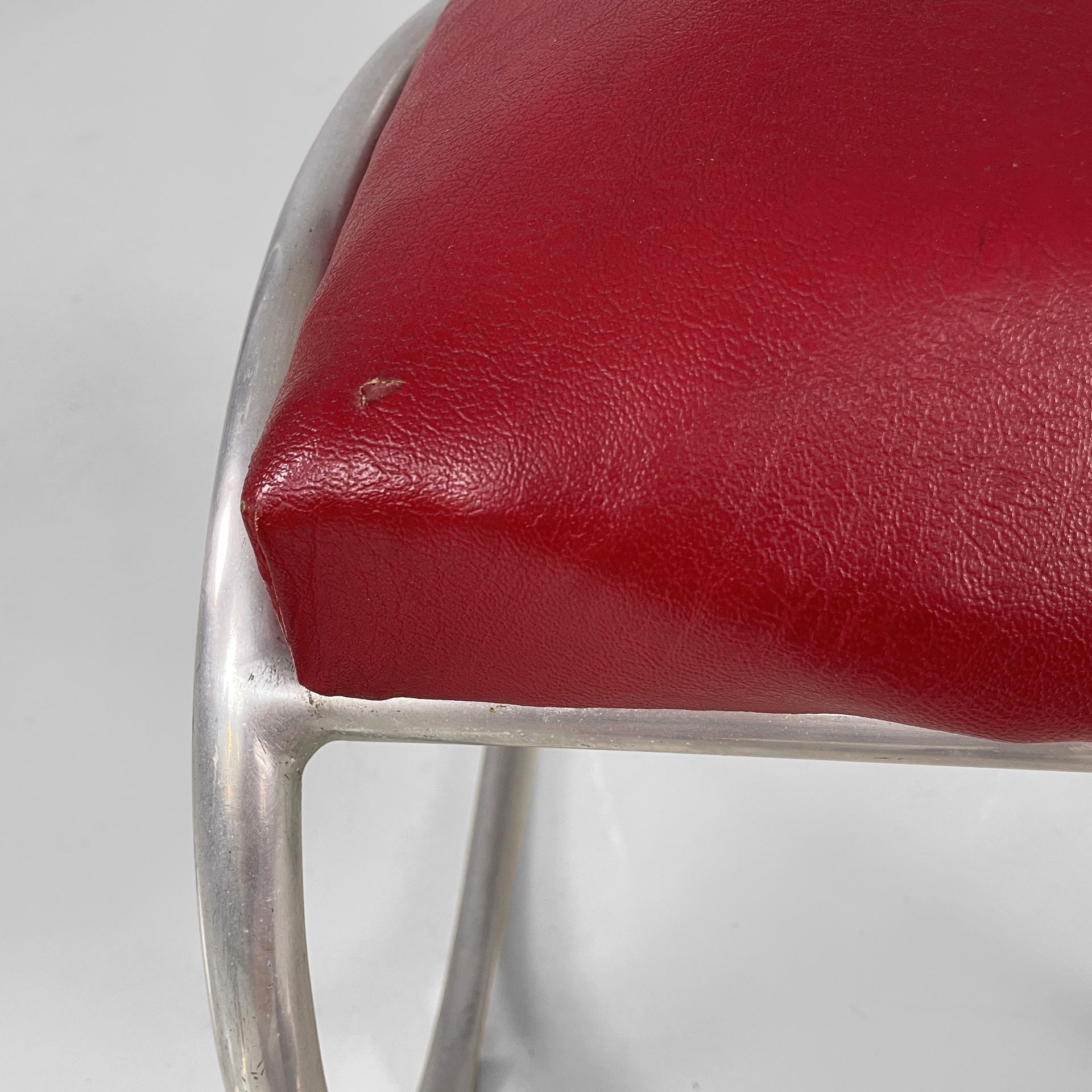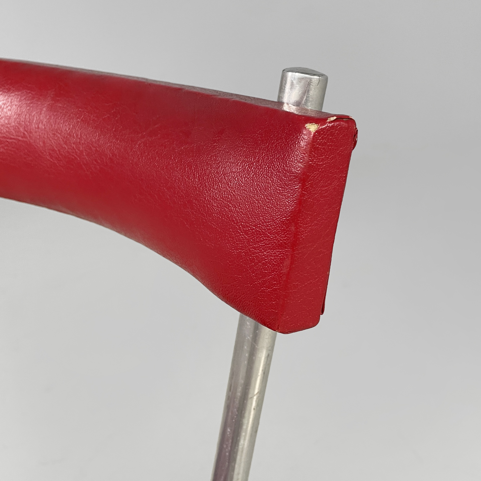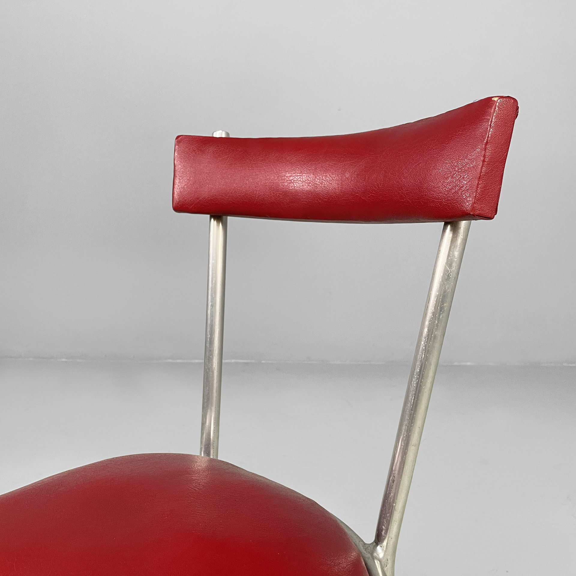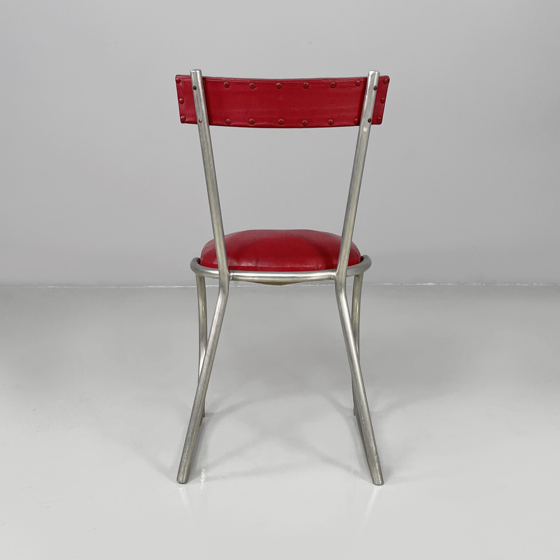 Coppia di sedie con seduta e schienale, imbottiti e rivestiti in finta pelle rossa. La struttura e le zampe sono in tubolare di metallo curvato. I piedini frontali sono a sezione tonda.