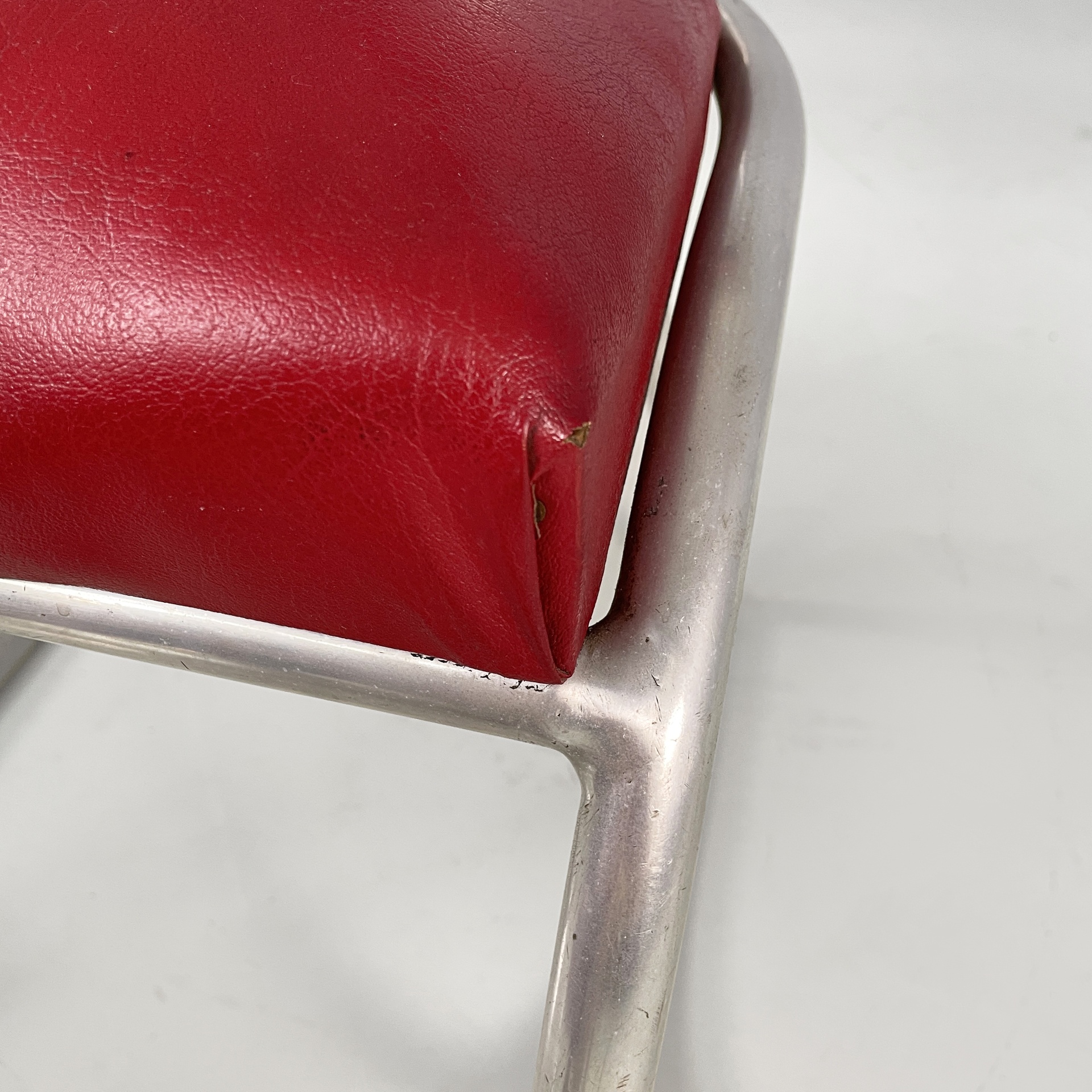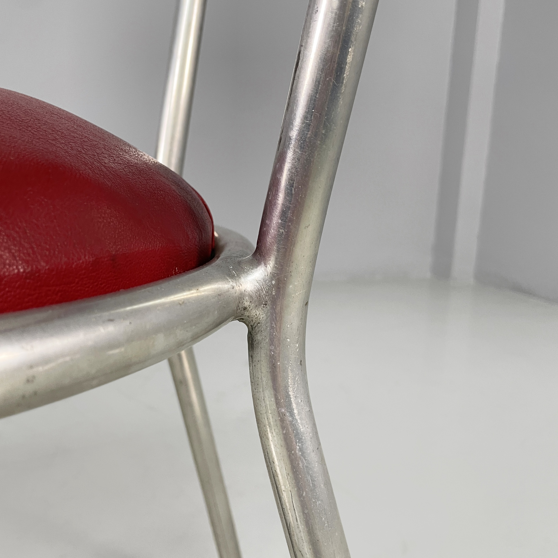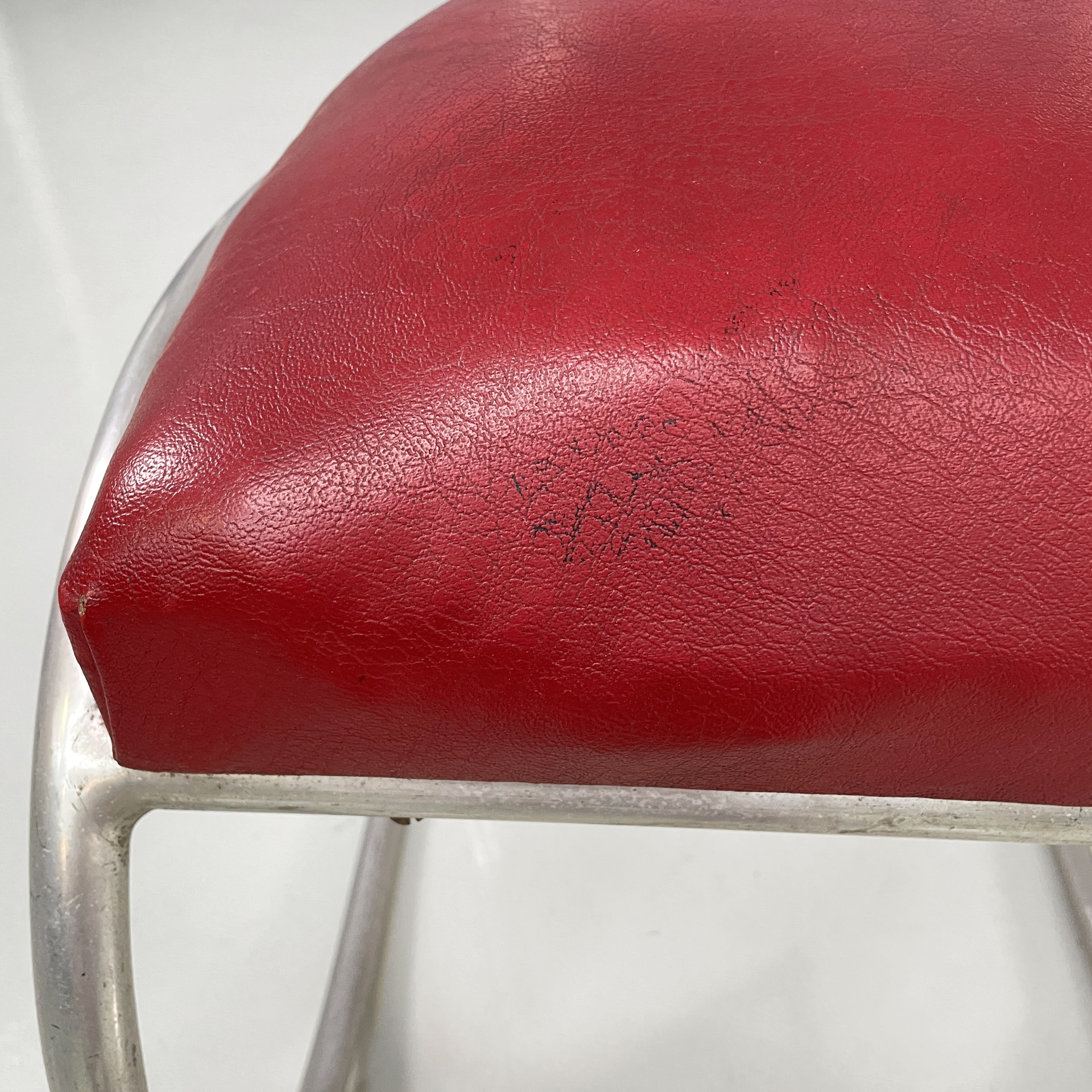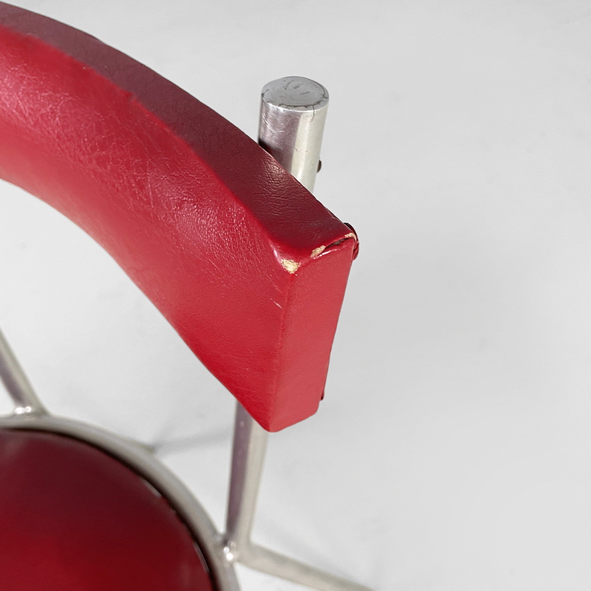 Coppia di sedie con seduta e schienale, imbottiti e rivestiti in finta pelle rossa. La struttura e le zampe sono in tubolare di metallo curvato. I piedini frontali sono a sezione tonda.