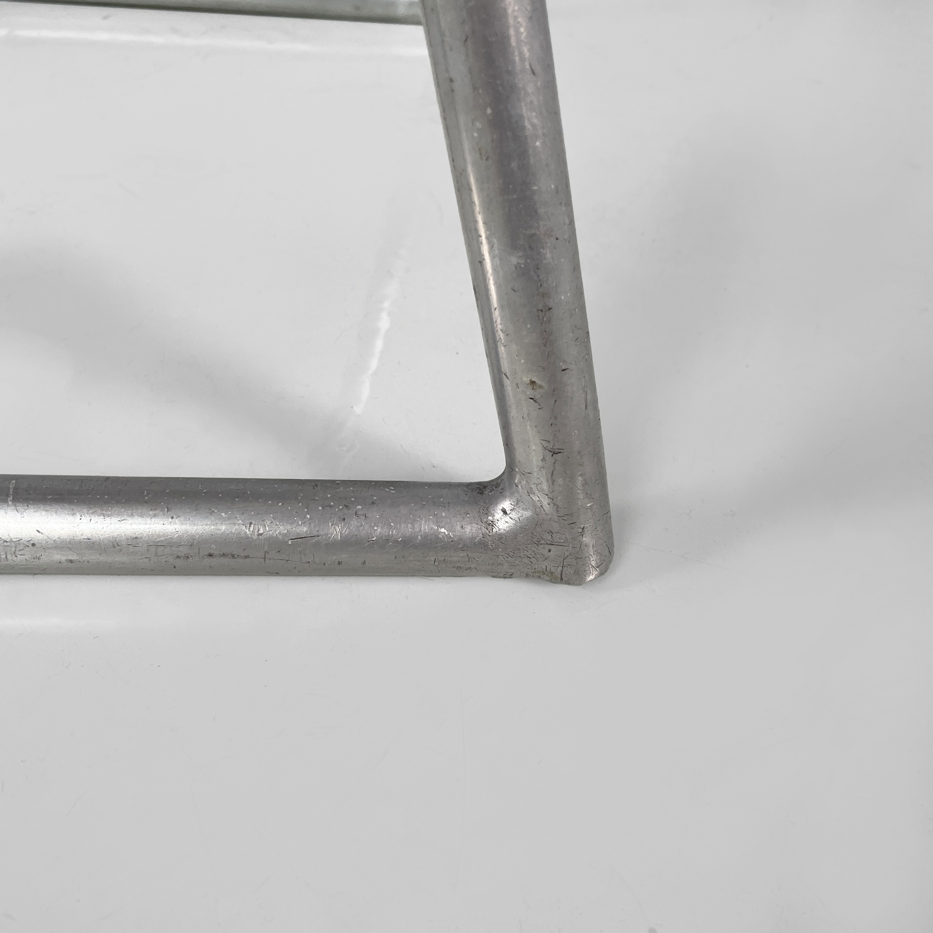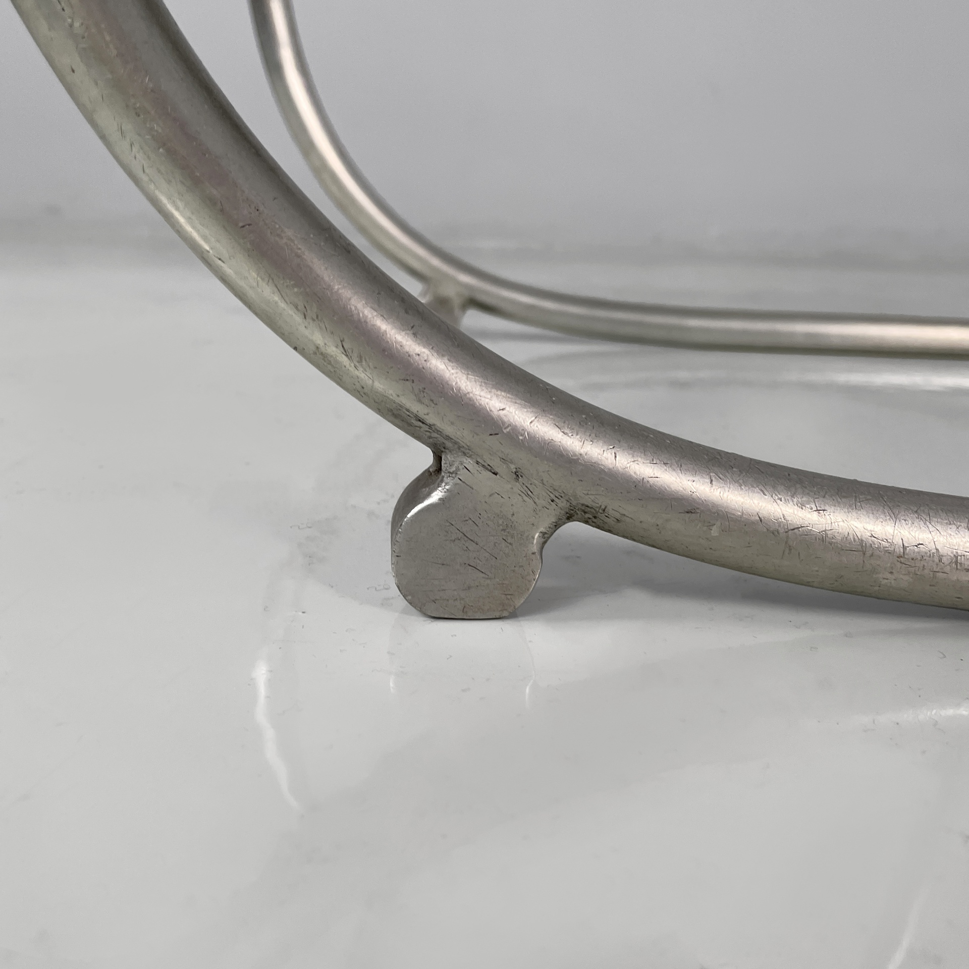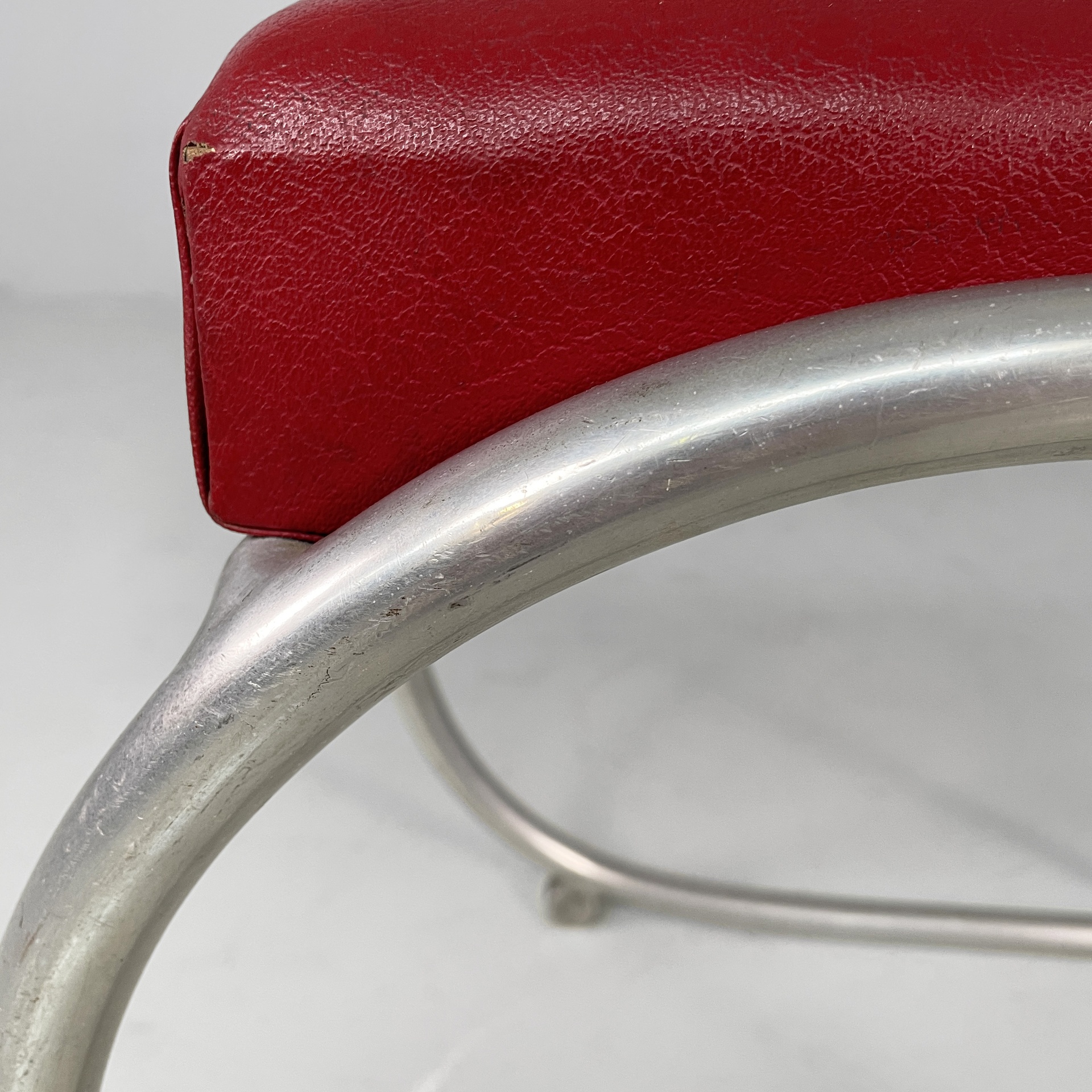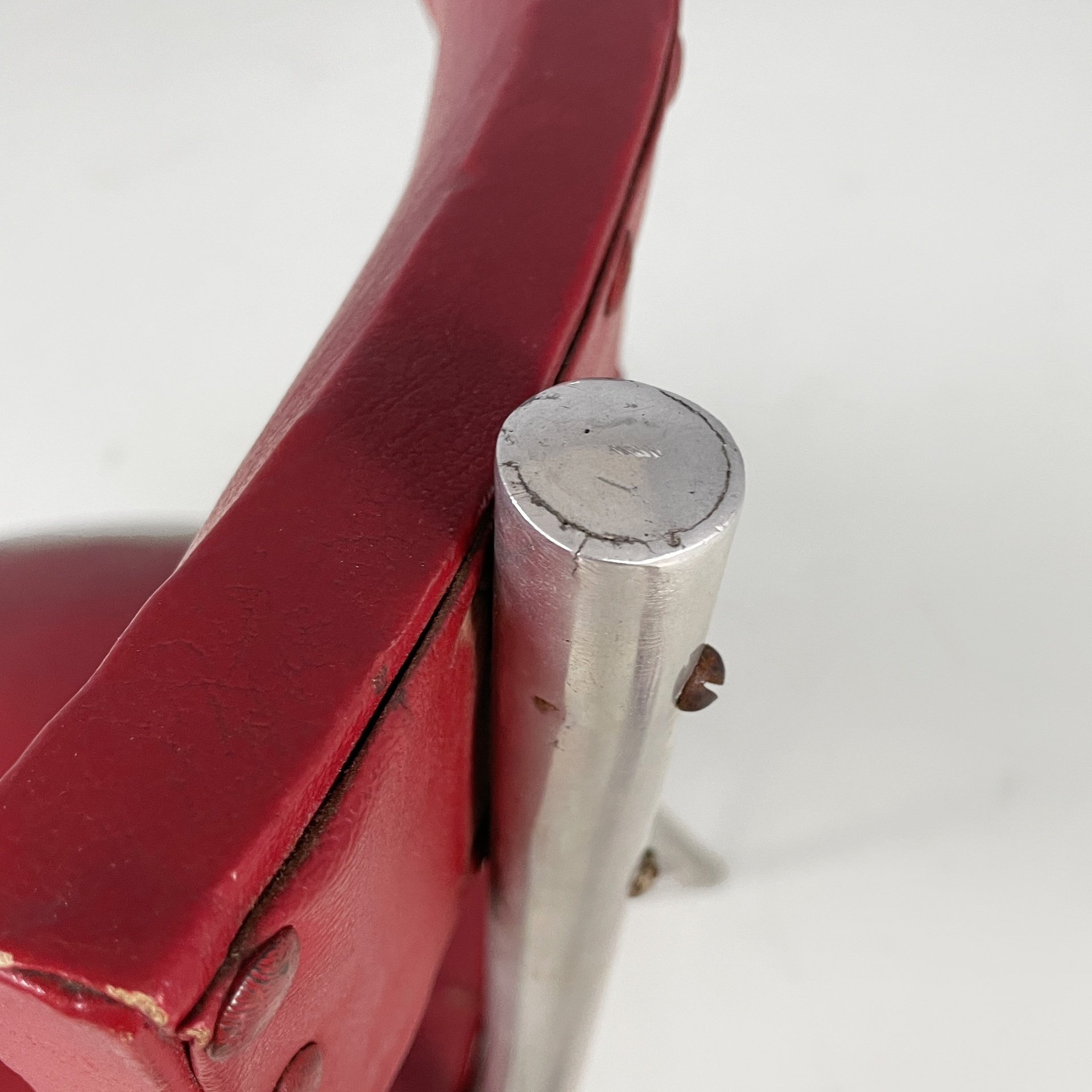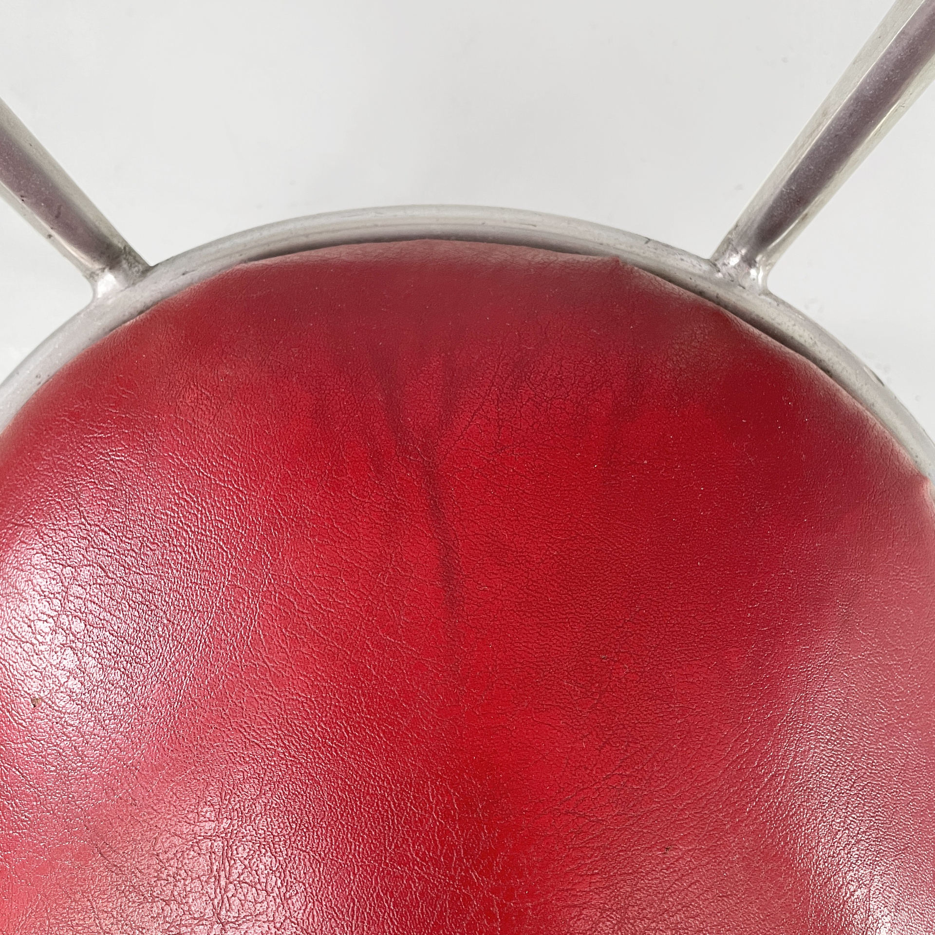 Coppia di sedie con seduta e schienale, imbottiti e rivestiti in finta pelle rossa. La struttura e le zampe sono in tubolare di metallo curvato. I piedini frontali sono a sezione tonda.