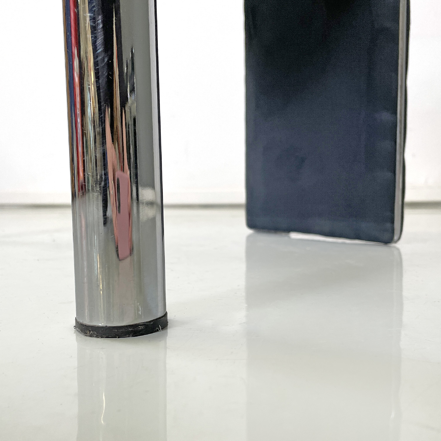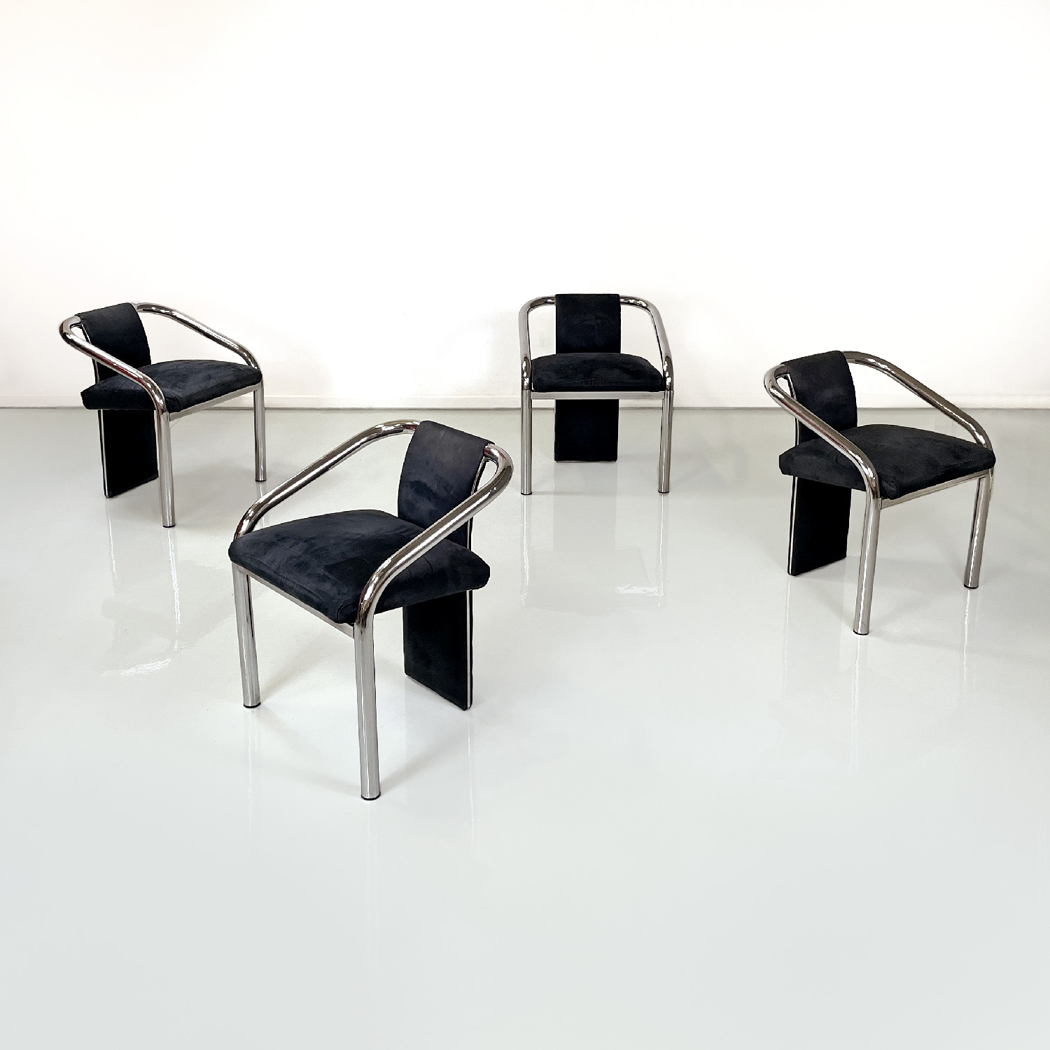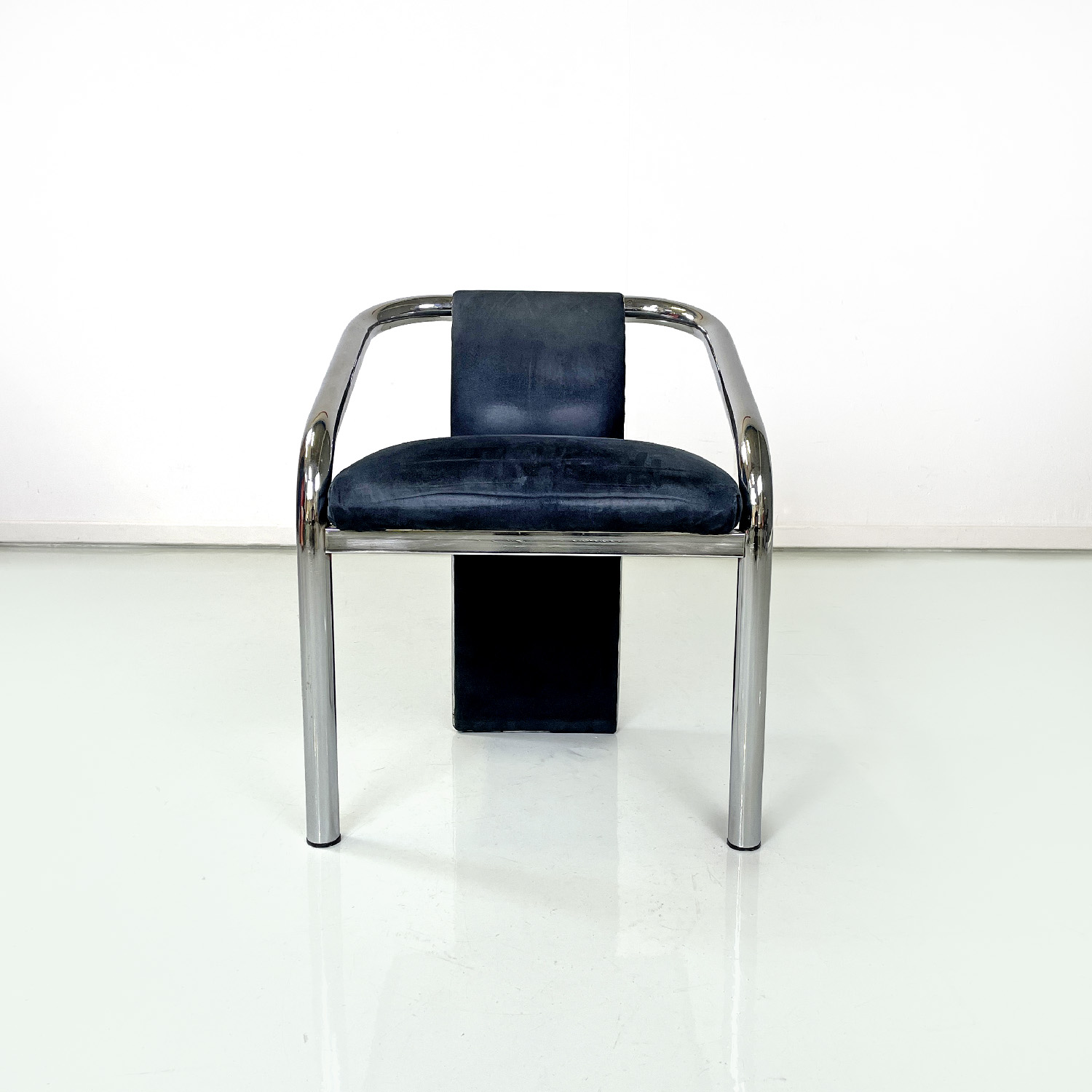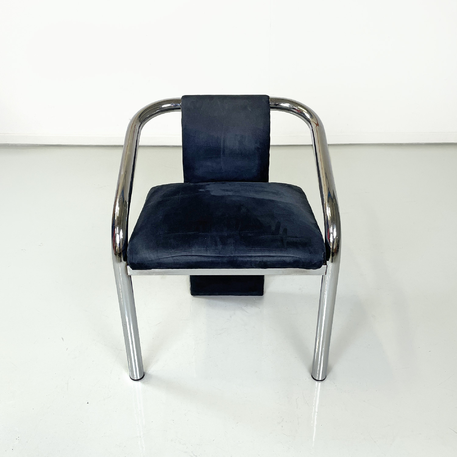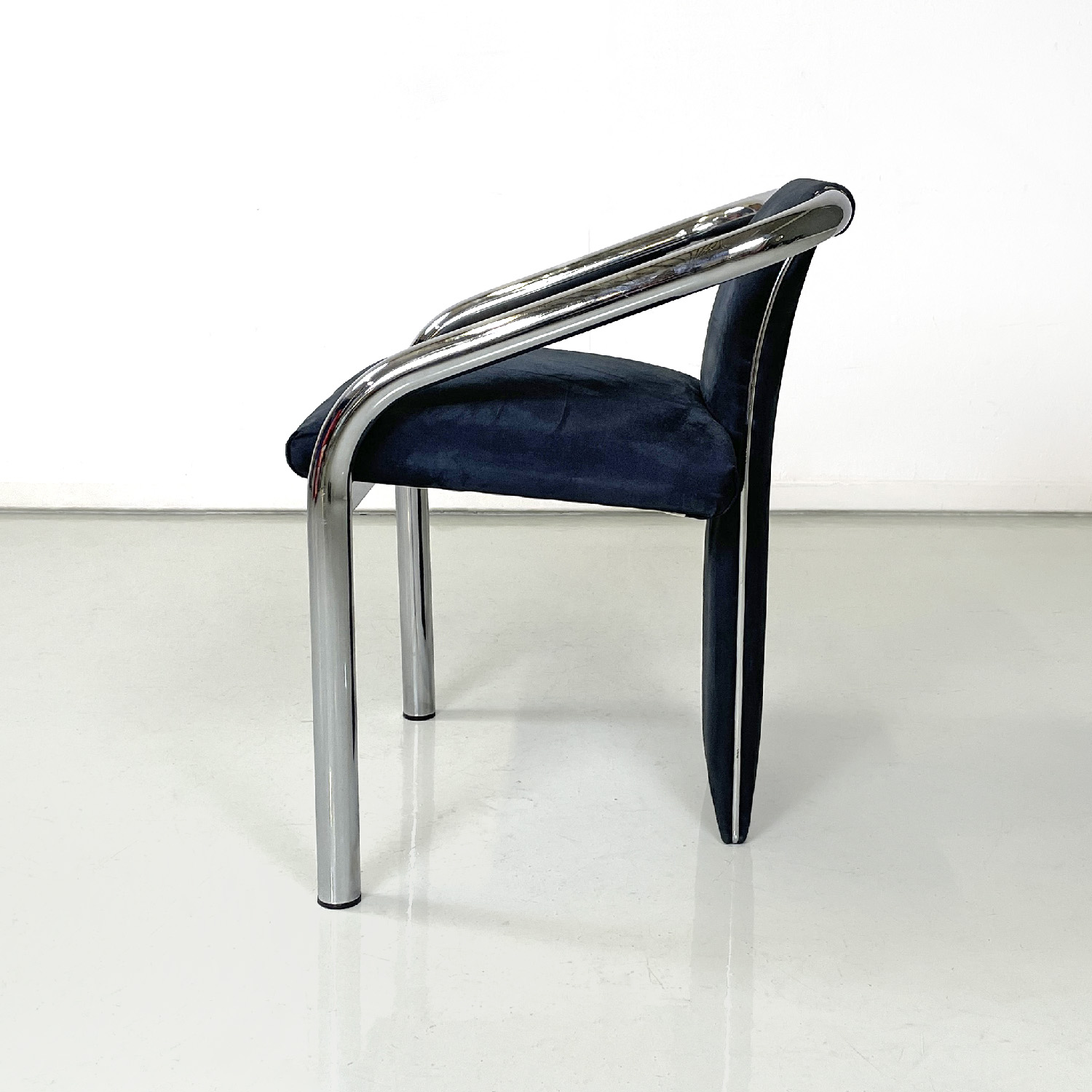 Set di quattro sedie con seduta rettangolare. Lo schienale si allunga fino all’appoggio a terra, ed è rivestito di velluto blu scuro profondo come la seduta. La struttura è in tubolare di acciaio cromato, che partendo dallo schienale si curva a creare i braccioli e le gambe frontali.
