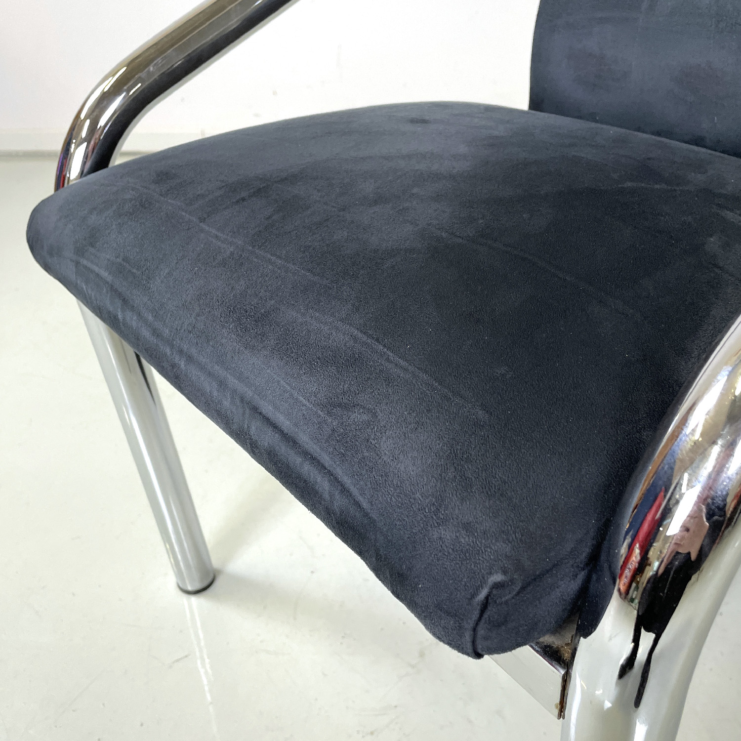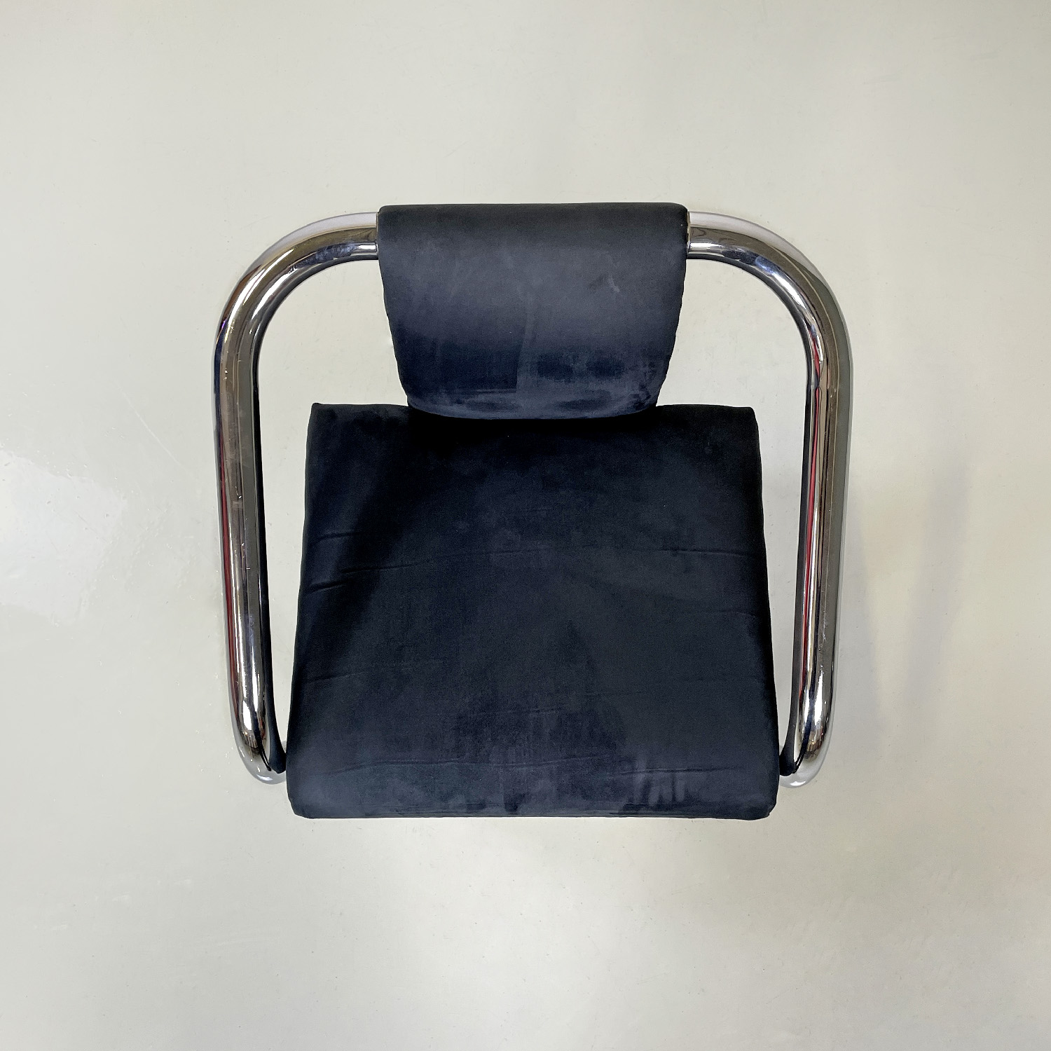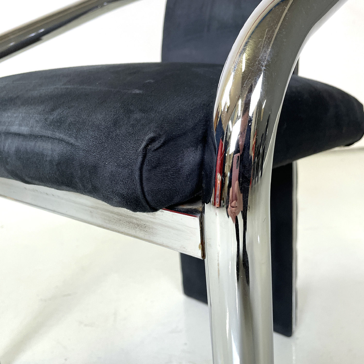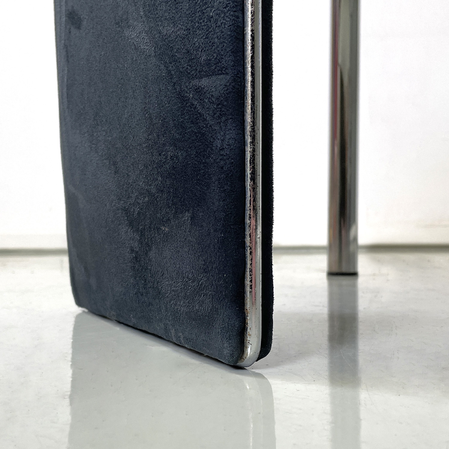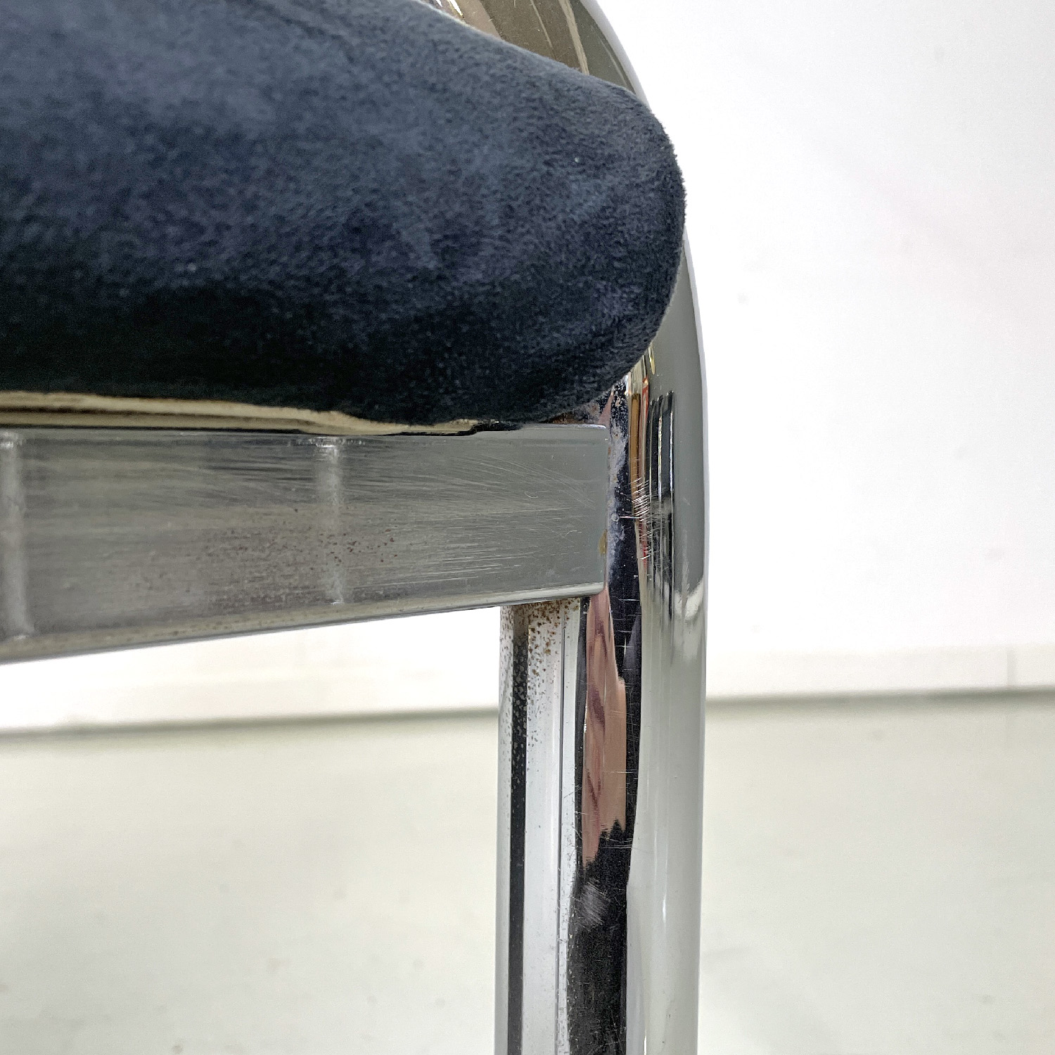 Set di quattro sedie con seduta rettangolare. Lo schienale si allunga fino all’appoggio a terra, ed è rivestito di velluto blu scuro profondo come la seduta. La struttura è in tubolare di acciaio cromato, che partendo dallo schienale si curva a creare i braccioli e le gambe frontali.