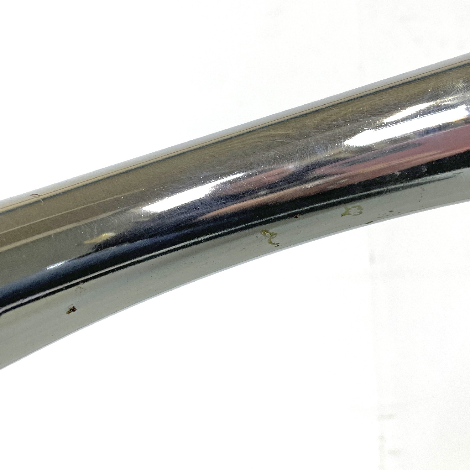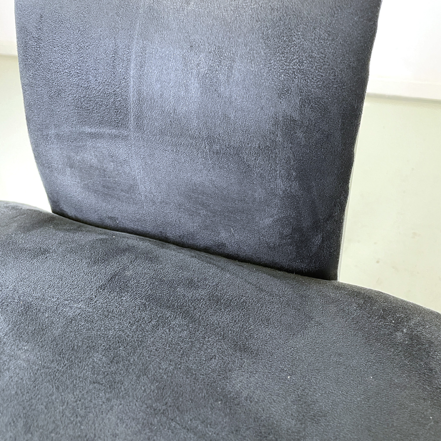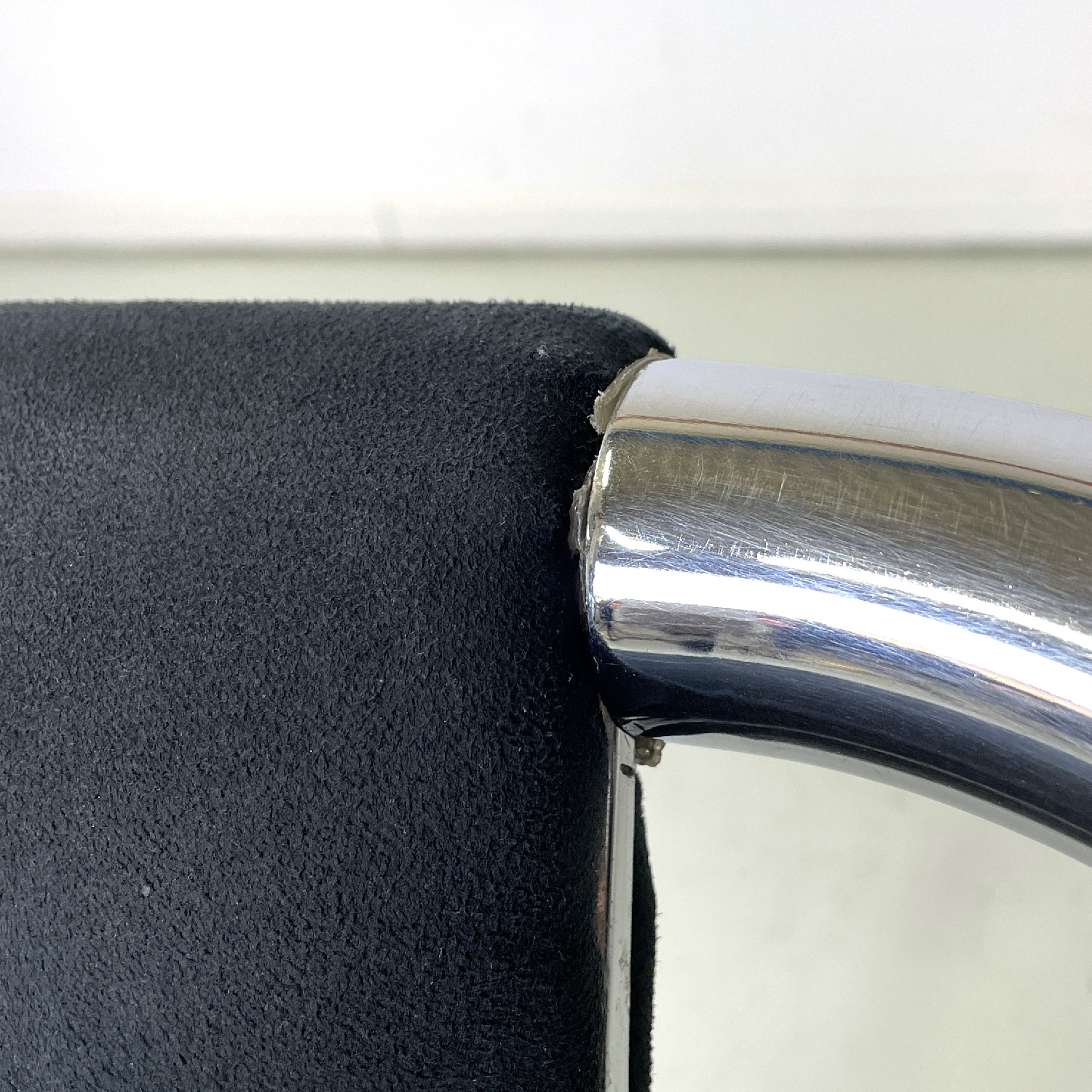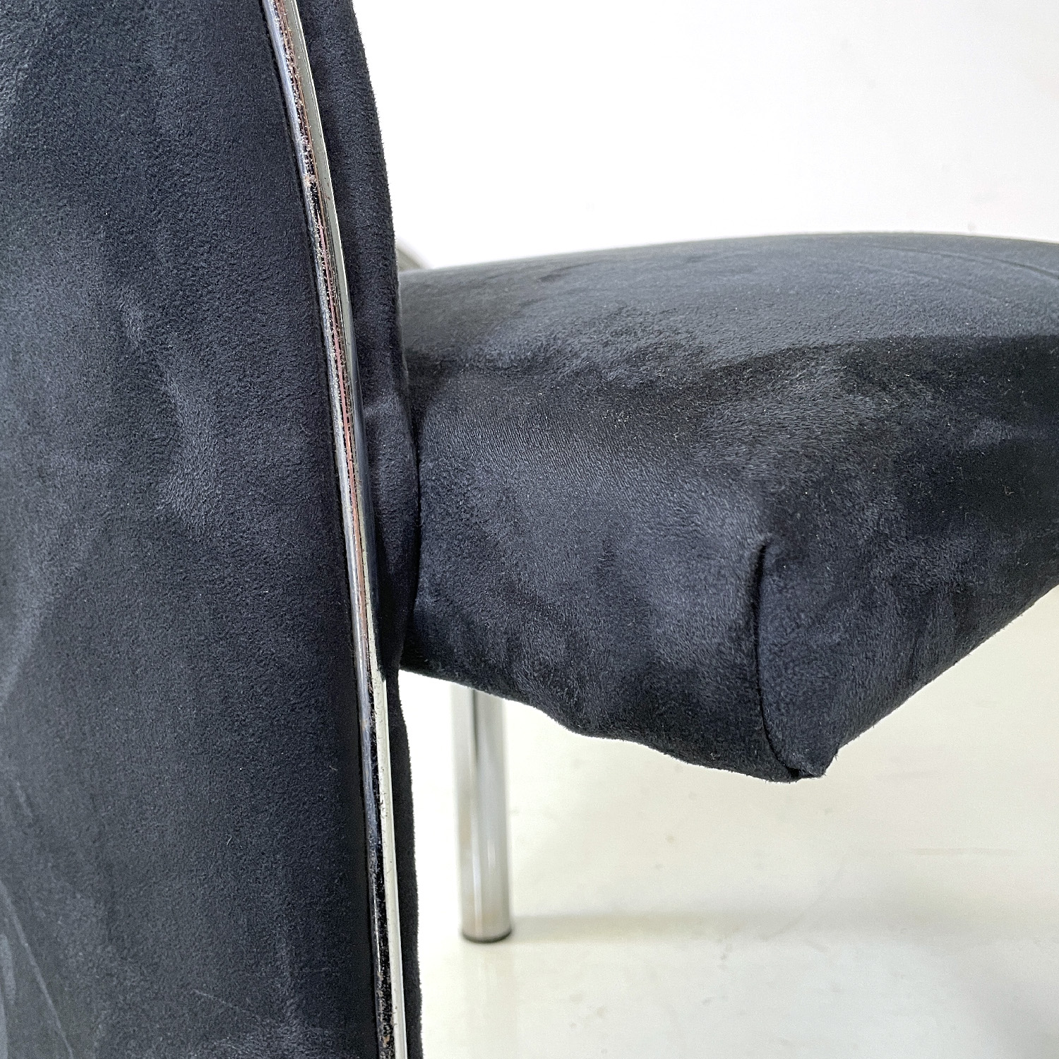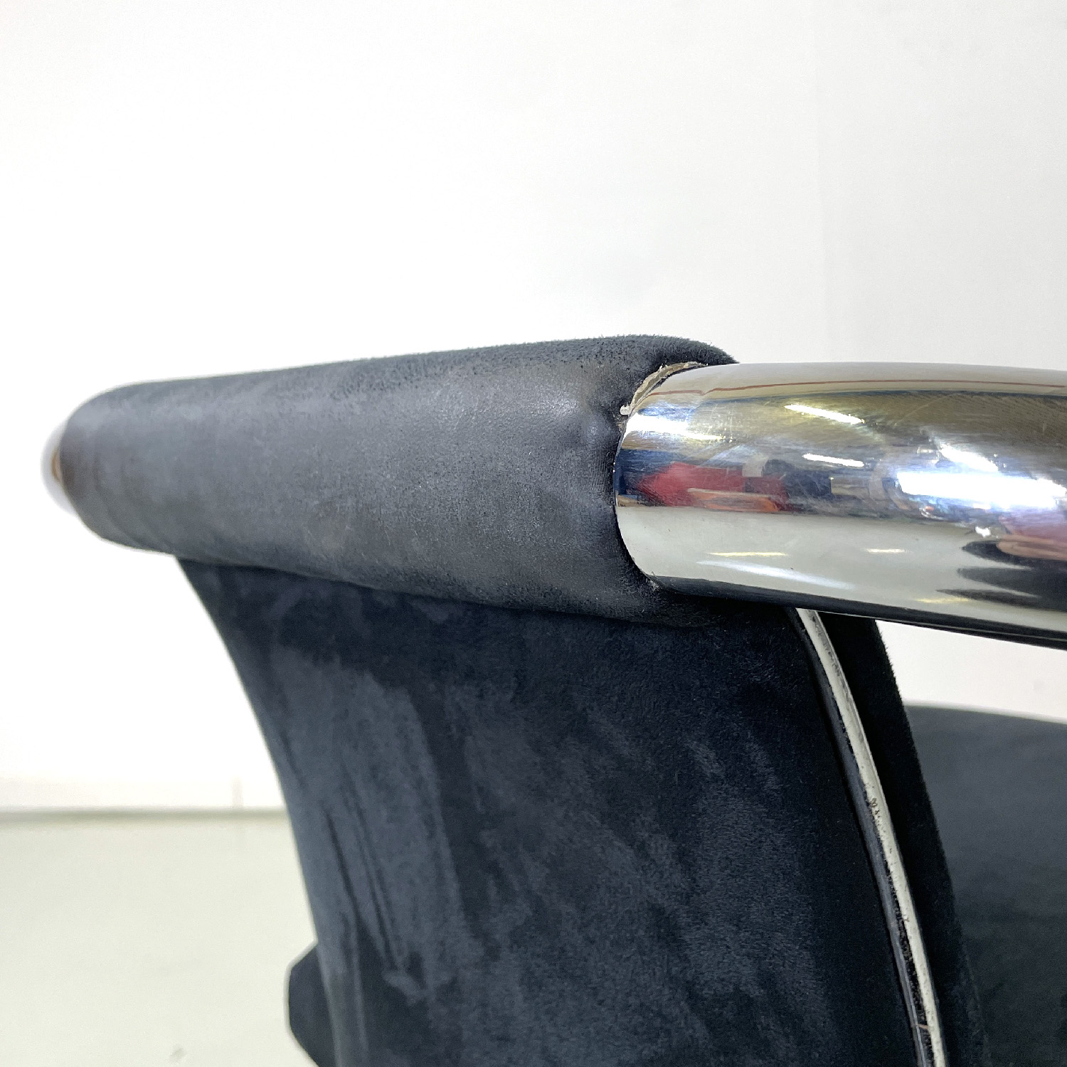 Set di quattro sedie con seduta rettangolare. Lo schienale si allunga fino all’appoggio a terra, ed è rivestito di velluto blu scuro profondo come la seduta. La struttura è in tubolare di acciaio cromato, che partendo dallo schienale si curva a creare i braccioli e le gambe frontali.